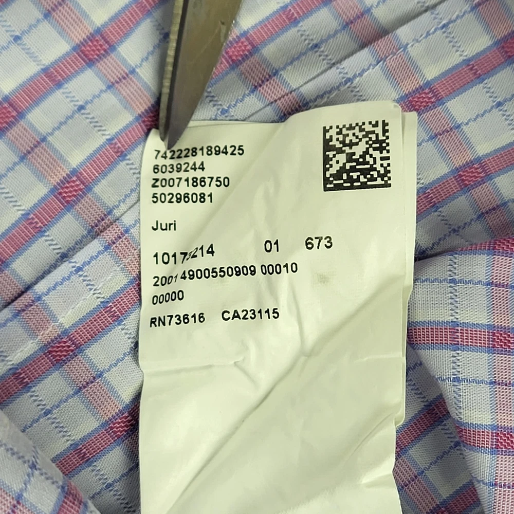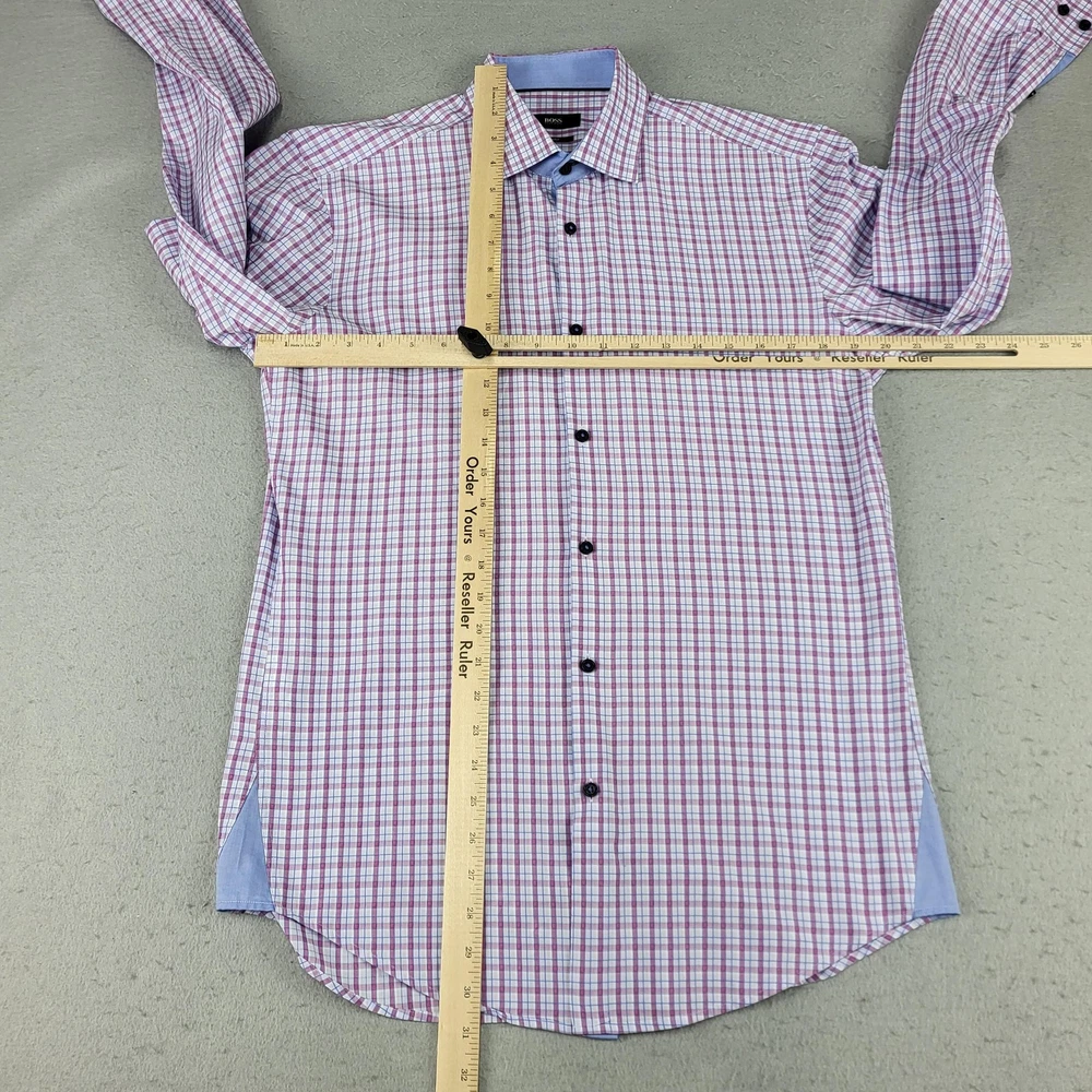 Brand: Hugo Boss (BOSS) Style: Juri long-sleeve button front woven dress shirt in a pink and blue check pattern with contrast light blue inner collar and cuffs. Fit: Slim Fit Gender: Mens Size on tag: 39 / US 15.5 neck Material: 100% cotton including trim (per tag). Color: White base with pink and blue check pattern, light blue contrast details. Made in Vietnam. Details: Spread collar, button front closure, adjustable barrel cuffs with contrast lining, curved hem, includes two spare buttons on original care tag. UPC: 742228189425 Additional codes on tag: 6039244, Z007186750, 50296081, 1017214 01 673, 20074900550909 00010 00000, RN 73616, CA 23115. Disclaimer: Different sources of lighting can change your perspective on the color of the clothing Disclaimer: All clothing is measured in a resting position lying flat. All items have been cleaned per eBay standards & policies. We ship items daily via USPS Ground Advantage or Priority Mail with a tracking number for confirmation, so expect a quick delivery. We also offer free 30-day returns!! Please feel free to reach out anytime with any questions you may have. Thank you for shopping at Curiosity Corner RVA!!! Follow my store for greater discounts seller:kevredfor_0