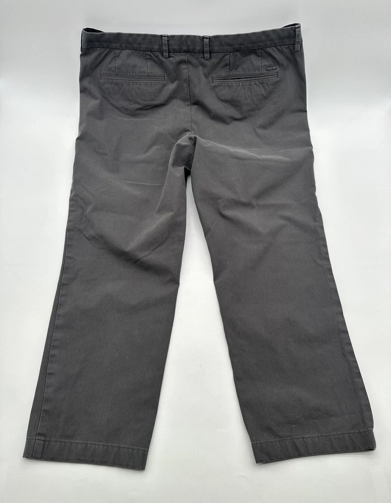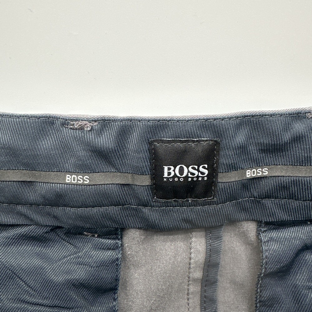 These are Boss Hugo Boss classic pants for men in size 38, featuring a solid gray color with a Chino style. They have a zip, button, and hook & eye closure with pockets and a logo accent. Made of Elastane Polyamide and Cotton materials, they have a straight leg and a 26-inch inseam. These pants are suitable for various occasions such as travel, parties, formal events, and business settings. The brand is Hugo Boss and the fit is classic. Check pictures for flaws and measurements