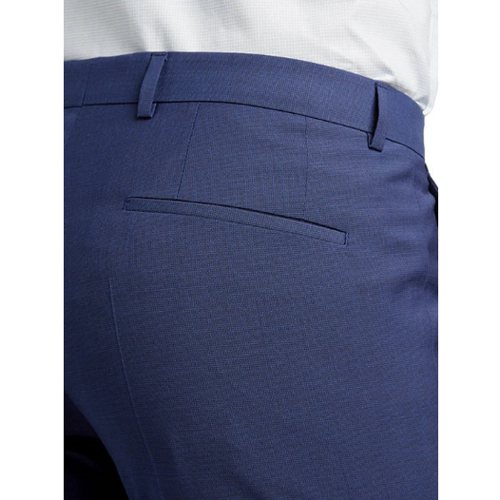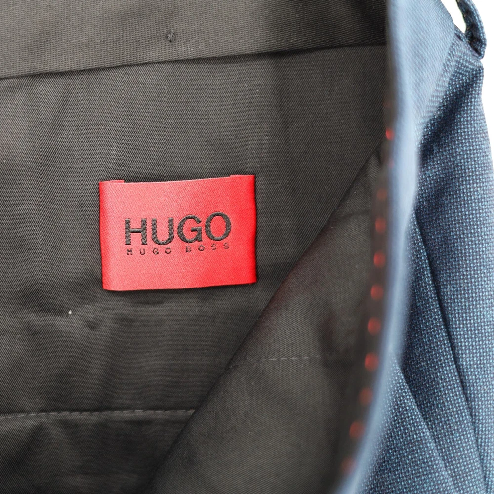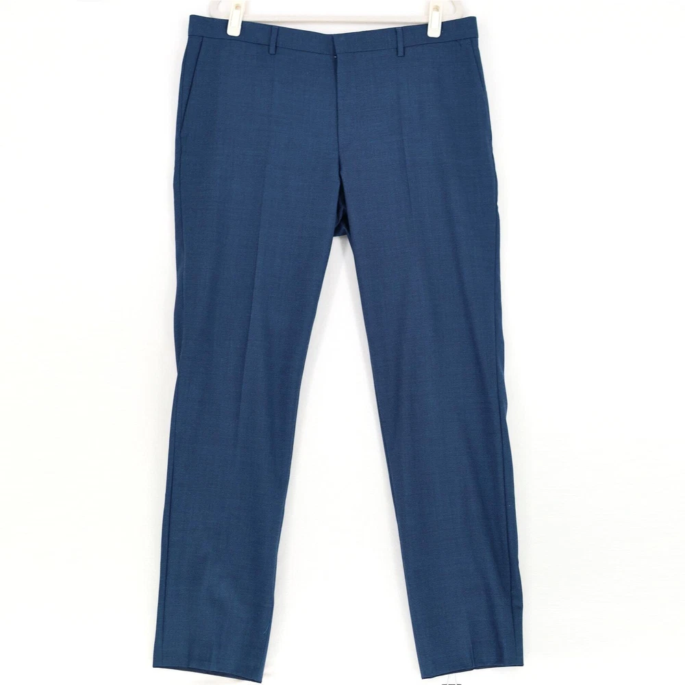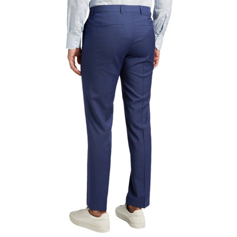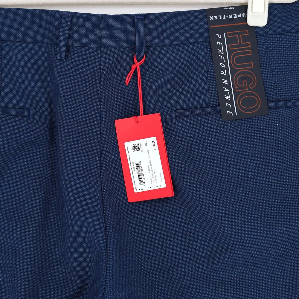 Hugo Boss Men's High Blue Wool Getlin Super Flex Slim Fit Dress Pants Size 40R New with tags MRSP $198 Slim-fit suit pants Two side slant pockets / Two back welt pockets Partially lined Zip fly with hook closure Belt loops Flat front Finished hem No cuff Shell: 76% virgin wool / 21% polyester / 3% elastane Lining: viscose Dry clean Inseam 33" Waist flat lay 20"
