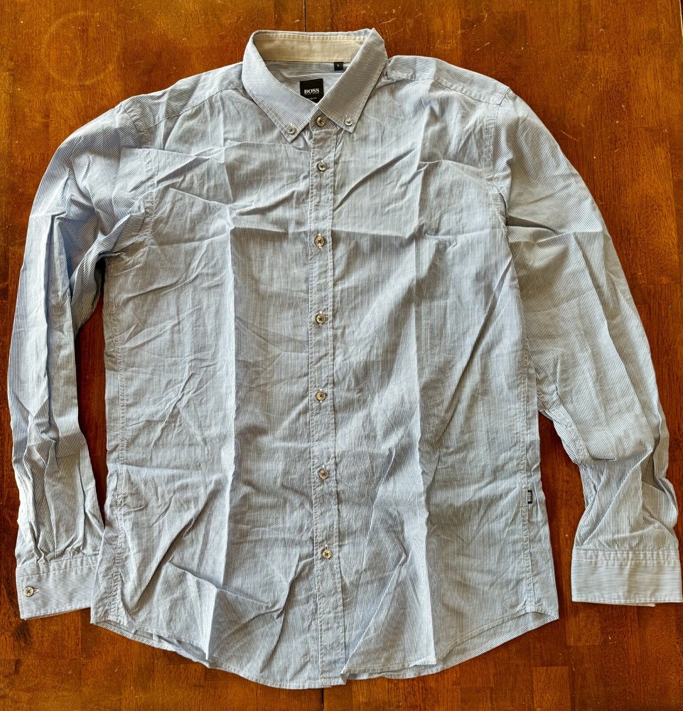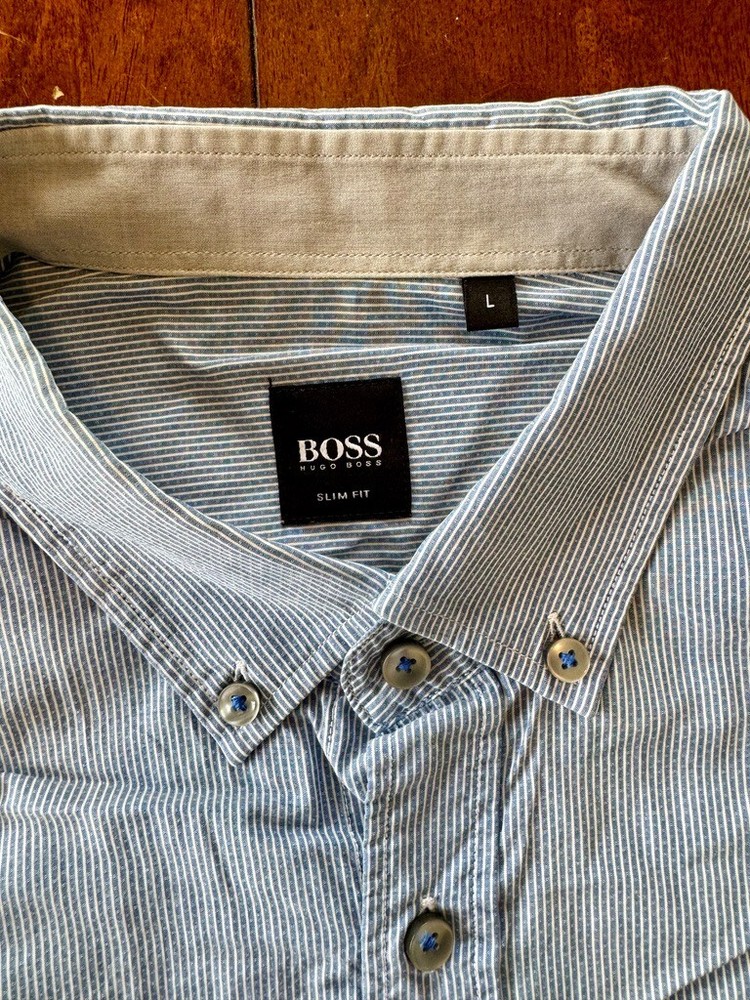 Introducing this stylish Hugo Boss men's long-sleeved button down shirt, meticulously crafted from 100% cotton fabric in a refreshing blue hue with fine white stripes. Designed with a slim fit silhouette, this shirt offers a clean profile that effortlessly combines style with comfort, making it perfect for both formal and informal occasions. Features: Brand: Hugo Boss Fabric: 100% Cotton Color: Light Blue with fine white stripes Size: Large Condition: Great Condition. Please refer to the provided pictures for more details on the condition of the item. Fit: Slim Fit Collar: Button Down Collar Sleeve: Long Sleeve Shipping: Ships only to the USA. For international shipping inquiries, please contact us. Returns: Please note that returns are not accepted. Original Price: $158.00 USD Check Out Our Other Items! Be sure to explore our eBay store for more high-quality clothing and accessories to elevate your style. Please Note: Colors may vary slightly due to lighting and monitor settings. Feel free to contact us with any questions or for additional photos. Thank you for considering this Hugo Boss shirt! Elevate your wardrobe with this versatile and sophisticated piece.