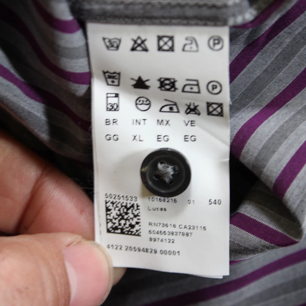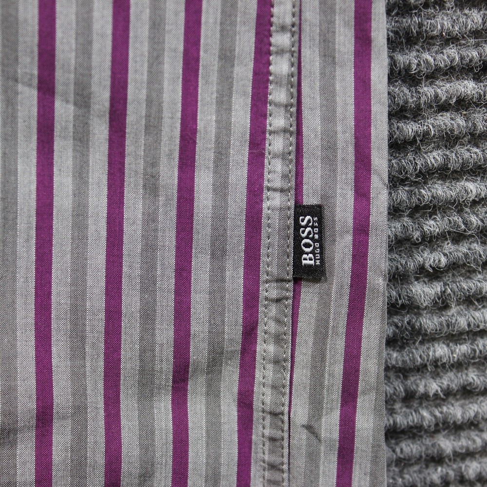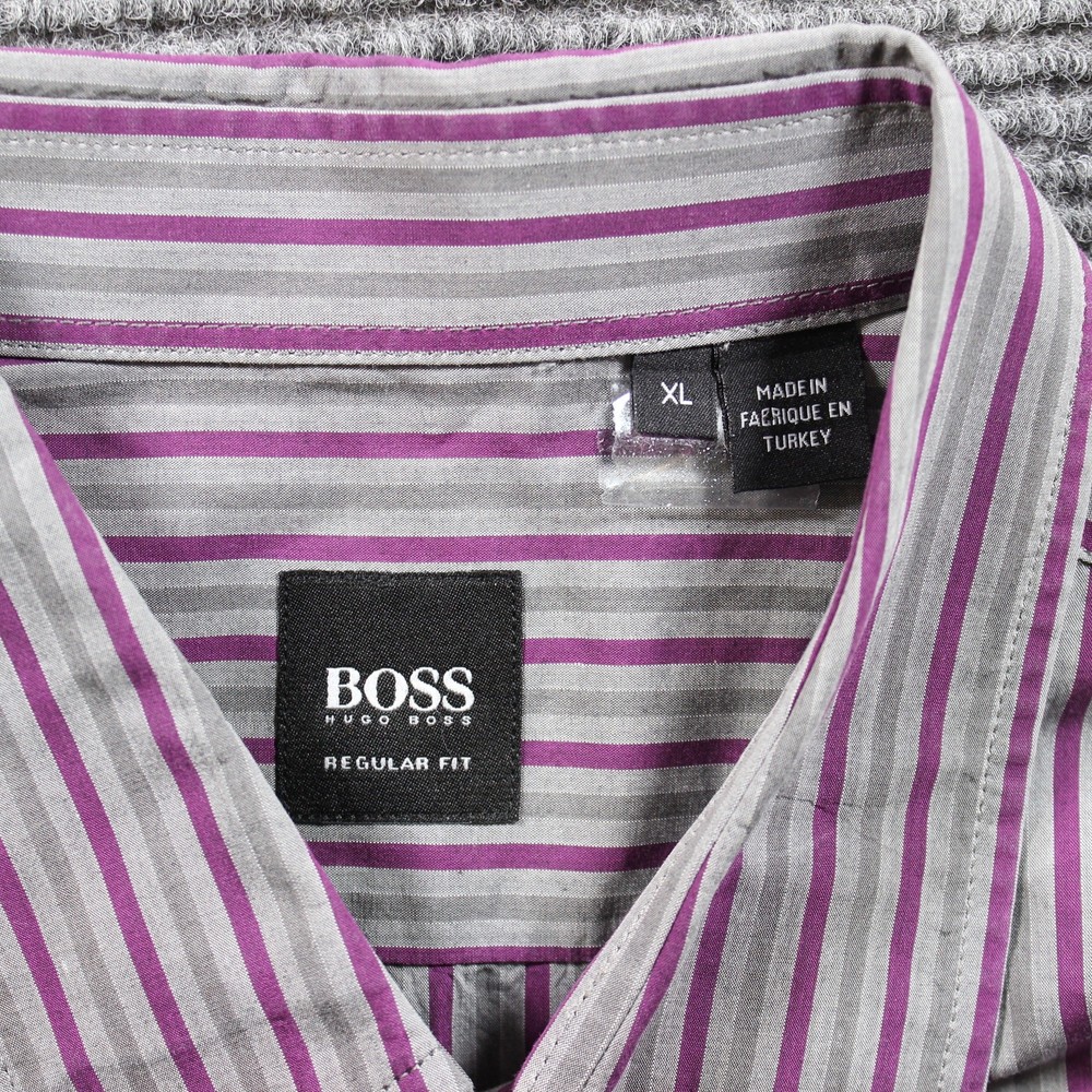 Crisp BOSS Hugo Boss men’s button-down in a gray base with purple stripes—easy work-to-weekend piece. Regular Fit with a classic collar and long sleeves, great under a blazer or worn untucked with denim/chinos. No stains noted (see photos). Color may vary slightly from photos due to lighting and monitor settings. Details: Brand/Model: BOSS Hugo Boss / LUCAS-P-01 Style: Long sleeve button-front dress shirt / button cuffs Color/Wash: Gray and purple Size: Men’s XL Fit: Regular Fit Condition: Pre-owned, clean with normal light wear; no stains