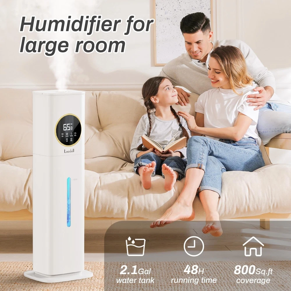 Product description Previous page Next page What room size is this humidifier suitable for? The medium units are ideal for around 500-800 sq. ft. Is there a risk of leakage with this humidifier? High-quality, well-sealed humidifiers are designed to reduce leakage risks. Top-fill models are often more effective at preventing leaks. Should I use distilled or tap water in the humidifier? To reduce white dust, we recommend using filtered water; our product features a replaceable water pump design, specifically for users in areas with hard/tap water. The humidifier shows a "water shortage" alert when there is water in the tank? If the humidifier displays "low water" despite having water, the pump may be clogged. Please reach out to us promptly for a pump replacement or purchase a new pump by searching ASIN: B0FW5233VB. How can I purchase a replacement pump? Please search for the ASIN: B0FW5233VB to make the purchase. LACIDOLL HUMIDIFER LARGE ROOM 8L humidifier for bedroom Add to Cart 8L humidifier for bedroom Add to Cart 8L easy clean humidifier Add to Cart 16L humidifier large room Buying Options 21L humidifier whole home Buying Options Customer Reviews 4.2 out of 5 stars 620 4.3 out of 5 stars 690 — 4.4 out of 5 stars 635 4.1 out of 5 stars 1,325 Price $79.99 $ 79 . 99 $79.99 $ 79 . 99 $75.99 $ 75 . 99 $139.99 $ 139 . 99 $189.99 $ 189 . 99 Capacity 2.1gal 2.1gal 2.1gal 4.2gal 5.5gal Area cover 800 sq ft 800 sq ft 500 sq ft 1500 sq ft 2000 sq ft Max mist output 300ml/H 300ml/H 300ml/H 800ml/H 1500ml/H Night light ✔ ✔ ✔ ✔ ✘ Timer ✔ ✔ ✔ ✔ ✔ Target humidity ✔ ✔ ✔ ✔ ✔ Sleep mode ✔ ✔ ✔ ✔ ✔ No water auto off ✔ ✔ ✔ ✔ ✔ remote ✔ ✔ ✔ ✔ ✔ extention tube ✘ ✘ ✘ ✔ ✔ On Jan 11, 2026 at 22:33:09 PST, seller added the following information: