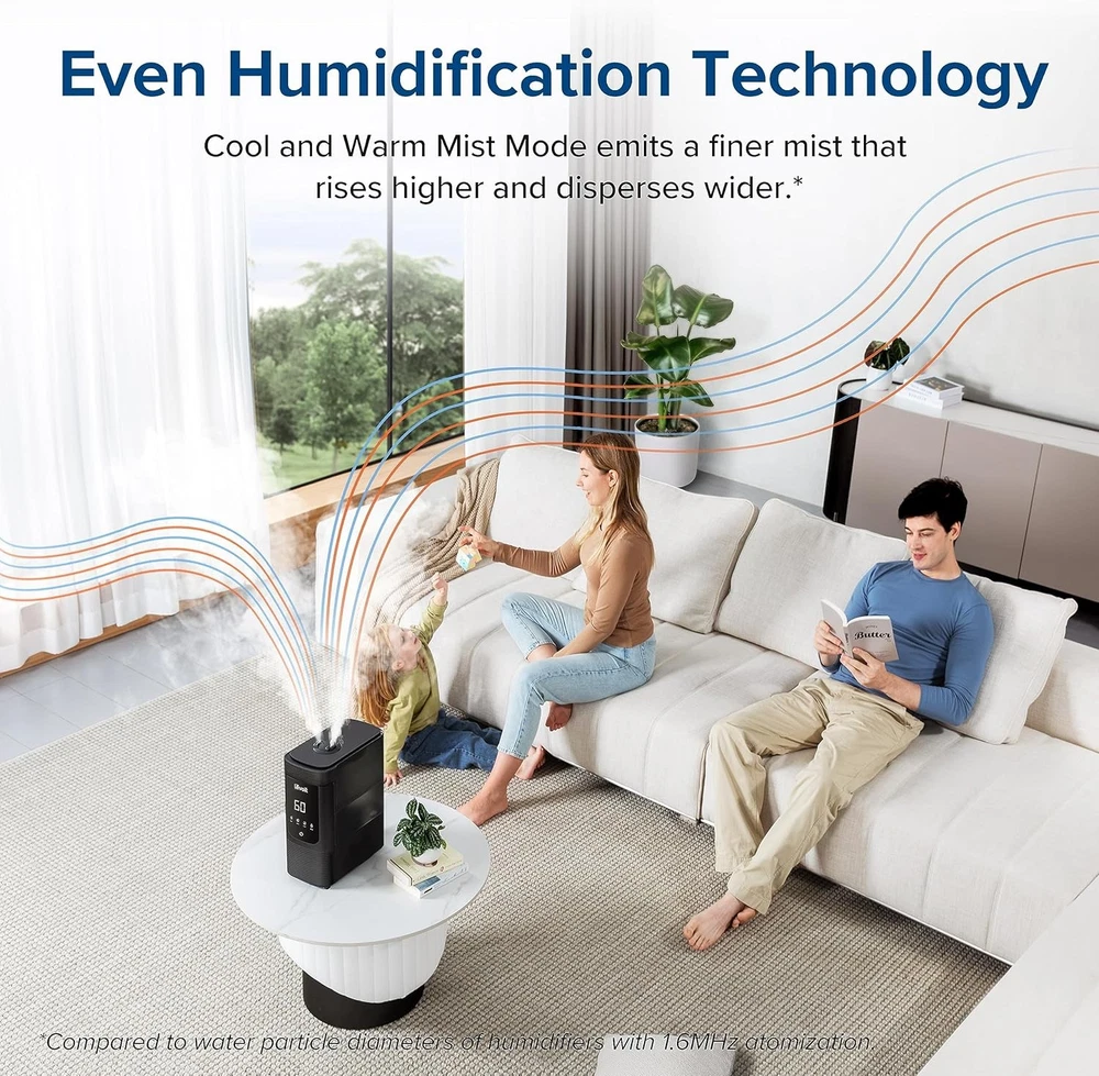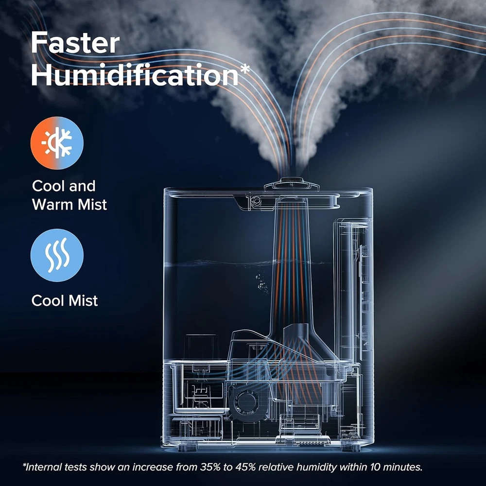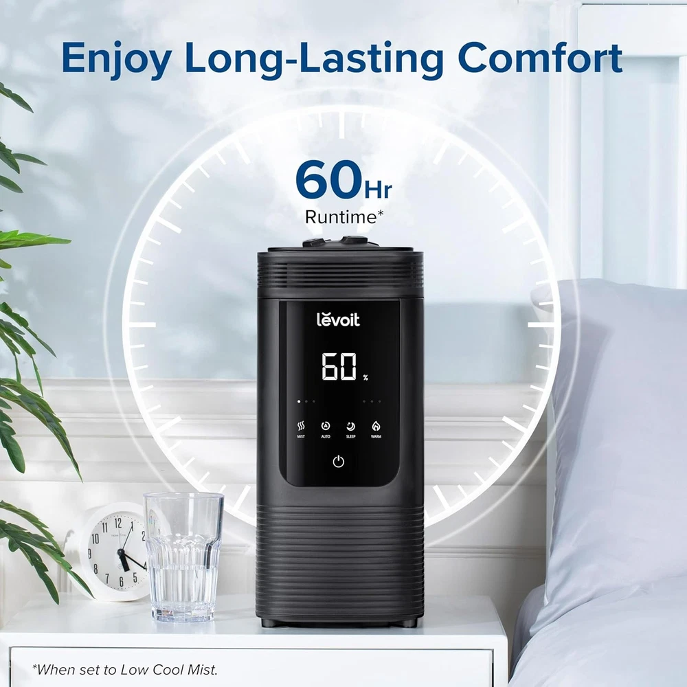From the manufacturer Previous page Next page Smart Control: Control settings, create schedules, and view real-time humidity levels through the free VeSync app. Seamlessly manage your humidifier from anywhere. Warm & Cool Mist: Choose between warm or cool mist settings to suit your environment, providing comfort year-round. Auto Mode: Set your preferred humidity level in the VeSync app and let Auto Mode maintain it for you. Aromatherapy: Add essential oils to the aroma pad to create a soothing, fragrant atmosphere in your space. Ultra-Quiet: Noise reduction technology keeps the sound level as low as 26dB—whisper-quiet operation for peaceful sleep or work. Dual 360° Nozzles: Customize mist output with two rotating nozzles, directing mist in different directions for complete room coverage. Top-Fill Design: Refill the tank easily by pouring water directly into the top—no need to flip anything over! Wide Coverage: Quickly humidify rooms sized between 215–430 ft² with efficient mist output for optimal comfort. Health Benefits: Maintains optimal humidity to help hydrate skin, relieve congestion, and reduce nightly coughing. What’s Included: 1 × Smart Humidifier 1 × Cleaning Brush 3 × Aroma Pads (1 pre-installed) 3 × Absorption Pads (1 pre-installed) 2 × Water Filter Sponges (1 pre-installed) 1 × User Manual 1 × Quick Start Guide Perfect for Your Space: Turn your room into a tropical haven, meditation space, or home spa with soothing mist and aromatherapy. Smart Control Features: Control settings, monitor humidity levels, set schedules and timers, and adjust mist output easily through the app. Why Choose This Humidifier: Enhance your comfort with versatile features, ultra-quiet operation, and customizable mist settings to suit your needs. Note: Please remember to use genuine LEVOIT accessories to ensure optimal performance and avoid potential issues with non-official parts. On Nov 19, 2025 at 20:31:22 PST, seller added the following information:
