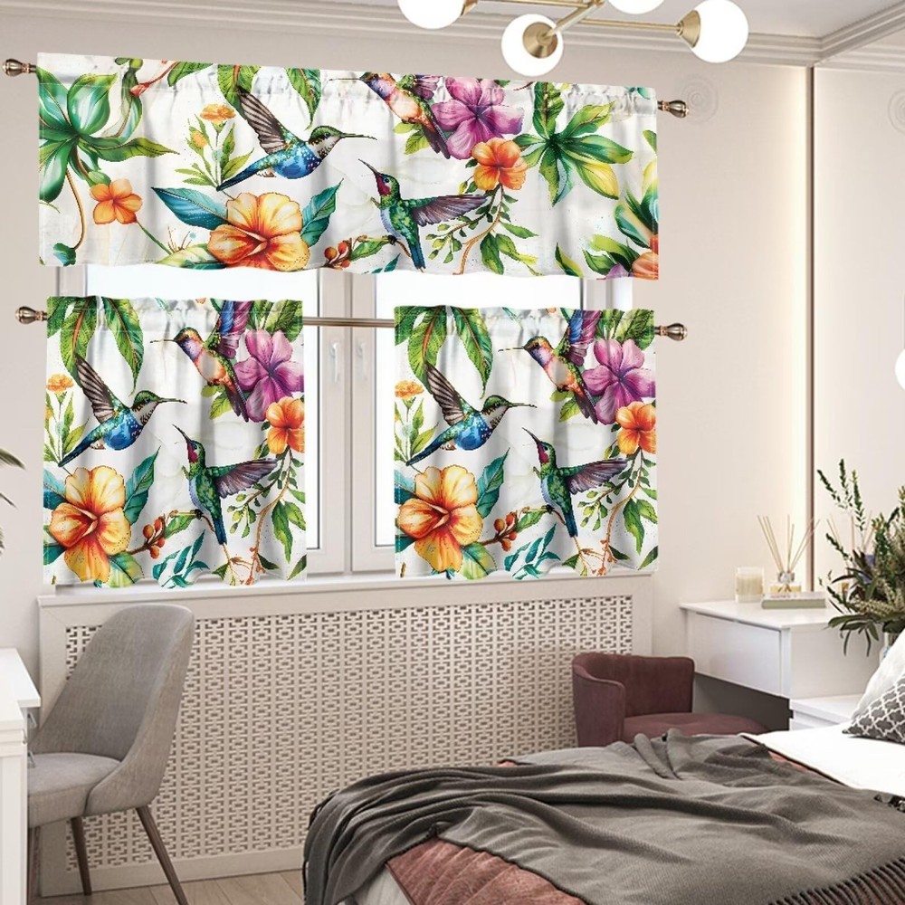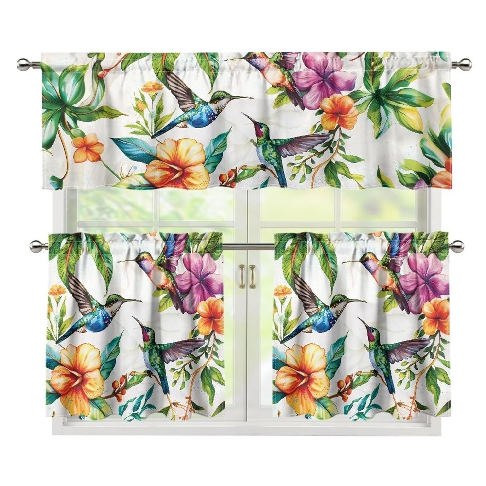 Hummingbird 3 Piece Kitchen Curtains Valance and Tiers Set Rod Pocket Washabl...