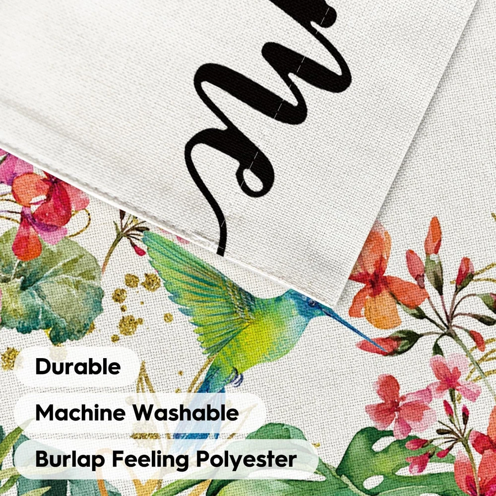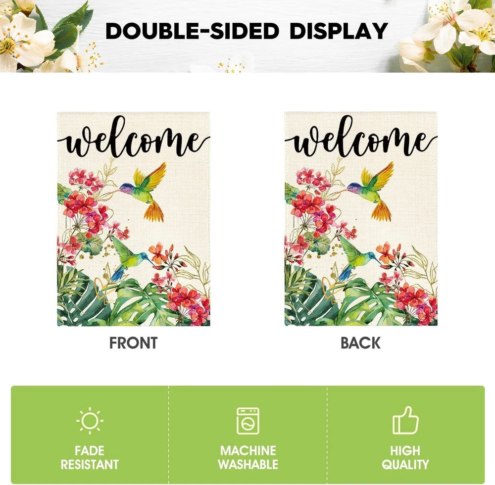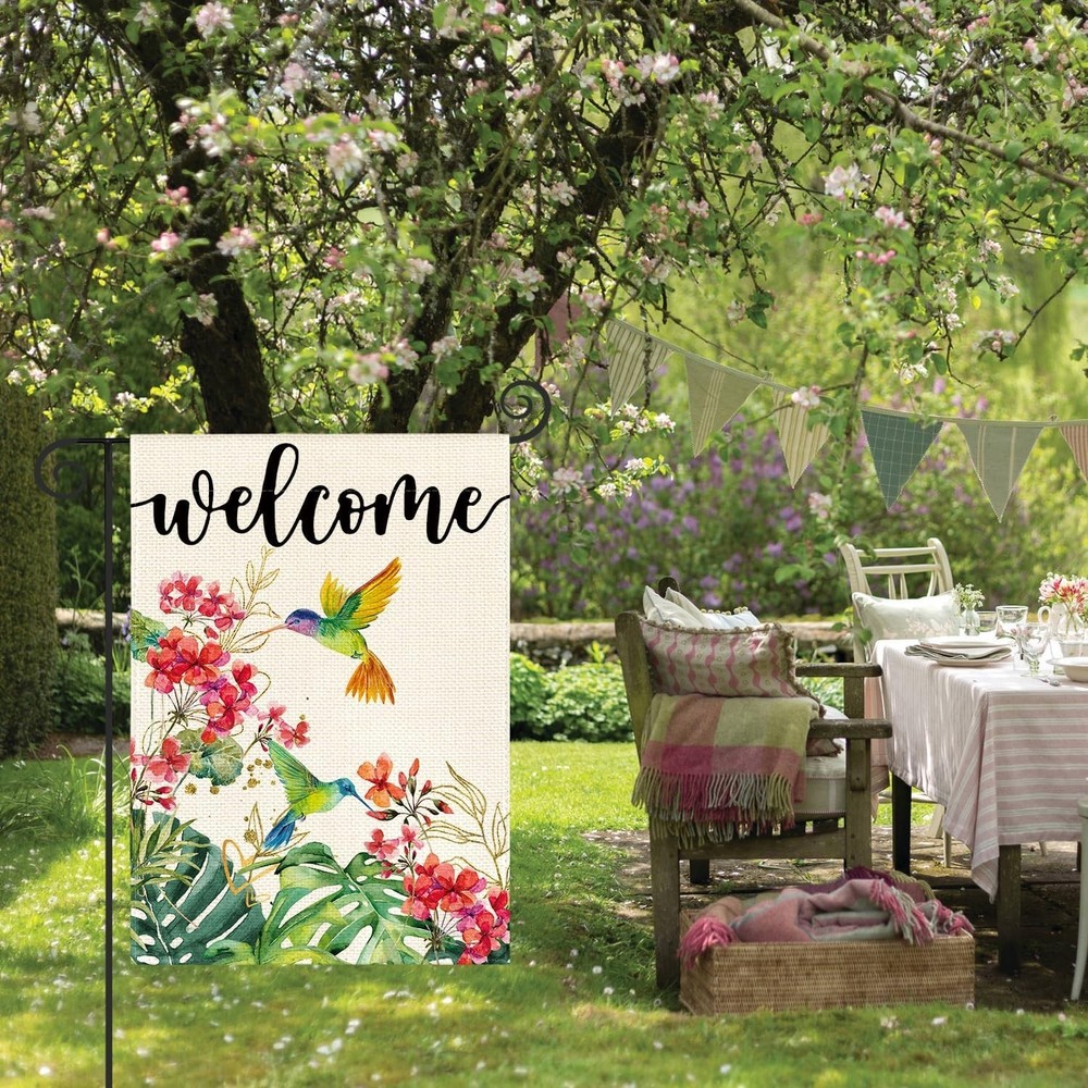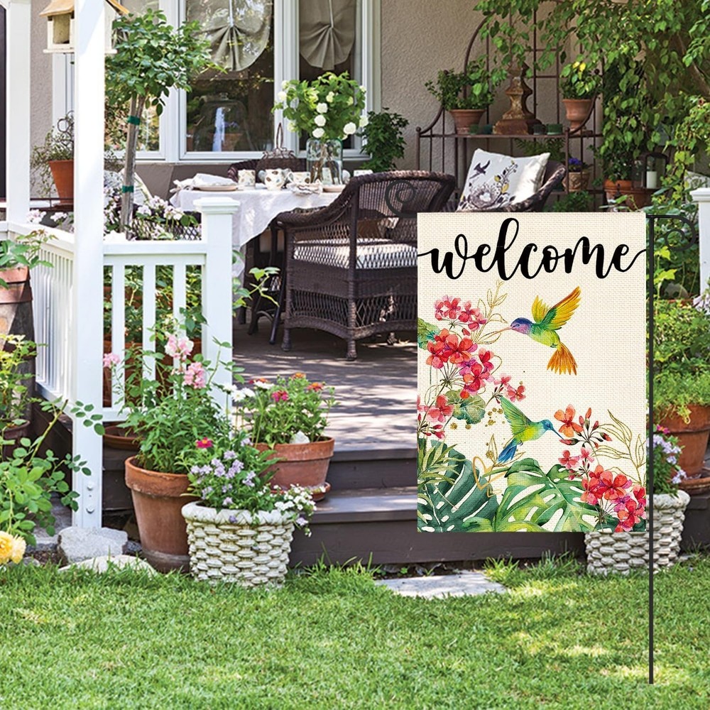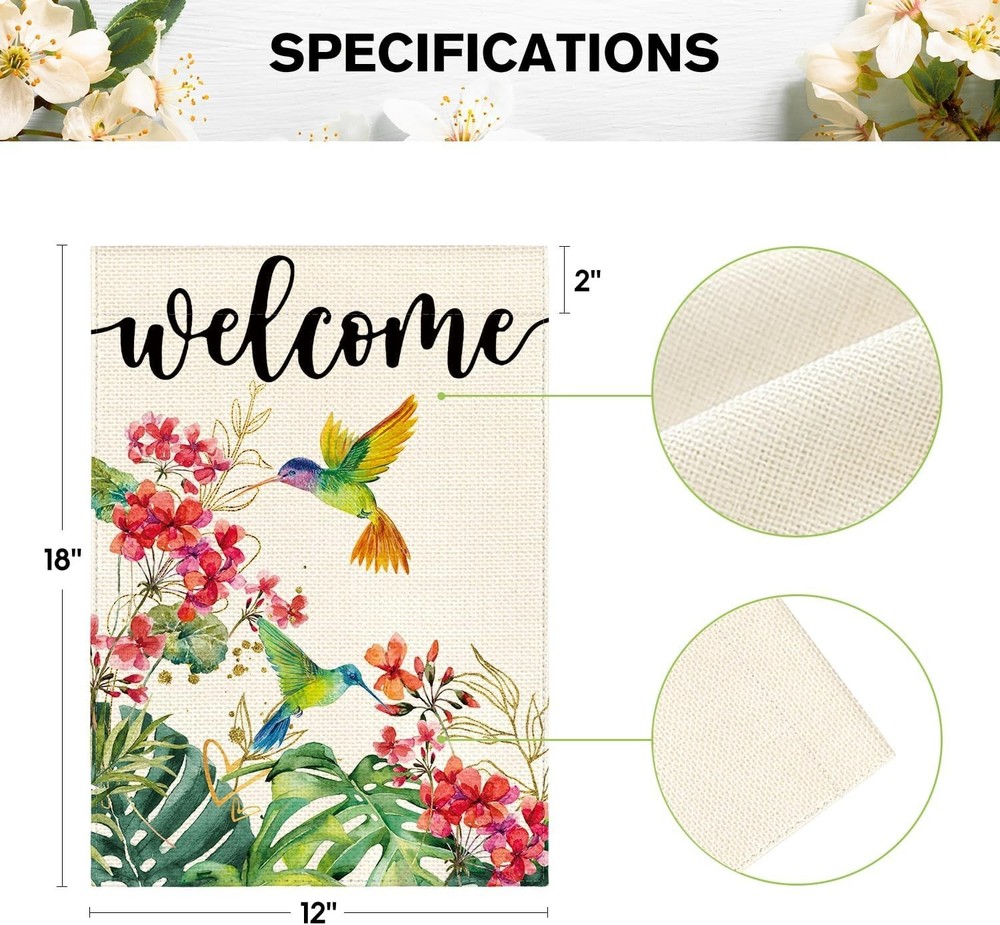 AVOIN colorlife Hummingbird Floral Welcome Garden Flag 12x18 Inch Double Sided Outside, Spring Summer Burlap Small Yard Outdoor Flag About this item DURABLE AND HIGHER QUALITY: Made of machine washable Spun Polyester which is durable and weather resistant. Double stitching panels on multiple rows and high quality sleeve to provide lasting strength HOME DECOR: Welcome guests to your home with this unique, seasonal flag. Perfect for any deck, patio, porch or veranda and make charming decorative statements for any backyard, lawn or garden DOUBLE SIDED: Design is double sided with the image printed and visible from both sides and text also reads correctly from both sides FEATURES: Sleeve hanger fits standard Banner/Flagpole, Bracket, Arbors or stand. Flag pole NOT included. Material: 100% Polyester. EASY TO INSTALL AND MACHINE WASHABLE: All flags feature a sleeve at top for use with any standard flag pole or stand, easily slip the flags through the holes on either of the top sides to hang them on your garden flag stand