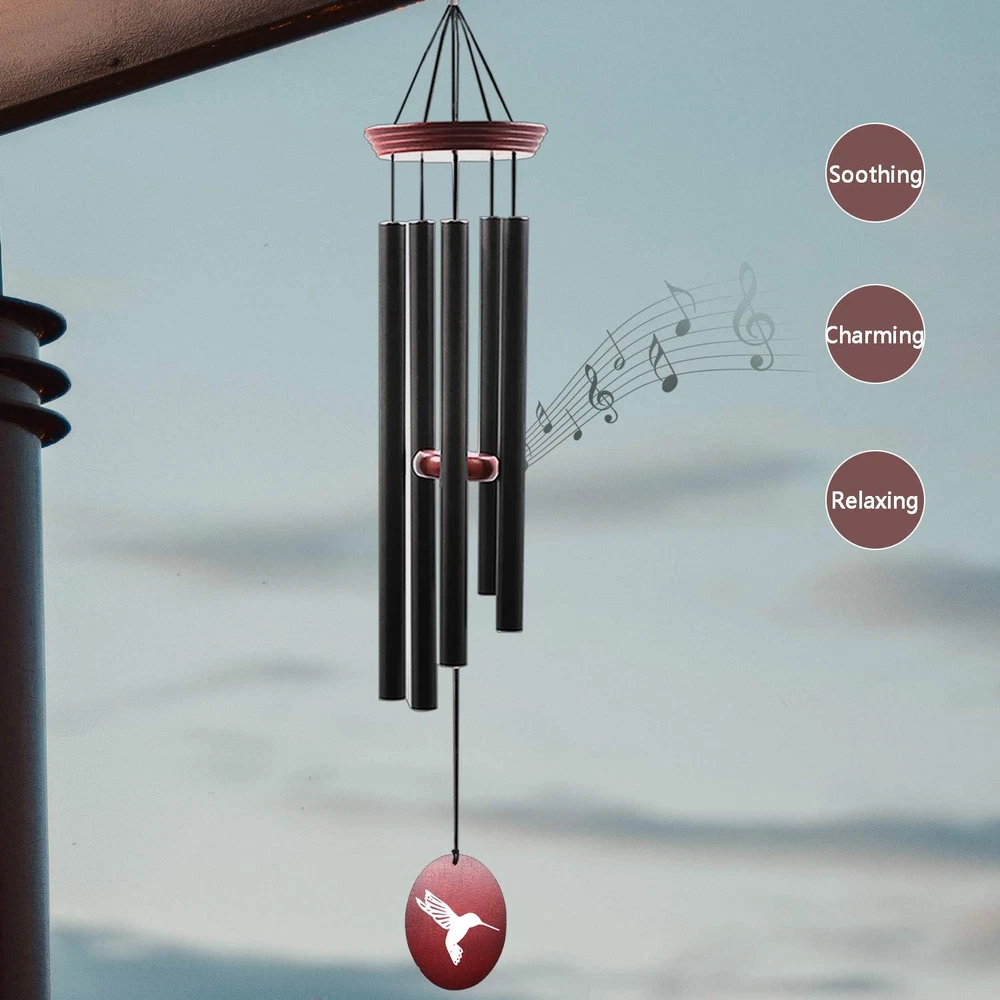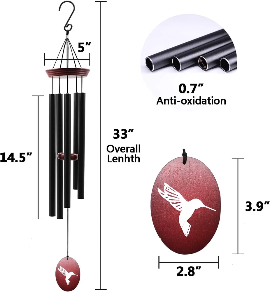 Unique Hummingbird Design: Our outdoor wind chimes feature a 33-inch height from hanging hook to bottom wind catcher, with a 5-inch wide suspension platform. The hard aluminum tubes are coated in black matte color, and the longest tube measures 14.5 inches. The catcher is printed with a hummingbird design, adding a touch of elegance to your garden, yard, or patio. Premium Quality: Our wind chimes are crafted with high-quality materials, including waterproof coating, corrosion-resistant nylon strings, and sturdy aluminum pipes. This ensures that your wind chime stays beautiful and functional for a long time. Soothing Sound: Each tube is precision-tuned to a pentatonic scale, producing peaceful melodies that relax and soothe your mind and body. Simply hang the chime in the breeze, and enjoy the beautiful sounds it creates. Memorial Gifts: Perfect for Mother's Day, Christmas, or any special occasion, these wind chimes make a thoughtful gift for loved ones. Customize yours to show how much you care, and give the gift of serenity and beauty. Versatile Decoration: At 33 inches, these wind chimes are the perfect size for outdoor or indoor decoration. They add a touch of elegance to your patio, garden, yard, or home. The included S hook makes it easy to hang anywhere. Earth-Friendly & Sustainable: We care about the environment and use eco-friendly materials and packaging to minimize our carbon footprint. Product Description Musical wind chimes- Each tube is precision tuned to pentatonic scale. Enjoy peaceful melodies that play as a whisper in the wind - deep, rich and full of beauty. They sound lovely and will relax your mind and body. Unique design perfect for the patio, garden, and anywhere you wish to add beautiful melodies to your environment, NOW Bring This Classic Wind Chimes Home Today Premium Wind Chimes Nice Sound wind chime strings are more corrosion-resistant nylon material Different Design for you choose Unique Outdoor Wind Chimes Design- 33-inch height from hanging hook to bottom wind catcher. The suspension platform is 5 inches wide .5 hard aluminum tubes covered with black matte color, and the longest tube’s size is 14.5 inch. it fits your garden, yard, also to your friend’s. Perfect Gifts This wind chimes are beautiful enough and gifts for people who loss of loved ones Quality Materials 5 hard aluminum tubes covered with black matte color, and the longest tube’s size is 14.5 inch Quality Materials Unique Dragonfly Outdoor Wind Chimes Design Adjustable The Height of The Wood Can Be adjusted to Make DifferentSound Wind chimes outdoor sympathy gifts-This memorial wind chime is not only suitable for patio, garden, yard décor, but also perfect gifts choice for Mother’s Day, Christmas. You can order this chime as gifts for your family, friends, neighbors. Everybody want to enjoy a Beautiful and lasting gift, you will not let them down.