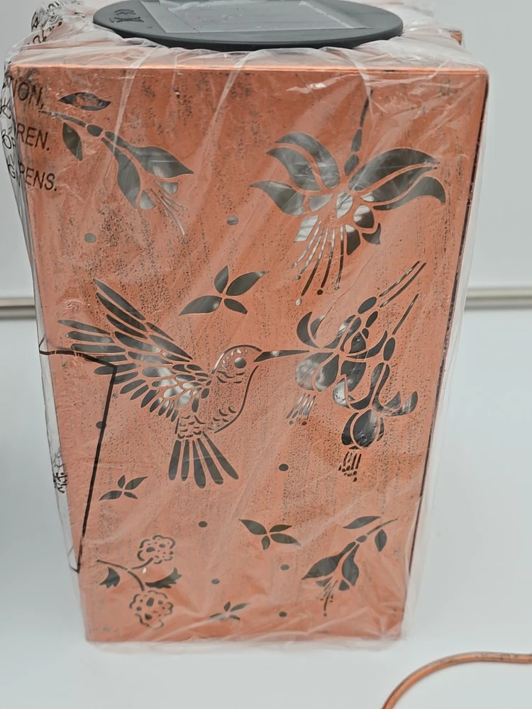 Package Dimensions LxWxH:7.17x5.63x5.59 InchesEnergy Star:ANumber of Settings:1Number of Lights:1Features:Energy EfficientMounting:HangingMPN:Does not applyType:Does not applyBrand:UnbrandedEAN:Does not applyControl Style:SwitchColor:CopperyTheme:HummingbirdsModel:Does not applyUPC:Does not applygtin13:Does not applyMaterial:Does not applyLighting Technology:LEDInstallation Area:OutdoorEC Range:A+++ - ELight Color:Warm WhiteSensor Type:LightPower Source:Solar