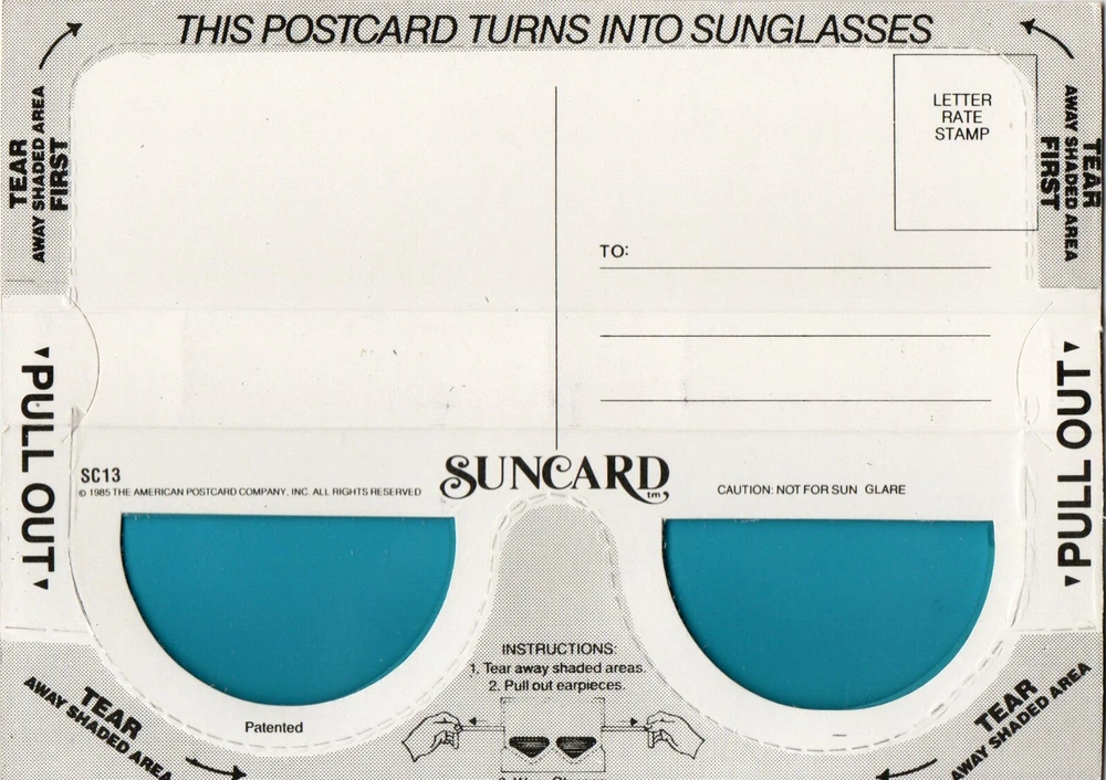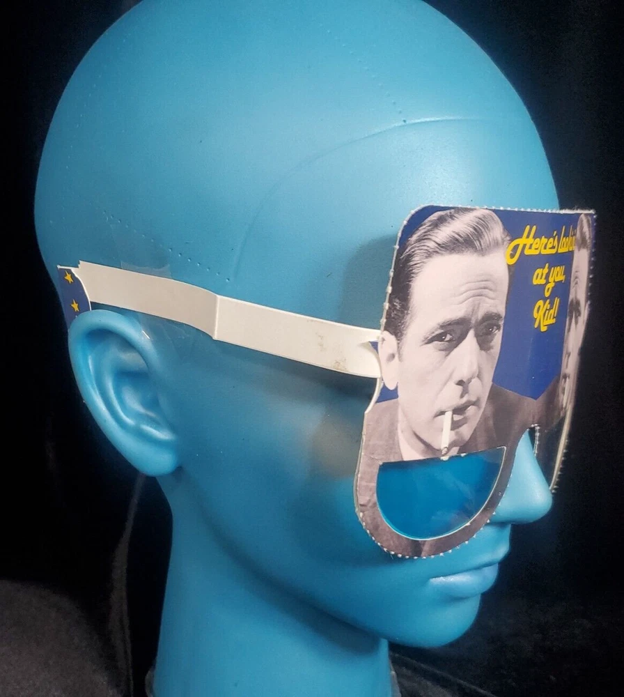 Humphry Bogart, Smoking "Here's Lookin at you Kid"! Transforming Suncard Postcard. ©1985 The American Postcard Company. "4.5"x6.25". Slightly larger than standard Continental cards. This card folds out into non-eye protective novelty sunglasses with blue tint windows. Listing is for 1 card. I have shown two in my picture's to show an example of card after assembly. Your card will be NOS and un-assembled. Please see all our retro-vintage cards and postcards from the now defunct American Postcard Company. I believe we have the largest selection on NOS American Postcard company cards available anywhere. Please contact us for custom bundles if you are interested. Volume price set to on. Vintage postcards may have small differences ie; yellowing of paper, slightly worn edges or corner blunts. Basic wear from storage of vintage paper and cardboard items. items. I will always send the best quality card I have. The picture is of a postcard like the one you will receive not necessarily the one you will receive. I will never send a bent, ripped or damaged card unless specifically mentioned. I always inspect every item I send out for quality and ship with care, how I would like to receive an item. Please message me with any questions or concerns. Thank you.