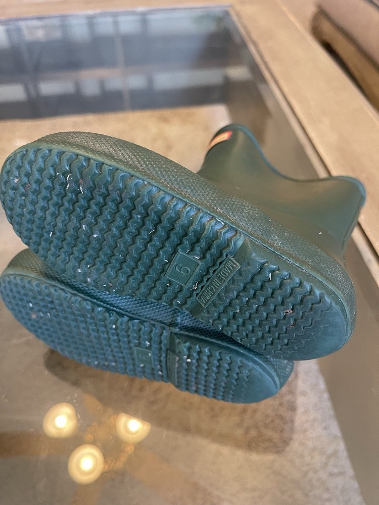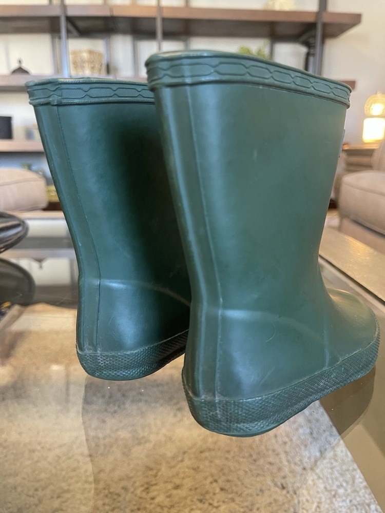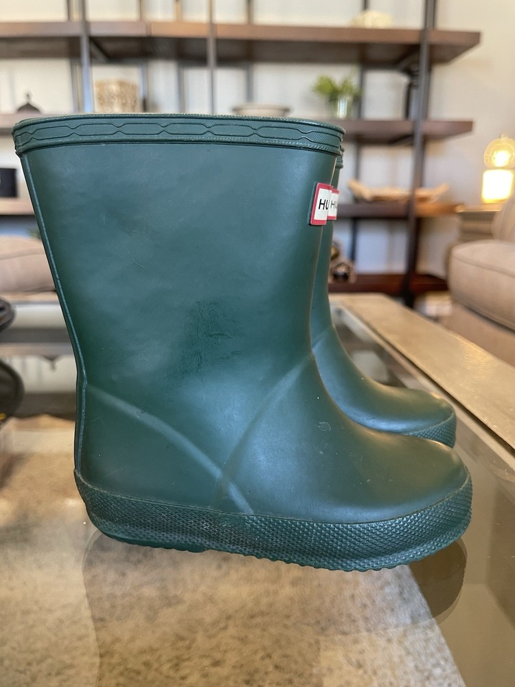 The Hunter Classic Green First Rain boot in toddler size 7 is a unisex rain boot designed for casual occasions in winter, fall, and spring. It features a round toe, pull-on closure, and a flat heel for comfort. The rubber outsole provides waterproof protection, making it perfect for outdoor activities. The classic green color and logo accents add a stylish touch to this practical and durable boot from the trusted brand Hunter.