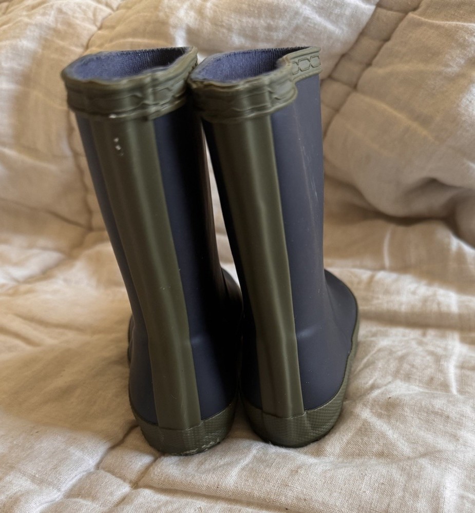 Hunter Kids First Classic Rain Boot Blue And Green - Size B 7, G, 8. Condition is New with defects. Shipped with USPS Ground Advantage.
