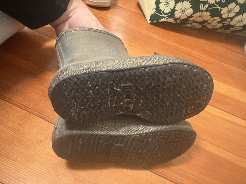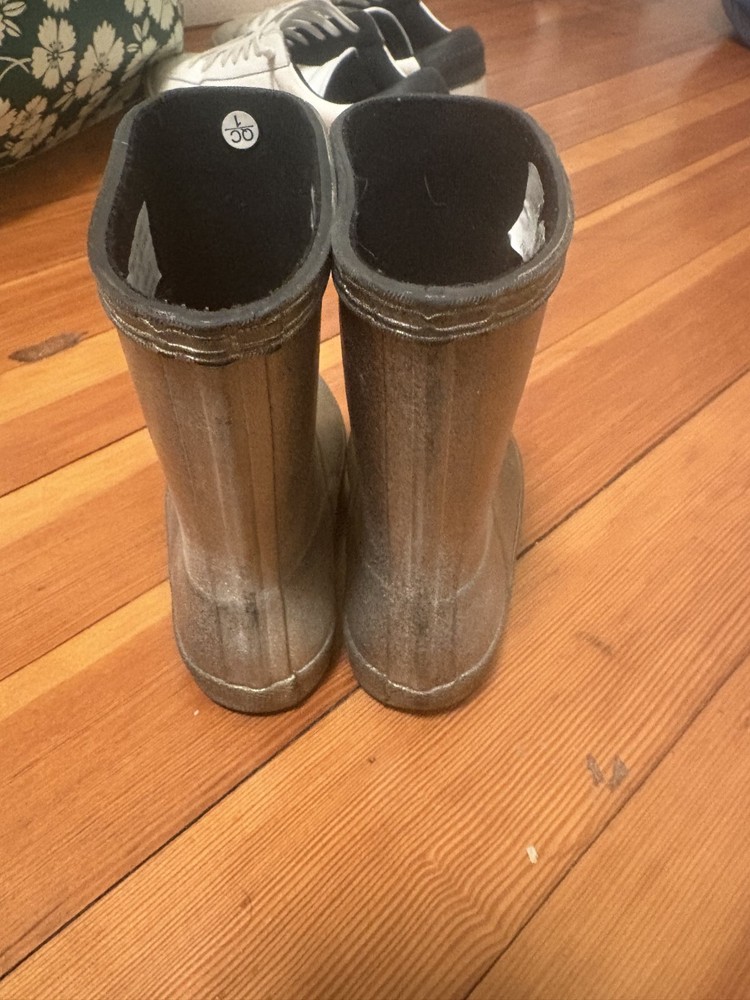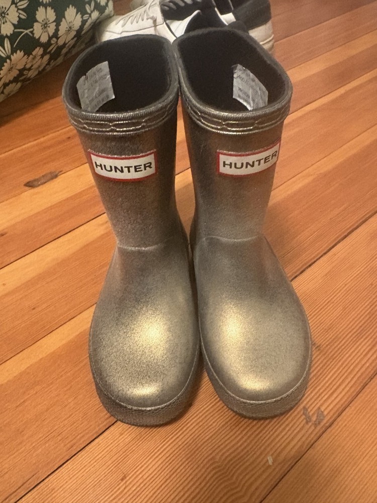 The Hunter Kids First Classic Nebula Rain Boots in size 7c Metallic Gold are a stylish and practical choice for young children. With a round toe shape, flat heel, and waterproof construction, these boots are perfect for casual occasions and outdoor activities in wet weather. Made with rubber upper material and featuring the signature Hunter logo accent, these boots offer moderate cushioning and are suitable for walking. The metallic gold color and classic theme add a touch of fun and charm to any outfit, making them a must-have for the winter, fall, and spring seasons.