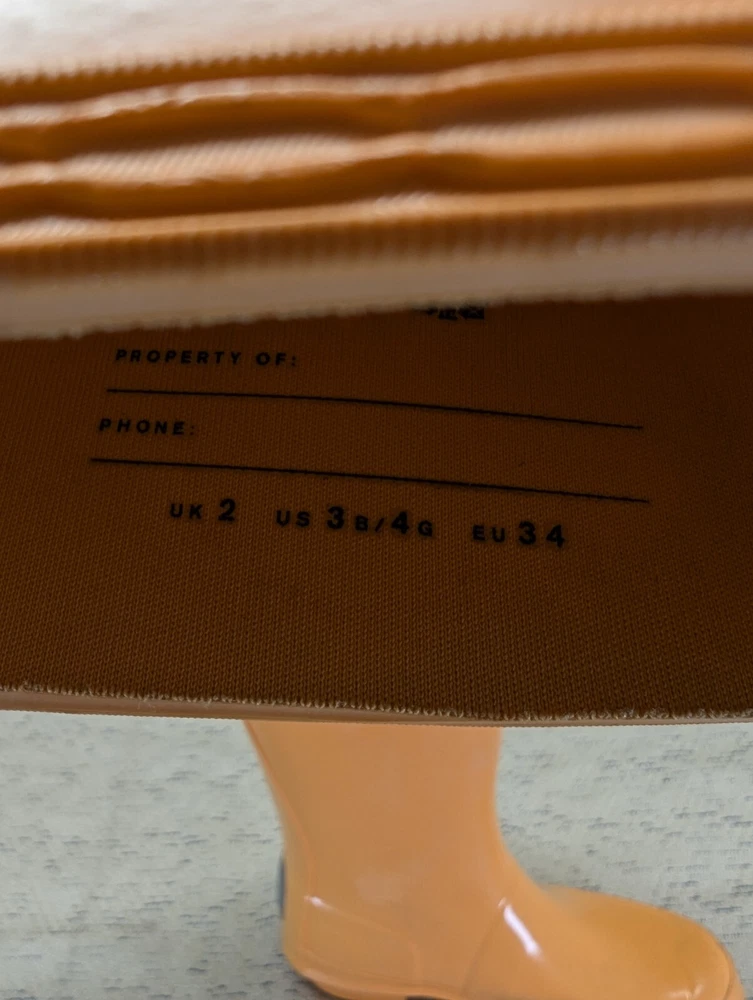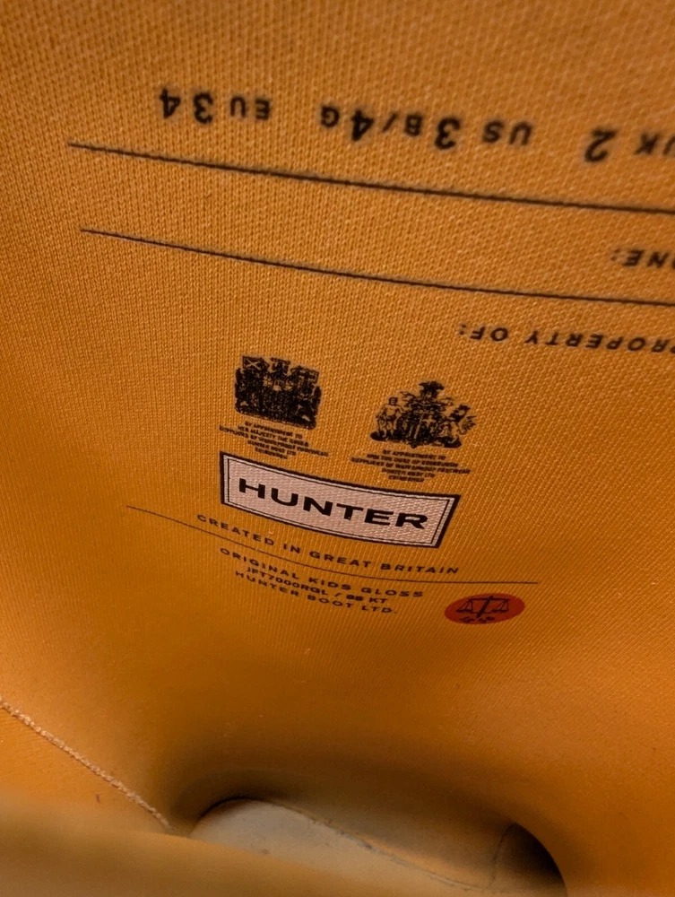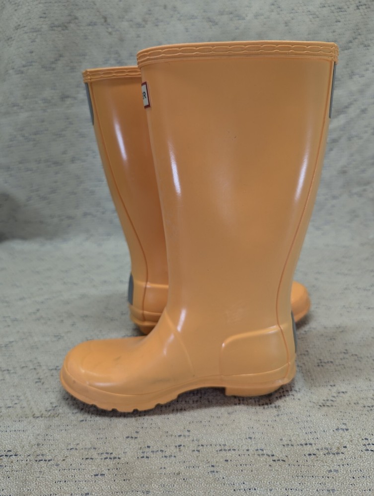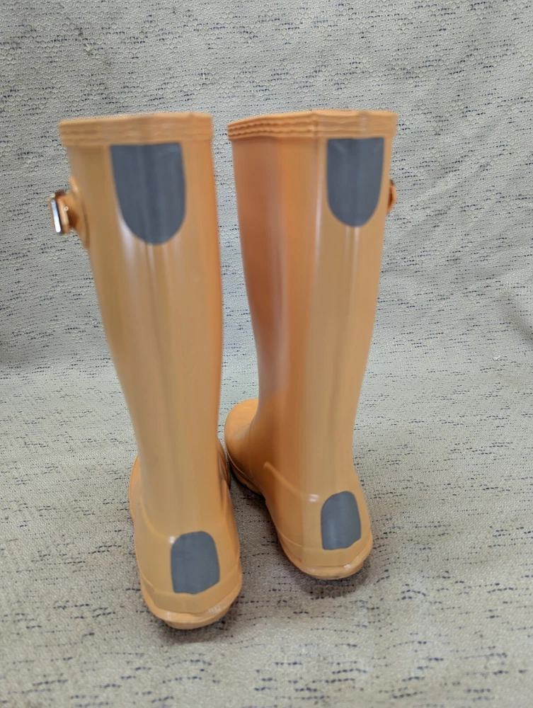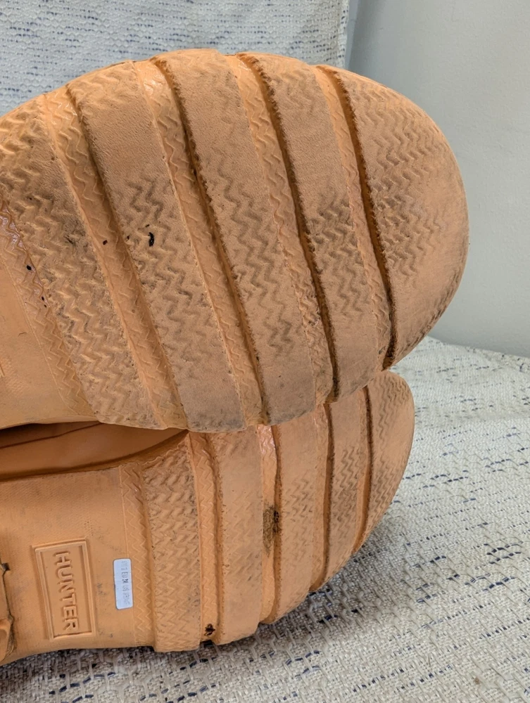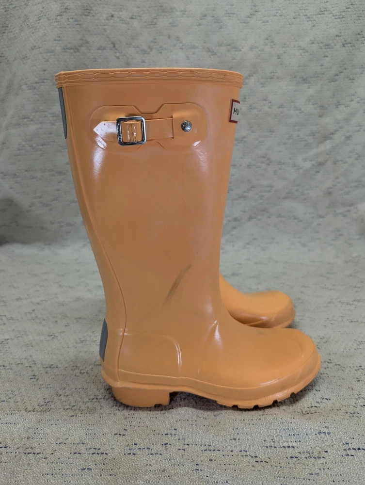 These Hunter Wellies are still in great shape—perfect for muddy adventures! The orange color is bright and fun, and the buckles add a cool touch. There’s some wear on the tread and a cracked strap, but they’re totally sturdy for playtime. My kid loves them!