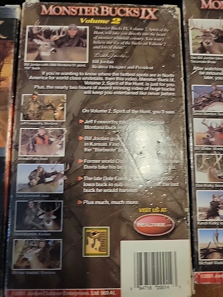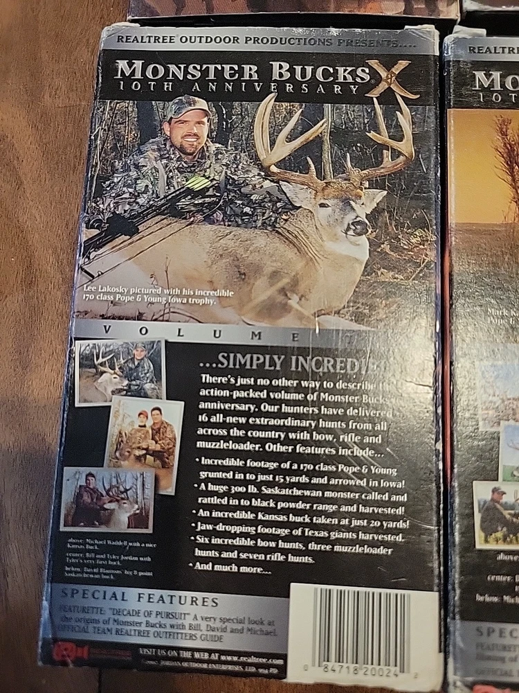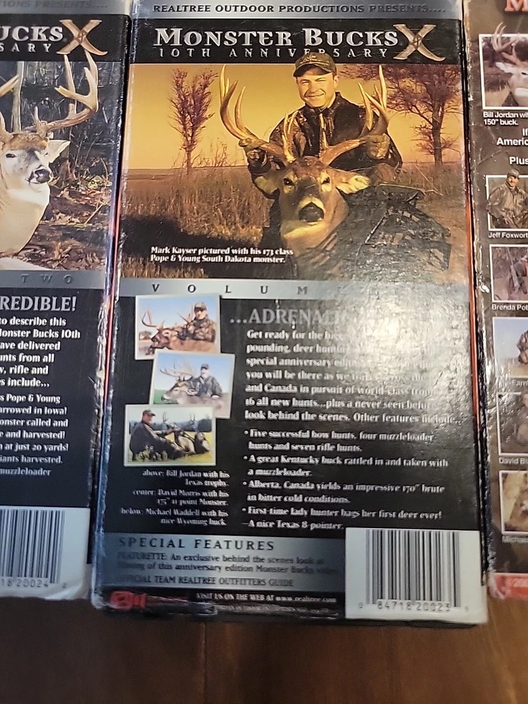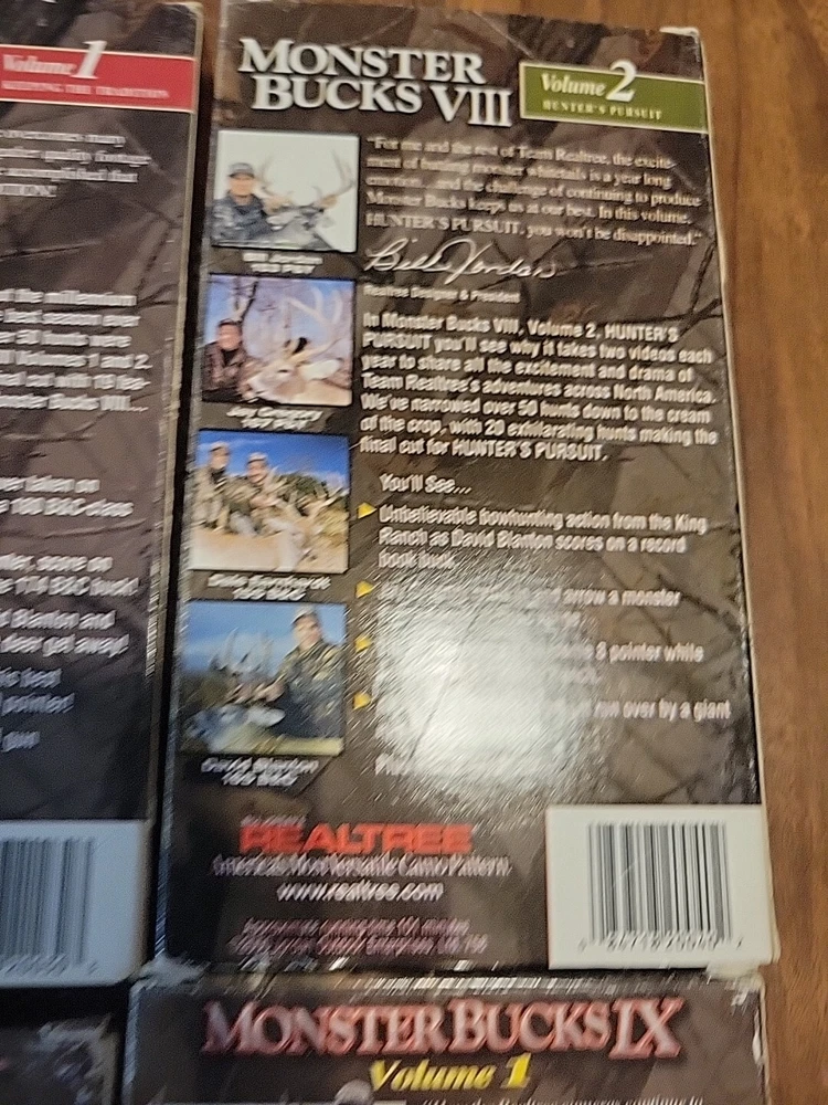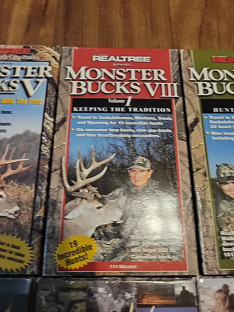 This lot of 8 VHS tapes is a must-have for any hunting enthusiast. Featuring footage of big game deer hunting, these vintage and rare tapes are a great addition to any collection. The Mega Bucks Box TS12 includes exciting footage of hunters in action and is sure to provide hours of entertainment. Whether you're an experienced hunter or just starting out, these tapes are a valuable resource for learning new techniques and strategies. Don't miss out on this opportunity to add some excitement to your hunting library. MONSTER BUCKSV HEALTREE MONSTER BUCKSIX FALL FEVER REALTREE MONSTER BUCKS MONS VOLUME MONSTER BUCKS ERSAR MOSSY OAK MEGA BUCKS MONSTER BUCKS VIII Volume KEEPING THE TRADITION REALTREE MONSTER BUCKS VIII 2 HUNTER'S PURSUIT 20 heart pounding hunts! 20 Incredibi Hunts REALTREE MONSTER BUCKSIX SPIRIT OF THE HUNT 10 Exciting Hunts and stel bowhunt for Bodne and Crockett Whitetaill