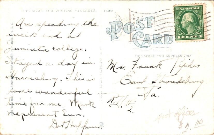 Unit of Sale:Single UnitContinent:North AmericaEra:White Border (1915-1930)Subject:Post OfficeRegion:PennsylvaniaPostage Condition:PostedCity:HuntingdonTheme:Architecture, Cities & Towns, Community Life, Domestic & Family Life, Occupational, Patriotic, FlagOriginal/Licensed Reprint:OriginalType:Printed (Lithograph)Material:PaperCountry of Origin:United StatesNumber of Items in Set:1Country:United States
