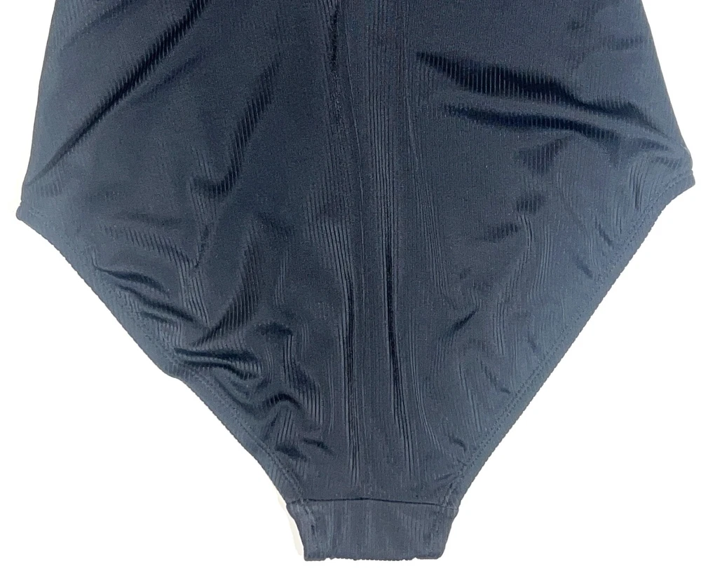 Brand NEW With Tags Hurley Black Ribbed Textured UPF 50+ One-Piece Bathing Suit Swimsuit ~ Women's Size S - Small. Measures: 14" flat across the front from underarm to underarm unstretched and 29" from shoulder to crotch.