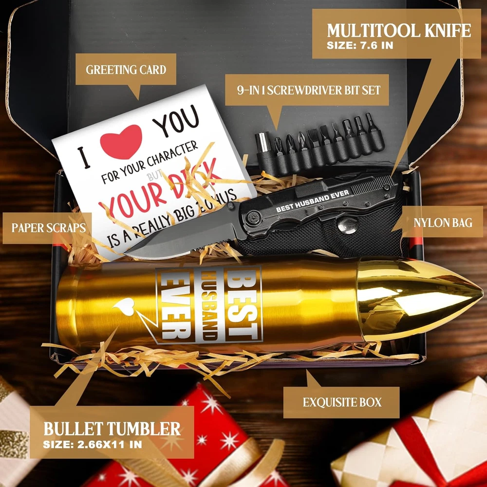 Store New Arrivals Add to Favorite View Feedback Contact Husband Gifts Tumbler Multitool Knife Set Best Husband Ever Birthday Christmas Husband Gifts Tumbler Multitool Knife Set Best Husband Ever Birthday Christmas Fathers Day Valentines Day Gifts for Him Husband from Wife: The time to show love to your husband and give a fathers day valentines day gift is right around the corner. On fathers day valentines day you can give this tumbler knife set to reward the husband in your life and give the husband we love a special fathers day valentines day gift for him husband from wife, husband valentine gifts from wife, valentines fathers day gifts for him husband from wife and boyfriend gifts Gift Set: What you can get? A golden bullet tumbler and 20-in-1 multitool knife engraved"BEST HUSBAND EVER", greeting card and a gift box.The multitool knife contains knife, pliers, bottle opener, can opener, wire cutter, screwdriver and screwdriver bit adapter, it is perfect for husband to use when husband is outdoors. And it’s perfect as birthday gifts for him husband, anniversary gifts for him husband, husband fathers day gifts from wife and fathers day gifts for husband from wife Safety Lock: This husband multitool knife has a safety lock, when husband are using the husband knife, the safety lock will keep the blade in place and will not fold randomly to avoid accidental injury. Press and hold the safety lock blade to fold, the folded knife does not take up much space, perfect for boyfriends outdoor hiking,camping,fishing and perfect as husband birthday gifts for him boyfriend, gifts for husband who have everything and best husband ever fathers day gifts from wife Practical: Our husbands tumbler and knife are made of stainless steel, and drop-proof. And this husband tumbler can can keep cold for 12 hours and keep hot for 6 hours, so your husband can can enjoy a good cup of hot coffee or iced drink, this husband mug is ideal for husband's daily life, husbands fathers day gifts idea from wife, boyfriend birthday gifts, husbands anniversary gifts from wife, valentines gifts for him boyfriend and Christmas gifts for husband Outdoor Use: If your husband or boyfriend likes outdoor activities like camping and hiking, this multifunctional gift set can bring a lot of convenience to your husband. The husband multitool knife can help him solve husbandy outdoor problems, and the husband mug can help him hydrate. This husband gift set must be a good assistant for husband's outdoor activities and birthday gifts for him, fathers day gifts for him husband from wife, fathers day gifts from wife Birthday Anniversary Gifts for Him Husband from Wife: Whether it's Valentines day, birthday, Christmas Day, Fathers day, anniversary, our unique tumbler knife set will be the perfect fathers day gift, valentines day gift, birthday gift, anniversary gift, Christmas gift, stocking stuffer for husband, boyfriend gifts, gifts for him, fathers day gifts for husband from wife and valentines gift for husband from wife Product Description Best Gift Selection For Husband The video showcases the product in use. The video guides you through product setup. The video compares multiple products. The video shows the product being unpacked. If you don't know what to give your husband as a gift, then this multifunctional gift set is your gift selection. Give your husband this tumbler knife set on birthday,Christmas day,Valentines day, let it accompany your husband, this gift set must be the perfect thoughtful gift for husband. " data-position="triggerHorizontal"> " data-position="triggerHorizontal"> Husband Gifts From Wife Unique Shape This shiny bullet shape tumbler is an eye-catcher, impress husband’s heart. Your husband will feel surprise for fathers day gift from wife. High Tightness The tumbler has a leak-proof smart lid, making it easy for husband to use while exercising outdoors. Strong Thermal Insulation The tumbler is double-insulated to ensure drink keep hot for 8 hours and keep cold for 12 hours. Exquisite Engraving This tumbler is engraved with “BEST HUSBAND EVER”, let husband feel your most sincere and warm love. Safety lock For safety and convenience, avoid accidental opening and closing of tools. Screwdriver Bit Set This 9-in-1 screwdriver bit set offers multiple uses for husband's convenience. Nylon Bag Easy to carry. Nice fathers day gifts for husband from wife. Unique Engraving This knife is engraved with “BEST HUSBAND EVER”, impress husband’s heart. Birthday & Christmas Day & Valentines Day Gifts for Husband Tumbler A good companion for husband's daily consumption of water. Beautiful Mug Husband will be in a happy mood when he use a beautiful mug. Pocket Knife Easily cuts down branches and other things. Pliers Help husband solve many outdoor problems. Bottle Opener Easily open hard-to-open bottle caps. Can Opener Easily open hard-to-open cans. Product Dimensions: (n/a) About Us Our vision is to be eBay’s most customer-centric store, where customers can find and discover anything they might want to buy online, and endeavors to offer its customers the lowest possible prices." "Our mission is to serve consumers online and focus on selection, price, and convenience." #Find it, Love it, Buy it Payment policy We currently accept payment via eBay managed payment only. Once payment is cleared, We will dispatch your shipment with 1-3 business days. Please refer to the "Shipping" tab for more information regarding shipping speed to your destination. Shipping policy 1. We offer FREE shipping on all orders! 2. We ship within three business days of payment, usually sooner. 3. We use a selection of shipping services such as UPS, FedEx, USPS etc. 4. We only ship to the lower 48 states, no APO/FPO addresses or PO Boxes allowed. 5. Local pickups and combined shipping options are not provided at this time. Returns We are committed to your happiness. That’s why we offer a 30-Day Return Policy on items that you are not completely 