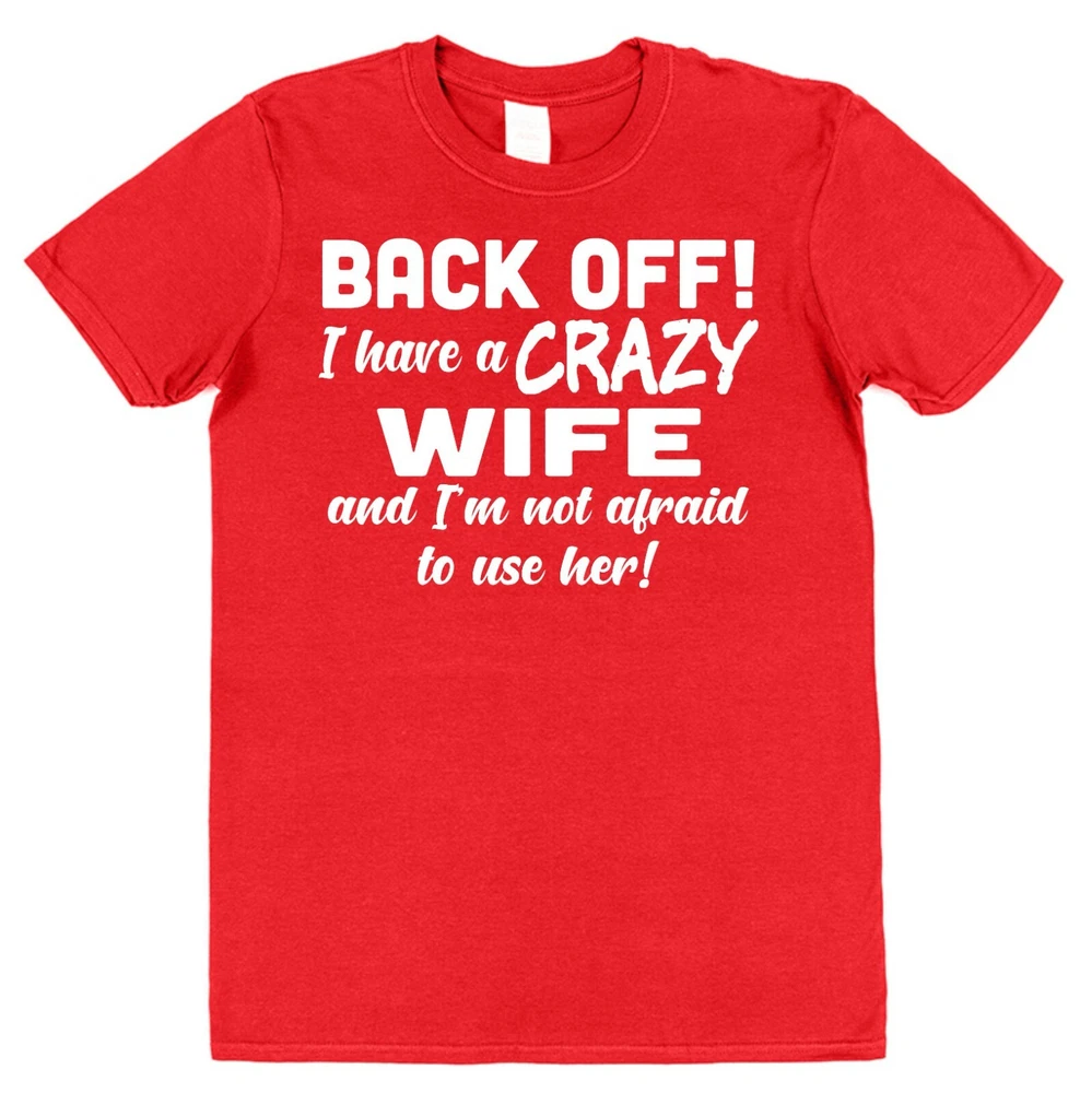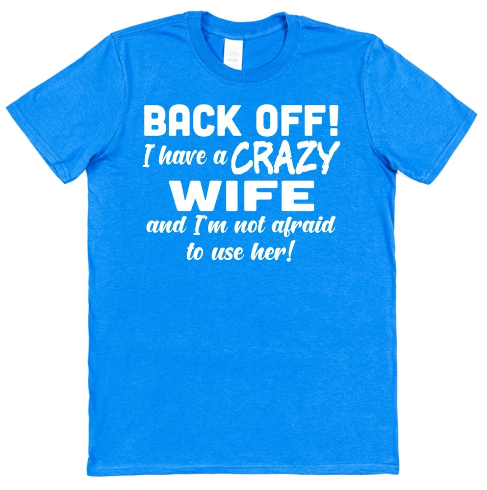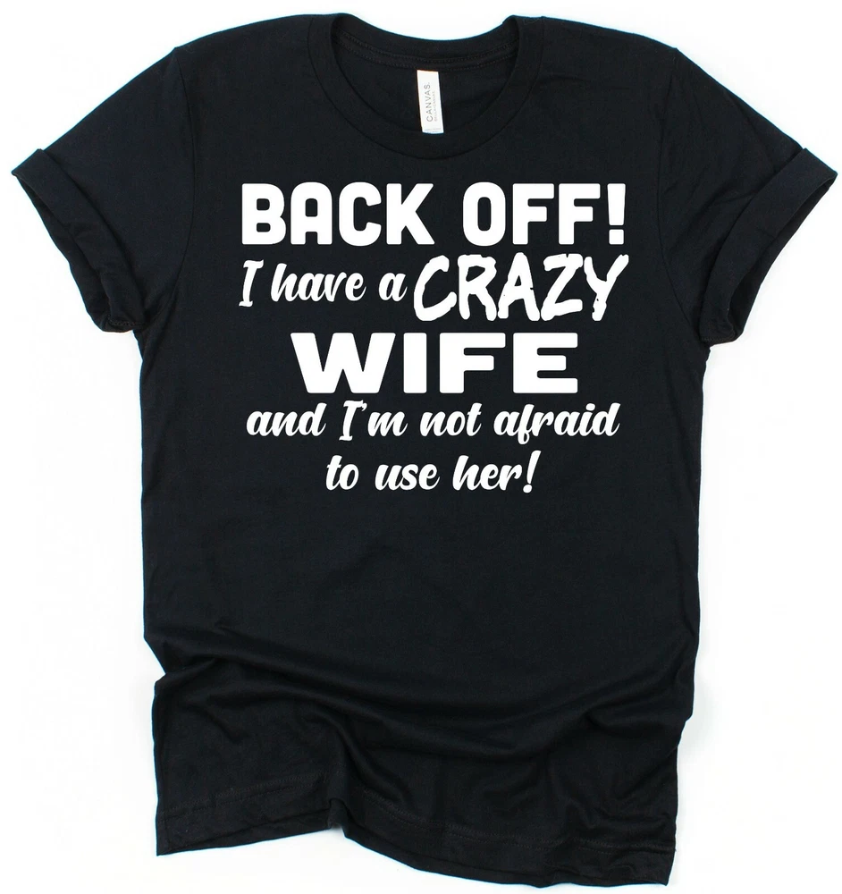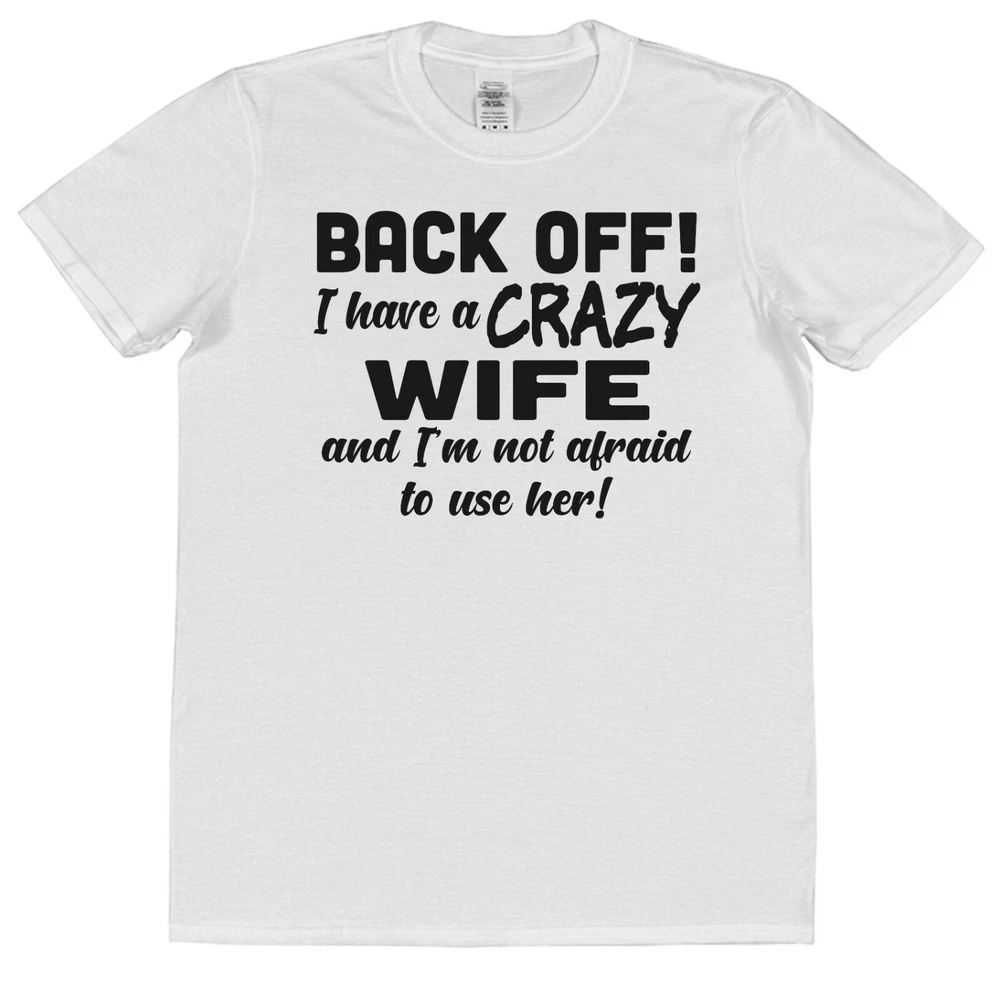 Funny Husband T-Shirt 'Back Off I Have A Crazy Wife and I'm Not Afraid to Use Her!' Brand new 100% cotton. Funny novelty T-shirts make fantastic Christmas presents for couples. This Hubby T-shirt is a unique Valentine's Day gift, anniversary present or wedding present for the groom. Why purchase your T-shirts from Click My Clobber? Our classic regular fit T-shirts are 100% cotton so are comfortable and breathable. They've been made to last with re-enforced seams to eliminate separation and double stitched hem and sleeves for durability. At Click my Clobber, we're specialists in high quality T-shirt printing of cool unique tee’s for men. We give you a comfortable product that will last and last and stay looking great wash after wash. T-shirts like this one make stocking fillers, Christmas presents and birthday gifts. Check out our store, we have something for everyone's taste. T-shirt shopping has never been easier! Important Size Information: Small - Width 46cm, Length 71cm (To fit 34''-36'') Medium - Width 51cm, Length 74cm (To fit 38''-40'') Large - Width 56cm, Length 76cm (To fit 42''-44'') XL - Width 61cm, Length 79cm (To fit 46''-48'') 2XL - Width 66cm, Length 81cm (To fit 50''-52'') 3XL - Width 71cm, Length 84cm (To fit 54''-56'') Width is measured across garment 1cm down from armholes Length is measured from highest point of shoulder to bottom edge of garment. Please feel free to contact us if you have any questions or if you can't find what you're looking for. We always do our best to help.