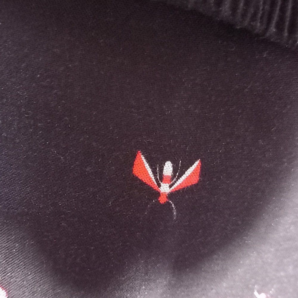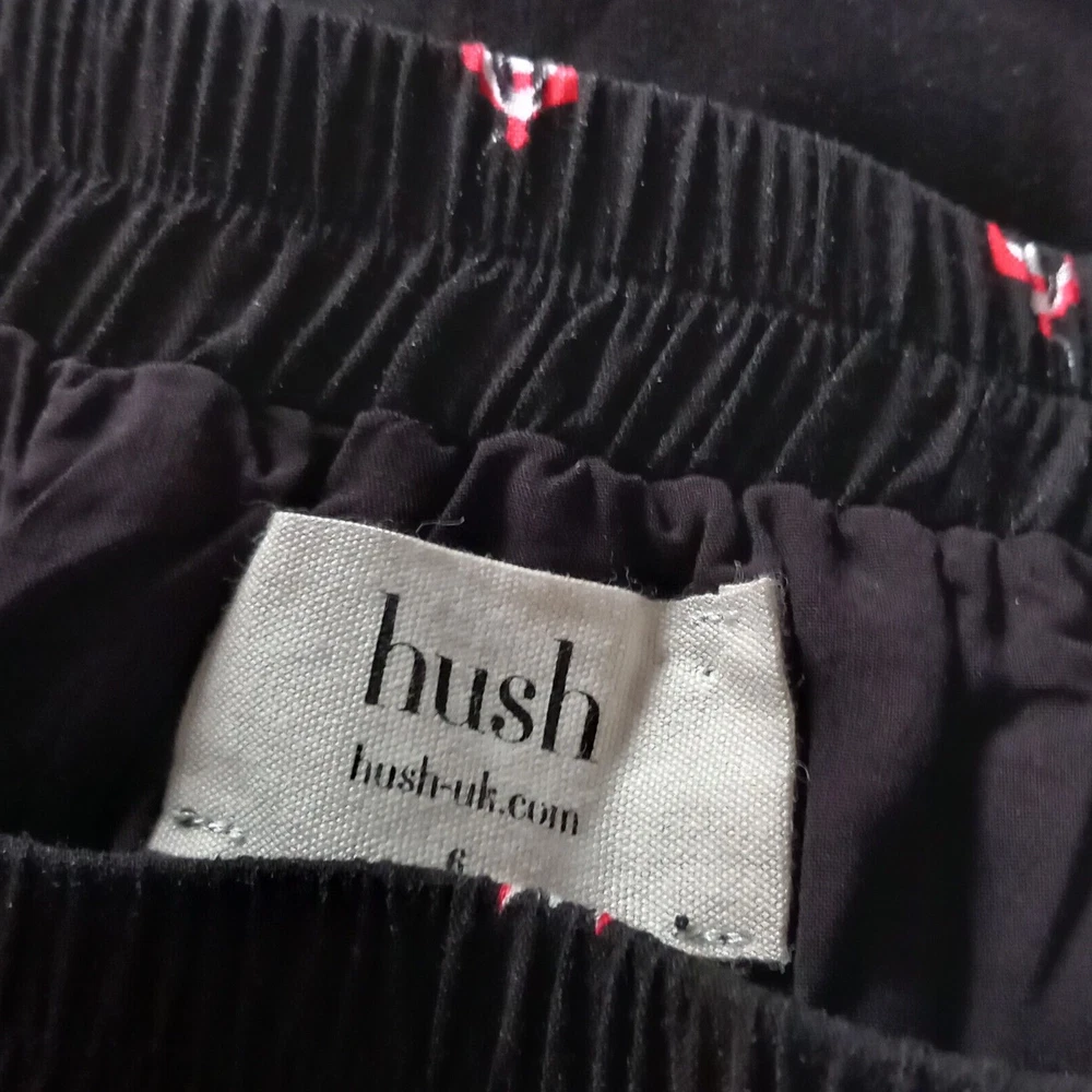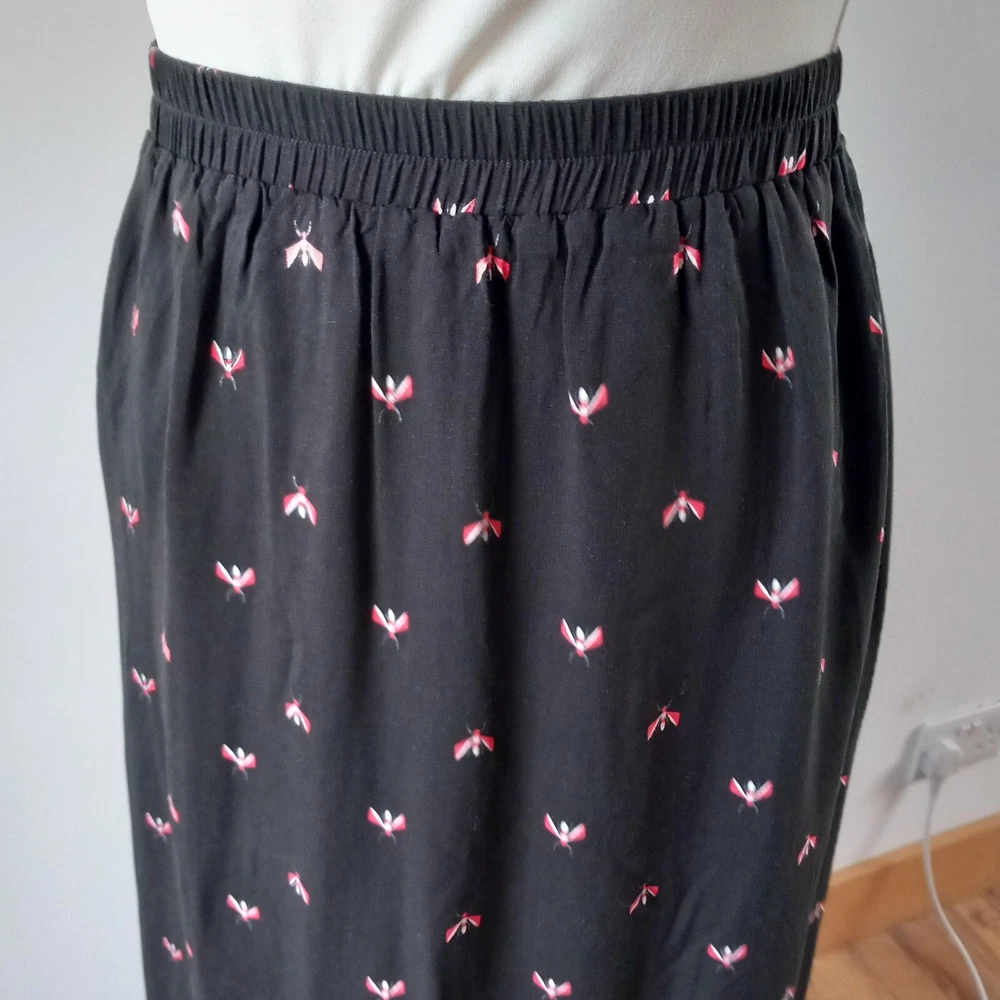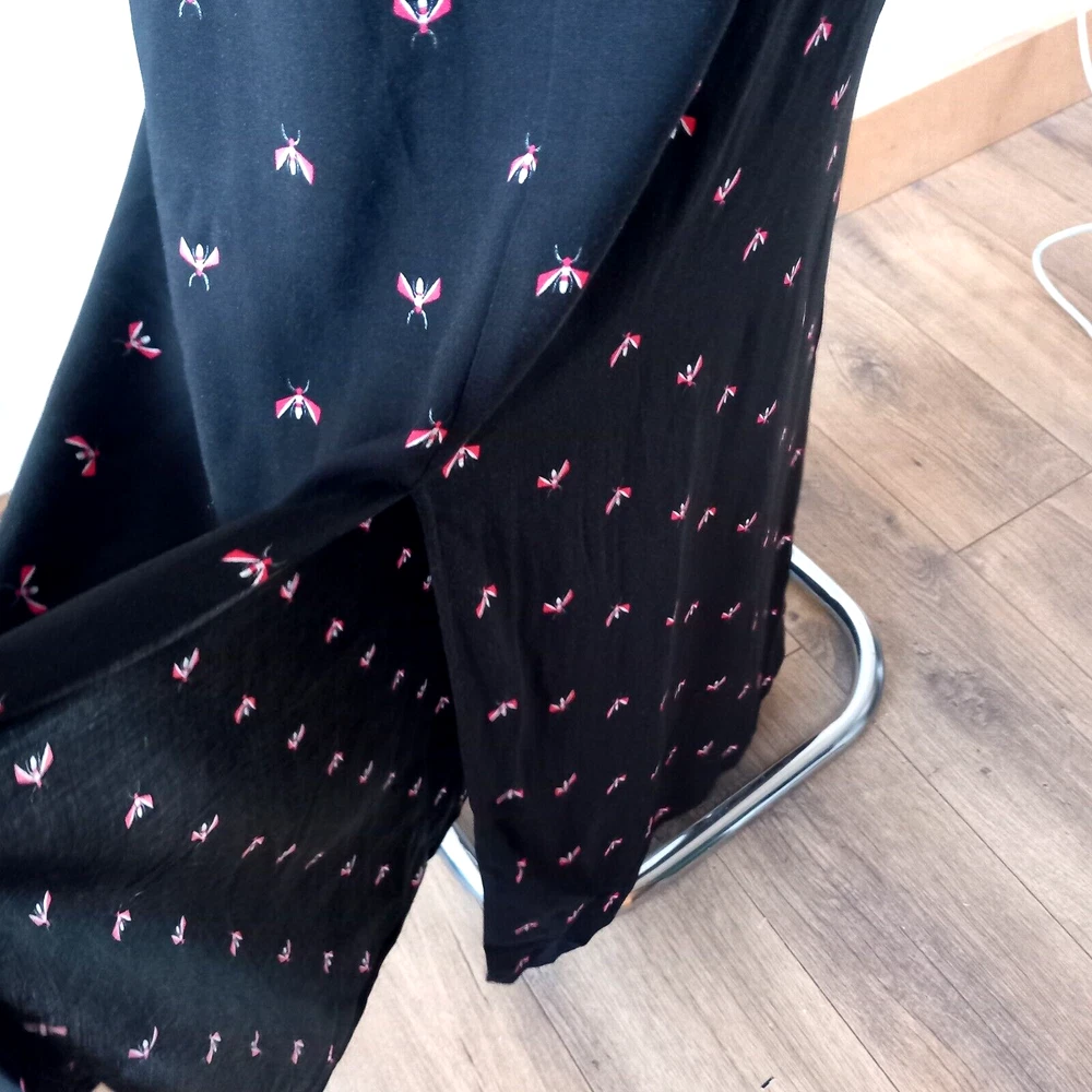 Gently used condition with no faults found. Fab flying insect pattern on black long side split skirt from HUSH. Measures 12" across elasticated waist area which goes up to 14" approx, 18" across hip area approx, 40" long. Part lined. Viscose.