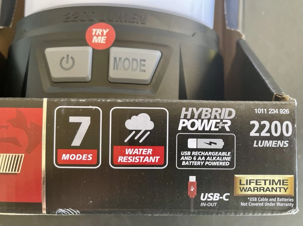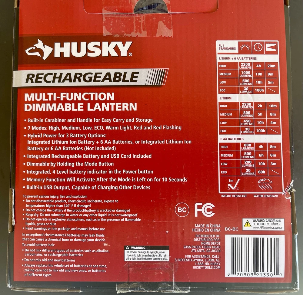 IP Rating:N/AModel:1011 234 926Features:RechargeableBattery Technology:Li-IonItem Length:.Lighting Technology:LEDBrand:HuskyItem Weight:.Color:BlackNumber of LEDs:multiNumber of Lights:7-12Cable Length:NoOperating Range:.Item Width:.Power Source:BatteryType:LanternVoltage:BatteryCountry/Region of Manufacture:UnknownLumens:2200Number of Batteries:4Operating Time:.MPN:1011 234 926Cord Type:CordlessMaterial:PlasticItem Height:.