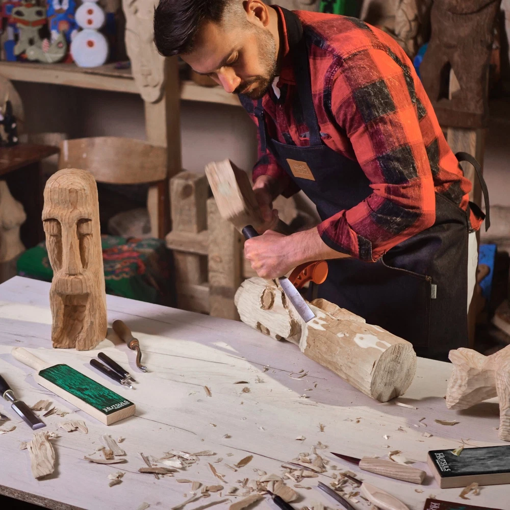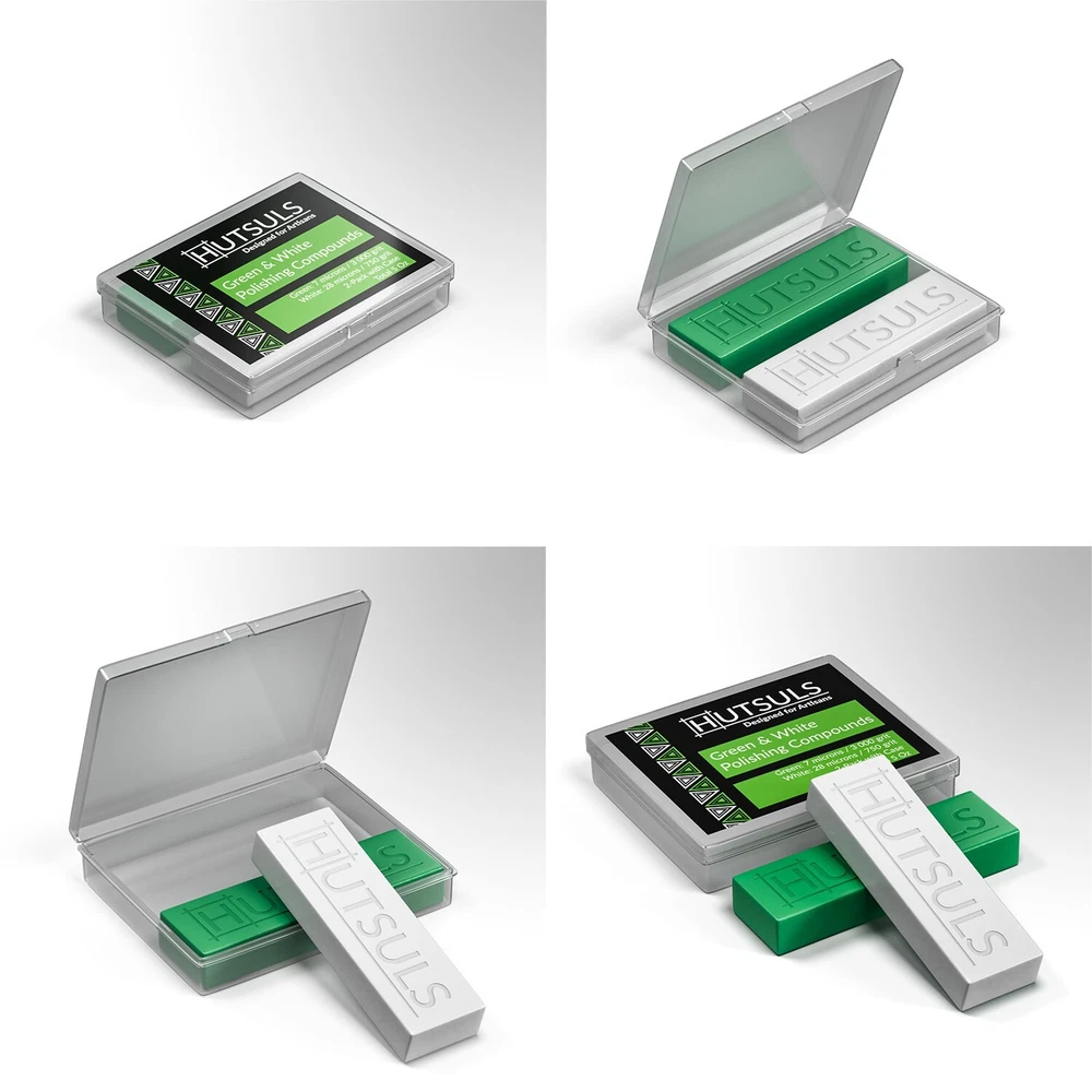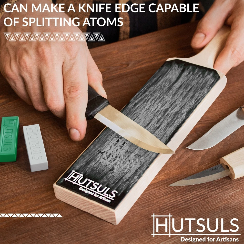 Hutsuls White & Green Strop Compound - Total 5 Oz Get Razor Sharp Edge with Green Honing Compound for Strop, Easy to Use Green & White Stropping Compound for Knives Guide, White Polishing Compound Bar Razor-Sharp Edges: Keep your blades extra sharp with a knife polishing compound set. Use white & green polishing compound bar for honing axes, chisels, broadheads, plane blades, pocket & chef's knives Easy to Use: Using this leather strop polishing compound set is a breeze. This is for professional & beginner use. Includes a step-by-step metal polishing compound stainless steel how-to-use guidance Will Last Years: The fine white aluminum oxide paste and extra fine green aluminum & chromium oxide strop paste in wax bars go a long way in providing years of use. Great value 2 bars, a total of 5 Oz Works Great: White & green buffing compound bars are fast and effective for polishing to a mirror finish. Because of their economy and practicality, wax bars are a go-to format for many sharpeners Easy to Store & Protect: In leather strop compound set is included a functional plastic case. Good sealing prevents green & white strop compound from over-drying, dust, moisture & keeps them organized A Secret to Razor-Sharp Blades If you are seriously into wood carving, you need to keep your knives razor-sharp, and if you are a real artisan, you won’t settle for less than mirror-like blades. That’s just what Hutsuls’ knife strop compound does — it helps you get extremely sharp edges and smooth surfaces with no sweat. Centuries-Long Leather Stropping Tradition The manufacturing of our strop buffing compound is based on the many centuries of experience and professional secrets of Hutsuls, an ethnic group of western Ukraine famous for its wood craftsmanship. With the knowledge passed through the generations of artisans, we know how to hone blades faster and better using high-quality leather strop polishing compound. Our expertise and the quality of Hutsuls’ products are verified by more than 100,000 happy clients around the world. Multipurpose Stropping Compound for Knives and Cutting Tools You don’t have to puzzle over compounds needed to restore the sharpness of your blades anymore. Our set includes abrasives most appropriate for honing and polishing a vast variety of tools: • woodworking tools (wood carving knives, chisels, hand planes) • sports and hunting equipment (folding knives, fish hooks, broadheads) • kitchen knives (chef’s knives, cleavers, kitchen shears) • garden tools (axes, shovels, garden shears) • camping gear (bushcraft knives, hatchets, camping axes) • razors, pocket and utility knives Apply the coarser white stropping compound first to remove deep scratches from soft metals, sharpen dull blades, and give a nice final finish to harder materials. Get on with the extra fine green strop compound to enjoy supreme luster on hard and soft metals. You can use each compound for strop and wheel polishing — just rub it on the heated strop surface or press it against the spinning wheel, and you are ready to go. A Greate Choice for Strop Polishing Compound At a very reasonable cost, you get a money-saving solution for all your sharpening jobs: • 2.5 Oz green polishing compound bar for glossy buffing; • 2.5 Oz white stropping leather compound for cutting and polishing; • a plastic storage case to prevent the compounds from drying out and retain their properties for longer; • step-by-step instructions explaining when and how to use the aluminum oxide bar or the chromium oxide strop paste for the best possible results. The Hutsuls white and green rouge set helps you to keep your cutting tools sharp and ready with a little time and effort spent!