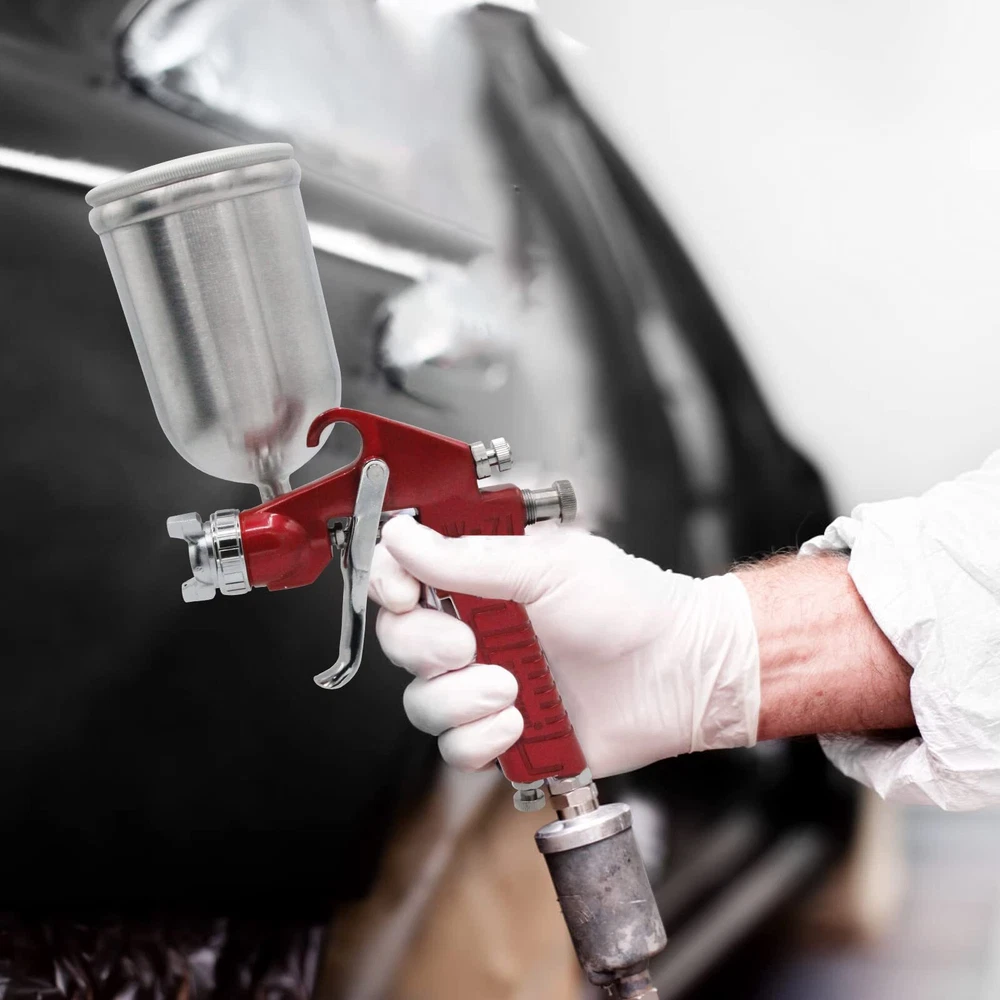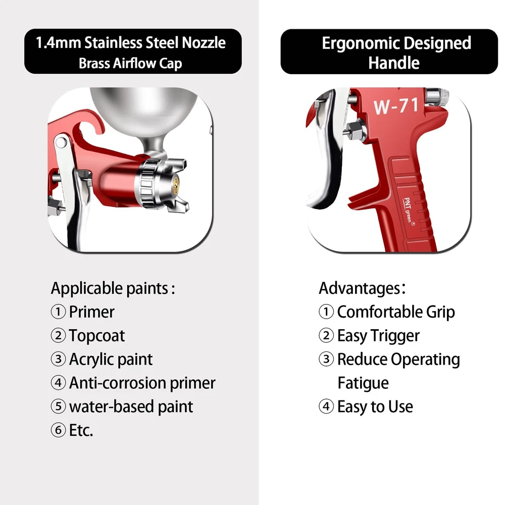 【SPECIFICATIONS】Type of Feed: gravity / Fluid Nozzle:1.5 mm / Air pressure: 3.45 bar (50 PSI) / Air consumption:11 cfm / Paint Capacity:400 CC / Air Inlet:1/4" 【HIGH QUALITY】air compressor spray ’s ergonomic designed handle for comfortable grip. Easy trigger reduce operating fatigue. Simply operate to touch up or painting. 【ADJUSTABLE】Three adjustment valve can flexibility to adjust the liquid volume/ air volume/ spray range to meet your various usage needs, such as car、wall、wood、metal、leather. 【400ML PAINT CUP】400CC detachable gravity feed cup, minimizes waste of paint in the cup and removable for easy cleaning. 【360°ADJUSTABLE NOZZLE】1.5mm stainless steel nozzle, Brass Airflow Cap, nozzle direction can be adjusted 360°by adjusting the nozzle cap, stainless steel material is very durable and can spray most light to medium viscosity materials, used for automotive painting, household appliances, furniture, iron plate, aluminum, plastic, etc.