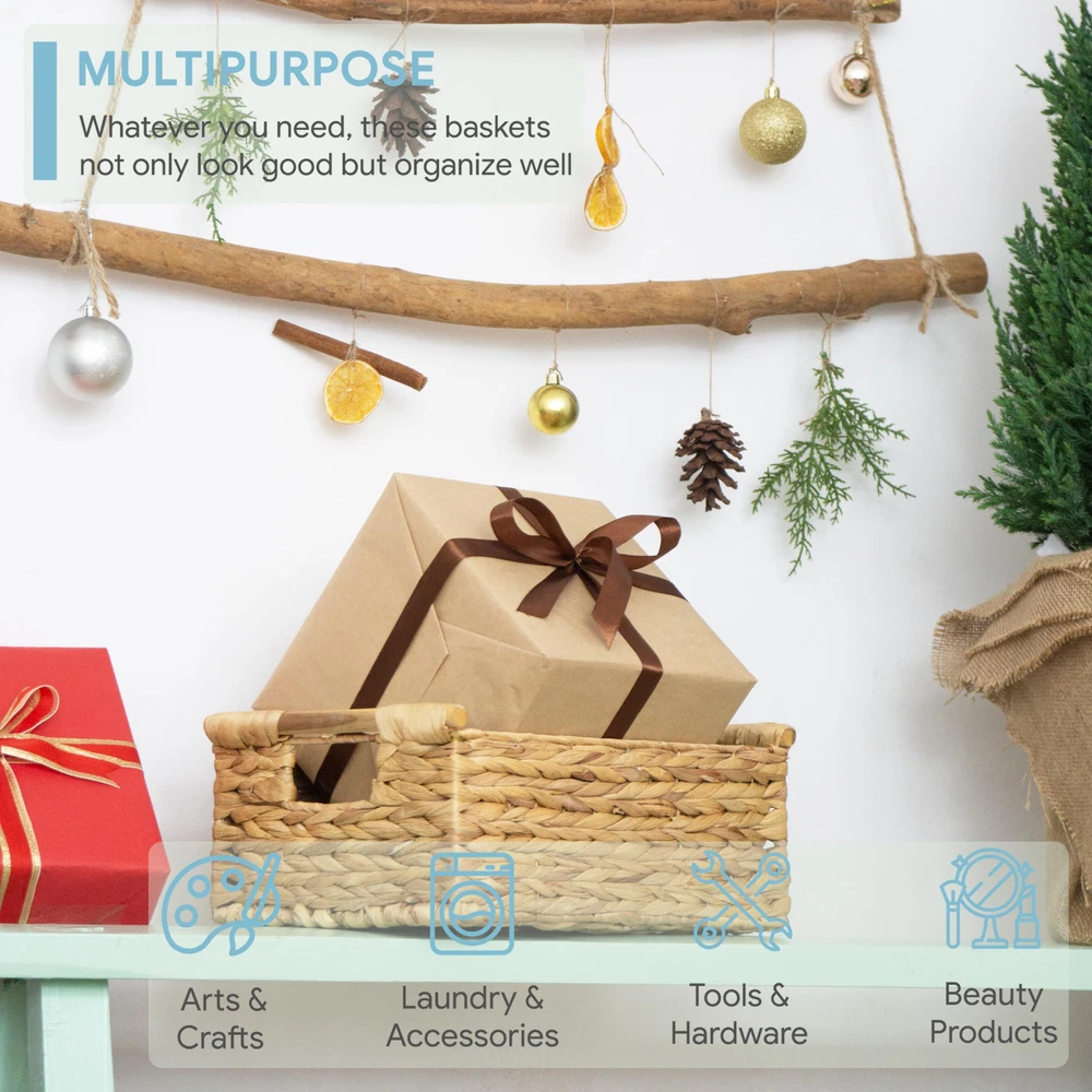 ✅ Convenient and Attractive - Whether it be by way of pure decor, storage, or organization for kitchen, pantry, or bathroom. This natural baskets with handles suit your home in every way. The rectangular baskets wicker is great for magazines, games, pet toys, media, household items. ✅ Natural & High Quality - Our wicker storage baskets for shelf are made of Water Hyacinth, was carefully handcrafted to perfection. It comes with an iron frame for sturdy storage. The wooden handles on both sides are not only pretty but to help you easy to carry the wicker basket. ✅ Ideal For Home - wicker basket with handle is an easy and affordable way to change the style of your home. With it's natural design, the basket storage wicker make nice neutral backdrops and can brighten your day as well as impress your guests. ✅ Medium Wicker Basket: 13.6"L x 9.5"W x 5.6"H. This wicker basket is convenient and easy to storage for drawers, shelves, desks, or anywhere in the house. Please note that this item is just single medium wicker storage baskets, is handmade and the sizes may vary ±1 inch. ✅ The Best - With our famous 100% satisfaction, you can have peace of mind. If for any reason you're not completely happy with your purchase- if it breaks, if it's damaged in shipping, or any other reason - simply let us know and we will definitely assist you!