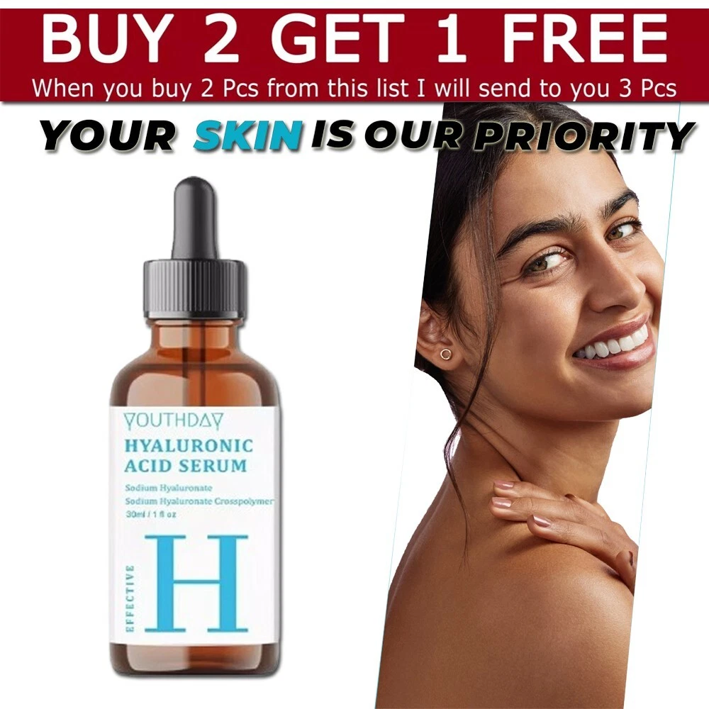 WHEN YOU BUY 2 PCS FROM THIS LIST I WILL SEND TO YOU 3 PCS Youthday Hyaluronic Acid Serum for Skin 100% Pure Anti Aging Serum Intense Hydrat ๐ง๐ข๐ฃ ๐ฎ๐ฌ๐ฎ 4 * Hyaluronic Acid Face Serum - 2.5% Pure Hyaluronic Serum + 3% B5, Anti Wrinkle + Anti Aging Serum for Face with Vitamin C & E, Aloe - Antiaging Hydrating Serum, Hylunaric Acid Serum Nuttrel Hydration Serum, Hyaluronic Acid Serum for Face, Deep Hydrating Serum - Delivers long-lasting hydration to help prevent future dehydration Hyaluronic Acid Serum, Non-Greasy Hydrating Face Serum with Pure Hyaluronic Acid, 1 oz / 30 ml Apply On All Skin Types Suitable for Men and Women Both Skin Care Use In Morning and Night ( AM/PM ) Looking Younger, Improve Skin Elasticity, Improve Skin Texture, Reduce Anti Aging, Wrinkles, Fine Lines, Gives Long Lasting Hydration. Hyaluronic Acid Serum, Made From Pure Hyaluronic Acid, Anti Aging/Wrinkle, Ultra-Hydrating Moisturizer That Reduces Dry Skin Manufactured By USA Formula. Note: This Product is designed to deliver optimal results, offering high-quality performance and satisfaction. Please note that individual experiences and outcomes may vary based on personal use, preferences, and unique circumstances. For best results, we recommend following the provided guidelines and ensuring the product is used as intended. Product result may vary for every individual.