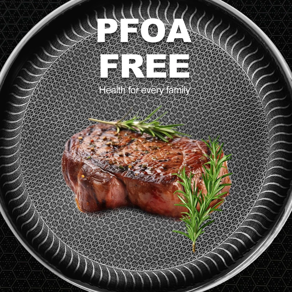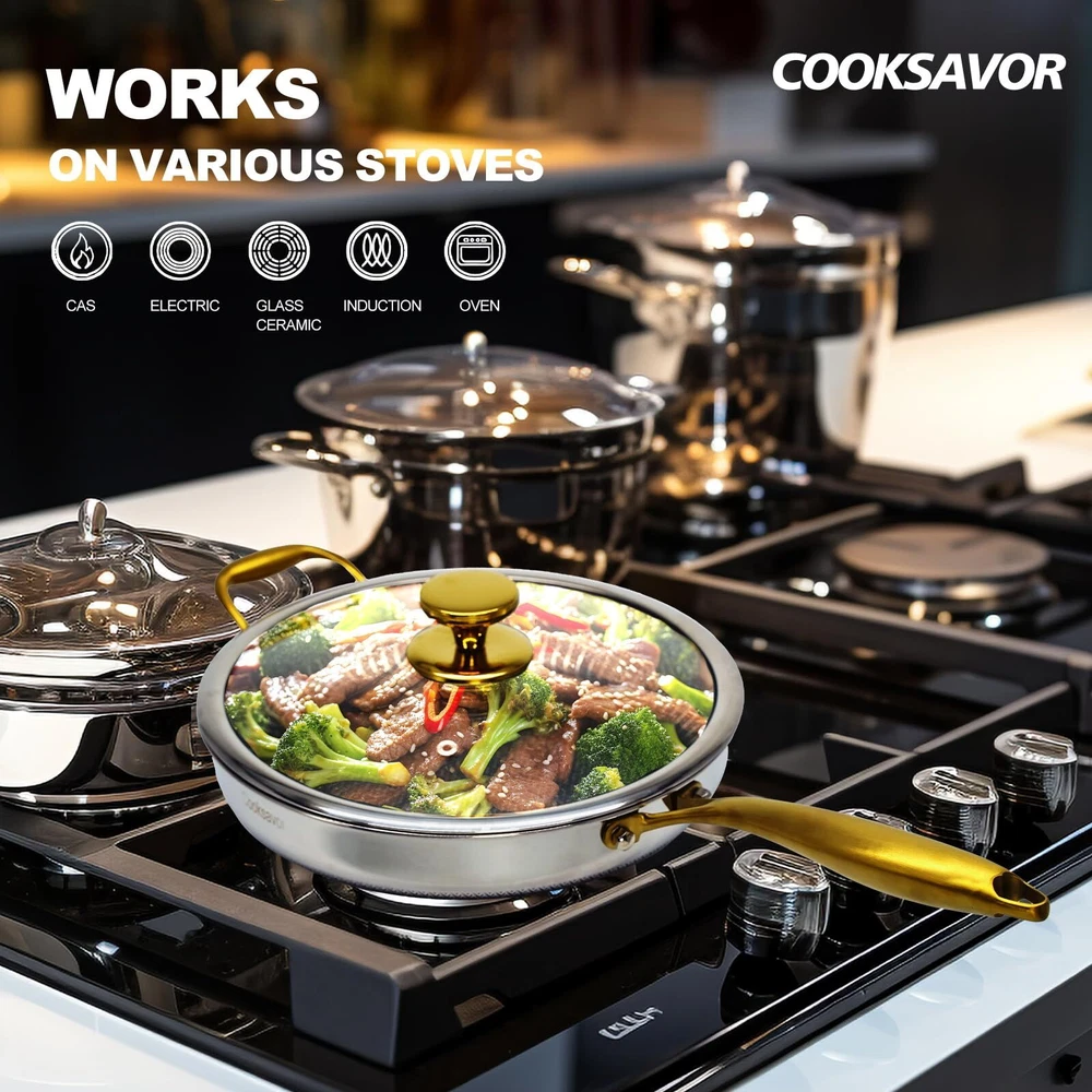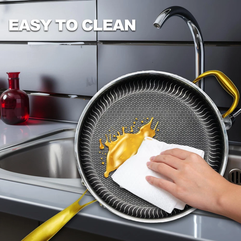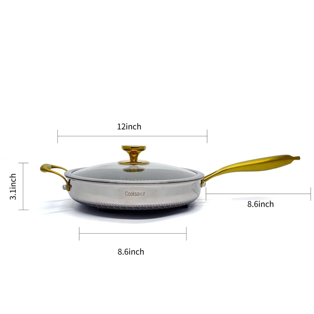 Honeycomb-Snowflake Technology: Stainless Steel Cookware uses a multi-layer structure - laser-etched non-stick surface on the bottom of the pots and pans (honeycomb on the outside and snowflake on the inside), which makes the surface of the bottom of the pots and pans smooth, so that the food is not easy to stick to the pots and pans, and there is no need to use too much fat during the cooking process. Energy Saving: Our stainless steel pans have a composite polymerization bottom, which not only can be adapted to various stovetops, but also allows for even heating, which makes food cook faster, reduces cooking time and saves energy. Quality Material: Honeycomb Stainless Steel Non-Stick Cookware is made of high quality stainless steel material with good wear resistance, corrosion resistance and durability, not easy to deform and wear. Easy to Clean: stainless steel pans have a nonstick easy-clean layer that makes cleaning easy and effortless, are scratch-resistant, dishwasher safe, and oven temperature should not exceed 500°F. Comfort Handle and Glass Lid: The ergonomic dark gold stainless steel handle gives you a firm grip and comfortable handling during cooking. The hollow design of the handle keeps the handle cool to avoid overheating and burning.