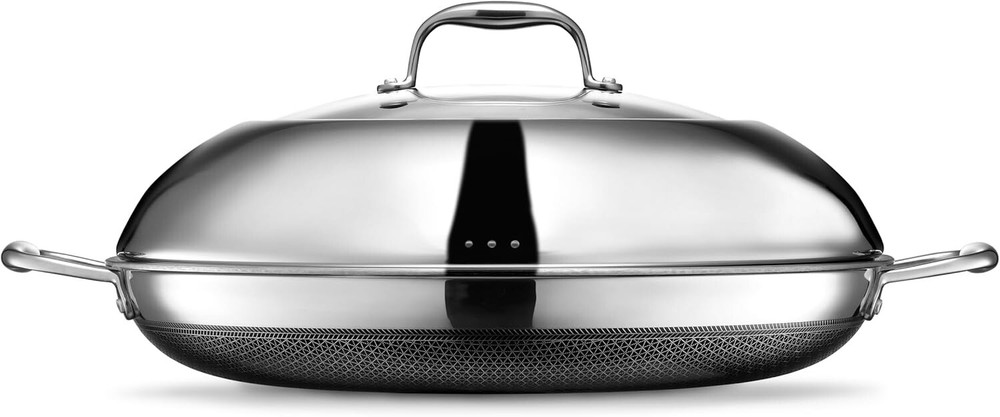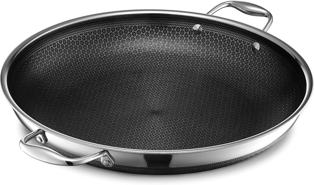 HexClad Hybrid Nonstick 14-Inch Frying Pan with Steel Lid, Great for Braising, Dishwasher and Oven Safe, Induction Ready, Compatible with All Cooktops Shipping & Delivery Ships from the U.S. : All orders are shipped from our U.S. warehouse. Processing Time : Orders are processed and shipped within 3 business days (excluding weekends and holidays) after receiving your order. Delivery Time : Packages typically arrive within 3-4 business days, excluding remote areas . About this item HexClad's patented hybrid tech utilizes tri-ply construction – aluminum between two layers of stainless-steel - laser-etched with our hexagonal nonstick surface to deliver the searing power of stainless, durability of cast-iron and easy cleanup of nonstick. An excellent choice for stove-top to oven cooking, the Hybrid 14-inch Pan combines the ultimate capacity to braise or steam your favorite dishes with a matching see-through domed lid for convenient monitoring. Use your HexClad cookware on any home cooktop or stovetop, including induction. Every piece is also scratch-resistant, dishwasher-safe, and oven-safe up to 500°F. (Lids are oven-safe up to 400°F.) Your purchase includes one HexClad 14" Pan and accompanying Domed Steel Lid. The 14" Pan measures approximately 14 inches in diameter, 2.5 inches in height and 6.5 lbs in weight with the lid included.