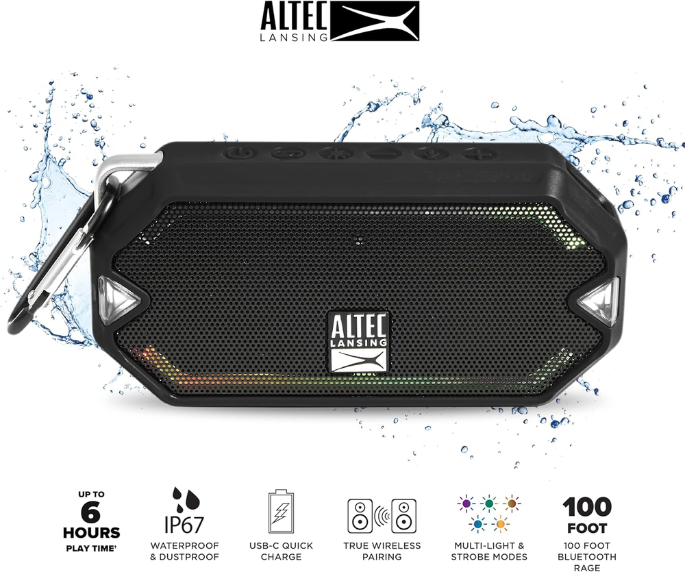Small Form, Big Sound: This everything proof speaker is compact, lightweight, and easy to carry yet delivers deep and loud audio so you can listen to music the right way making it ideal for camping, backyard parties, beach trips, and any other occasion Light Up The Party: The outdoor Bluetooth speakers feature built-in LED lights with 5 LED light modes that beat, strobe, and pulse to the music making them the ideal choice for adding more excitement and fun to any party or event effortlessly For All Your Adventures: Our portable Bluetooth speaker is waterproof, snowproof, dirtproof and more so you can safely take it with you on all your outdoor trips and travels to enjoy listening to the tracks you love anytime and anywhere you want Don’t Let The Music Stop: The portable wireless speaker delivers up to 6 hours of playtime while being compact enough to easily fit in your pocket and features a carabineer clip that lets you clip the Bluetooth speaker to your briefcase, luggage, belt, backpack, etc. IP67 Everything Proof: Whether it’s water, snow, or dirt, our waterproof Bluetooth speakers for outdoors have you covered. They are IP67 Everything Proof and maintain a stable connection with any Bluetooth device for simple and convenient use Waterproof, Snowproof, Dustproof, Shockproof – The Right Speaker For Your Adventurous Spirit! Altec Lansing HydraMini Bluetooth speaker is designed with women and men in mind that want to enjoy their time in the outdoors while listening to their favorite songs. It’s compact, lightweight, and sturdy to stick with you in any environment or weather without any hassles. Compact, Portable & Ready For Travel Whether you’re playing songs at home or in the outdoors, our outdoor Bluetooth speaker has you covered. Thanks to the compact design coupled with the sturdy build it makes the perfect companion for all your adventures and can be attached to your belt or backpack with ease. Long Battery Playtime & Wide Compatibility Our waterproof speaker for outdoors delivers deep and clear sound by pairing up seamlessly with almost any device that supports Bluetooth to stream music directly from it. The Bluetooth speaker with lights offers up to 6 hours of playtime making it ideal for road trips and parties. Features You’ll Love: - Uses a USB-C charging port so you can quickly recharge it - Can be paired with another Altec Lansing HydraMini to boost sound - It’s small enough to fit inside your pocket with ease - Can be used anywhere without worrying about the elements - Offers 5 LED light modes to match the vibe of your party Keep The Music Going & Have Fun With Altec Lansing HydraMini Bluetooth Wireless Speaker!