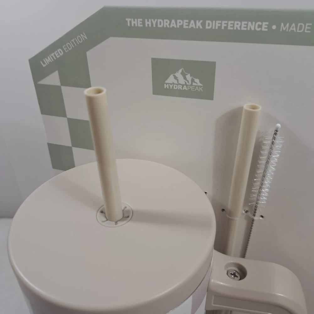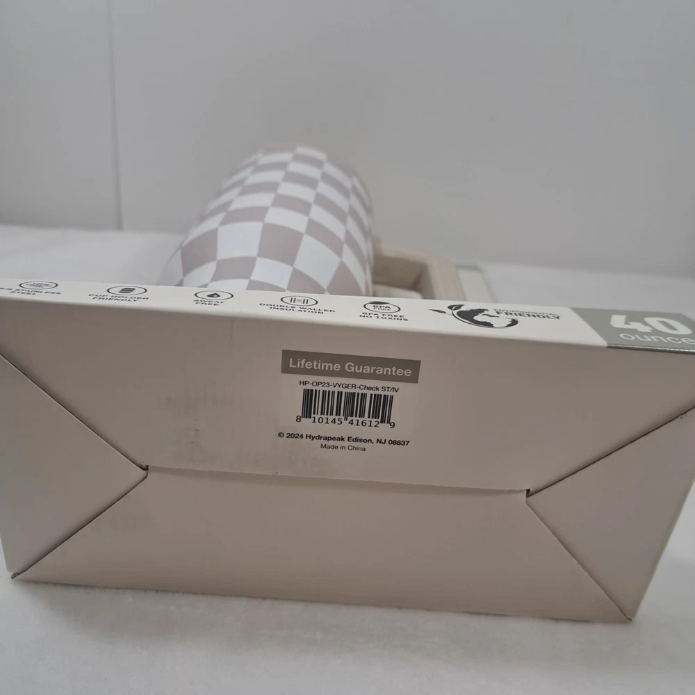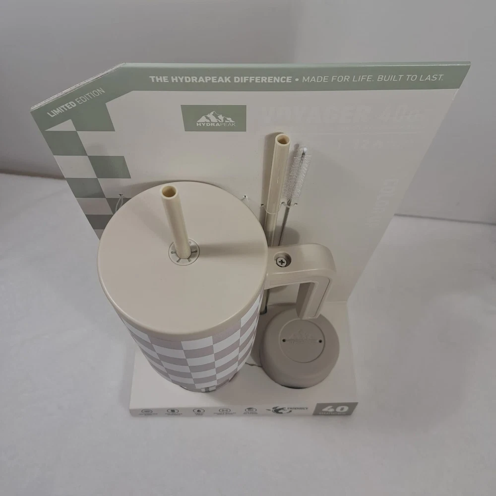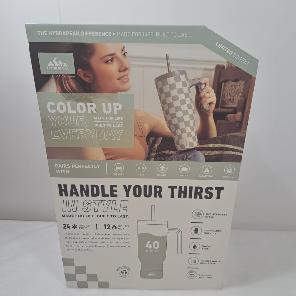 Introducing the Hydrapeak Voyager 40oz Steel Tumbler, a perfect combination of style and durability. This tumbler features a push cap top type and comes in a limited edition cream checkered design with a handle for easy grip. The tumbler is made of stainless steel material and is BPA-free, sweat-free, and reusable. It has a locking mechanism, refillable feature, and a double wall that ensures insulation. The tumbler also comes with a straw cleaner and protective silicone boot for added convenience. With a lifetime manufacturer warranty, this tumbler is a reliable choice for anyone on the go. Items are carefully inspected and sealed after photos. We carefully pack and ship out fast! We ship daily with one day handling