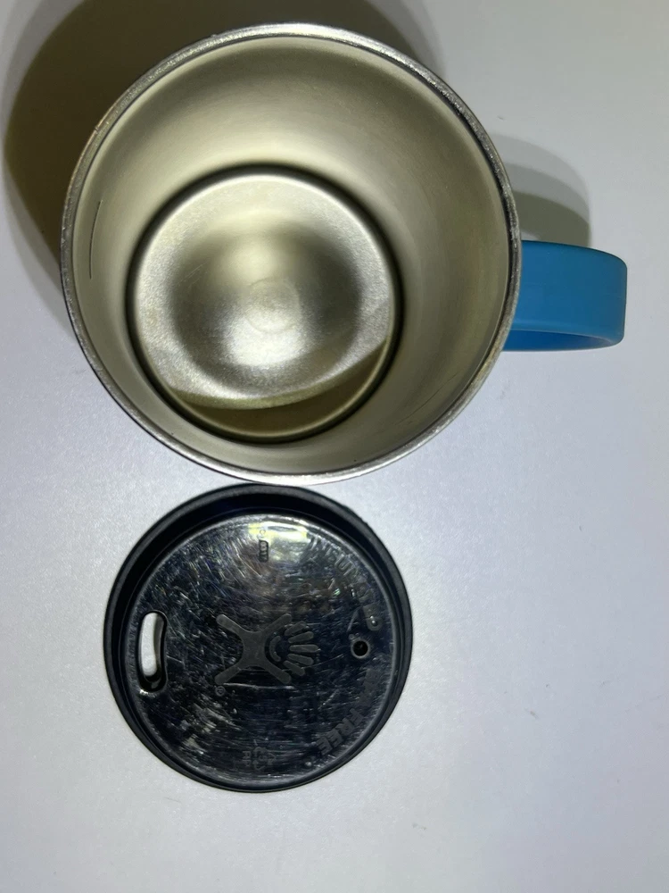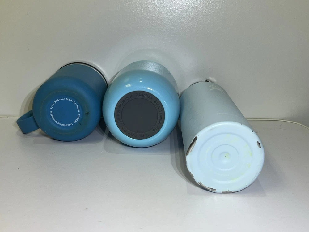 Hydroflask + WayEee Cup Lot (3pcs) H2O Bottle, Coffee Cup, And Soup Canister All of the cups are in good shape Were cleaned really well and have no stains or smells All are vacuumed sealed stainless The 22 oz tall hydroflask has a few chips on the paint near the bottom and one dent in the side but it still stands up straight and is in good shape.