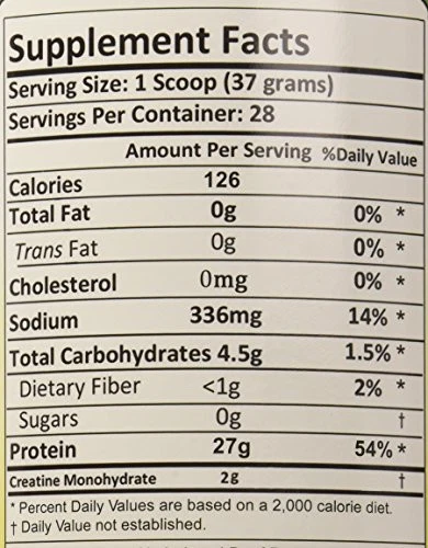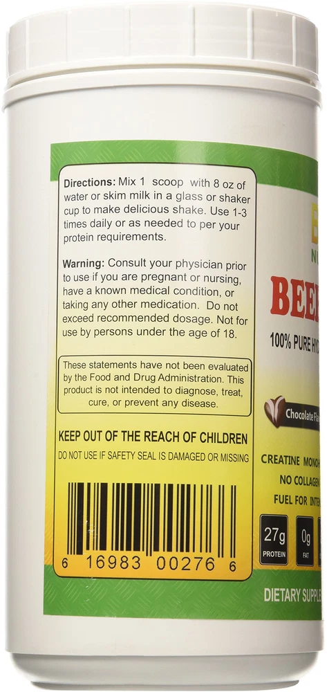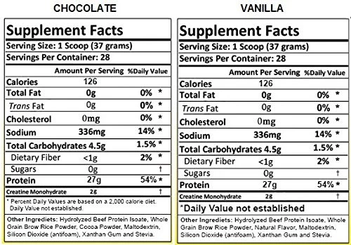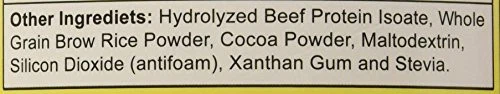 100% PURE HYDROLYZED BEEF PROTEIN ISOLATE CREATINE MONOHYDRATE LOADED NO COLLAGEN OR GELATIN FUEL FOR INTENSE WORKOUT D i r e c t i o n s : Mix 1 scoop with 8 oz of water or skim milk in a glass or shaker cup to make delicious shake. Use 1-3 times daily or as needed to per your protein requirements. W a r n i n g : Consult your physician prior to use if you are pregnant or nursing, have a known condition, or taking any other . Do not exceed recommended dosage. Not for use by persons under the age of 18. 390% more concentrated than steak. No collagen or gelatin. Creatine Monohydrate Loaded. 100% Pure Hydrolyzed Beef Protein Isolate. Fuel for workout. Delicious Chocolate Flavor.