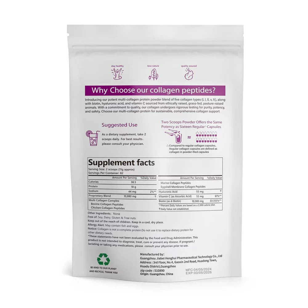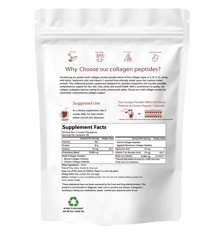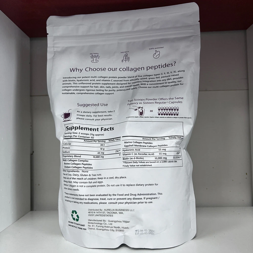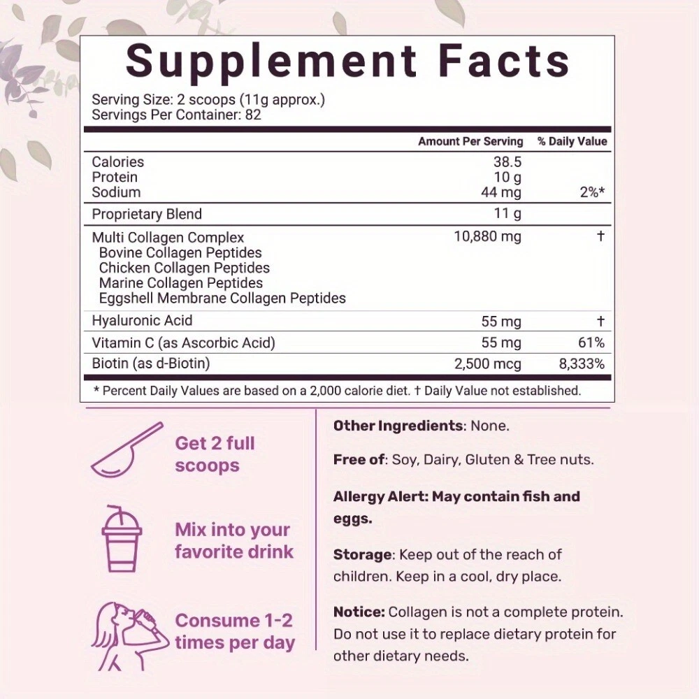 Description&Preview shipping&policy Description: Describe Net content: 1LB, 2LB,3LB Features 1. Multiple collagens, rich in collagen types, have a more comprehensive skin and joint maintenance effect. 2. Ultra-high purity collagen powder can be better absorbed and utilized by the body, allowing you to have better health and beauty from the inside out. 3. Does not contain any additives or preservatives, completely natural ingredients, safer and healthier. 4. The unique formula combines a variety of nutrients. In addition to beautifying the skin, it can also nourish hair, nails and other parts. 5. Popular and convenient way of taking, easily added to milkshakes, juices, coffee or other foods, making daily consumption effortless. Comment: 1. Manual measurement tolerance is 2-5g. Please don't mind your substitution. 2. Due to differences between different monitors, the image may not reflect the actual color of the item. Thank you so much! 3. SKU color is the color of product packaging Package Included: 1/2/3*collagen powder Preview: