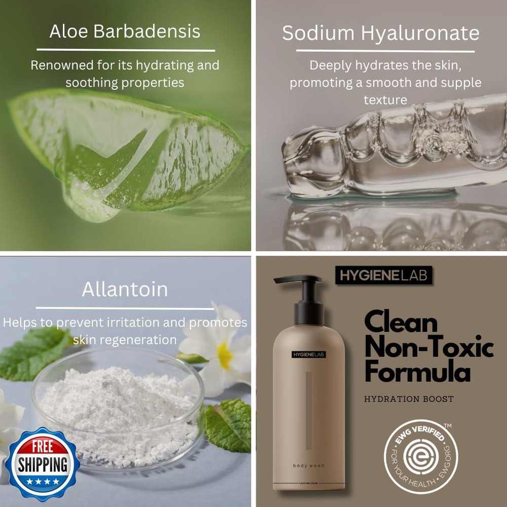 HygieneLab Mens Natural Body Wash - Ultra Hydrating, EWG Verified Clean Formula, Lavender Sands Scent, Sulfate-Free, Paraben-Free, Phthalates-Free, Gentle and Effective for Healthy Skin (10 oz) Features VERIFIED CLEAN BY EWG: With thousands of consumer products on the market, it can be overwhelming to know which ones are safe and healthy. The Environmental Working Group (EWG) Verified mark does the work for you. When you see the EWG Verified mark on a product, you can be sure it's free from EWG chemicals of concern and meets their strict standards for your health. FREE FROM HARMFUL CHEMICALS: Our body wash is paraben-free, sulfate-free, phthalate-free, and fragrance-free. Enjoy peace of mind knowing that your skin is being cleansed without exposure to harsh or synthetic additives. NOURISHING AND HYDRATING FORMULA: Enriched with Aloe Vera Leaf Juice and Sodium Hyaluronate, our body wash deeply hydrates and soothes your skin, leaving it feeling soft and refreshed after every use. NATURAL AROMAS: Infused with the natural essence of Lavender Oil and Sandalwood Oil, this body wash offers a relaxing, spa-like experience, helping to calm your senses and rejuvenate your skin. FULL TRANSPARENCY & MADE IN CALIFORNIA: Our commitment to clean, effective ingredients ensures you can trust what you are putting on your body with 100% ingredient transparency. Shipping Free & Fast Shipping: We offer free shipping to most of the USA with a normal delivery time of 3-7 days. However, due to the current situation, additional delivery time (up to 3 weeks) may be required for some items. Alternative Carriers: We may use alternative carriers (e.g., USPS, FedEx, UPS) to ensure your package arrives safely and on time. Due to the use of multiple carriers, we are unable to provide a tracking number automatically. Handling Time: Orders are processed and shipped within 1-2 business days of receiving cleared payment. Shipping Restrictions: Shipping to Alaska, Hawaii, Puerto Rico, Guam, and other US territories may incur shipping charges or delivery restrictions. Please contact us before ordering, or your order can be refunded/cancelled. State Restrictions: Certain items may not be shipped to California due to state regulations. Contact for Tracking Updates: If you require tracking updates or have any concerns about the delivery of your order, please feel free to contact us, and we will be happy to assist you. Return Policy 30-Day Hassle-Free Returns: If you are not completely satisfied with your purchase, you can return the item for free within 30 days of receiving it for a full refund or exchange. Easy Return Process: Contact us, and we will provide you with a prepaid return shipping label and detailed instructions. No Restocking Fee: There are no restocking fees for returns. However, the buyer is responsible for return shipping costs if the return is not due to a seller's error. Refund Processing: Refunds will be processed within 1 business day of receiving the returned item in its original condition. Feedback Your feedback is extremely important to us. We strive to provide the best products and customer service possible. If you are satisfied with your purchase, please take a moment to leave us a positive review. If you have any concerns or issues with your order, please contact us before leaving negative feedback. We are committed to resolving any problems and ensuring your satisfaction. Contact Us If you have any questions or concerns, please feel free to reach out to our customer support team. You can contact us through the eBay messaging system. We are available Monday to Friday, 9:00 am to 5:00 pm EST, and we will do our best to respond to your inquiry within 24 hours. Thank you for supporting our small family business!