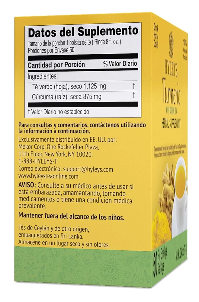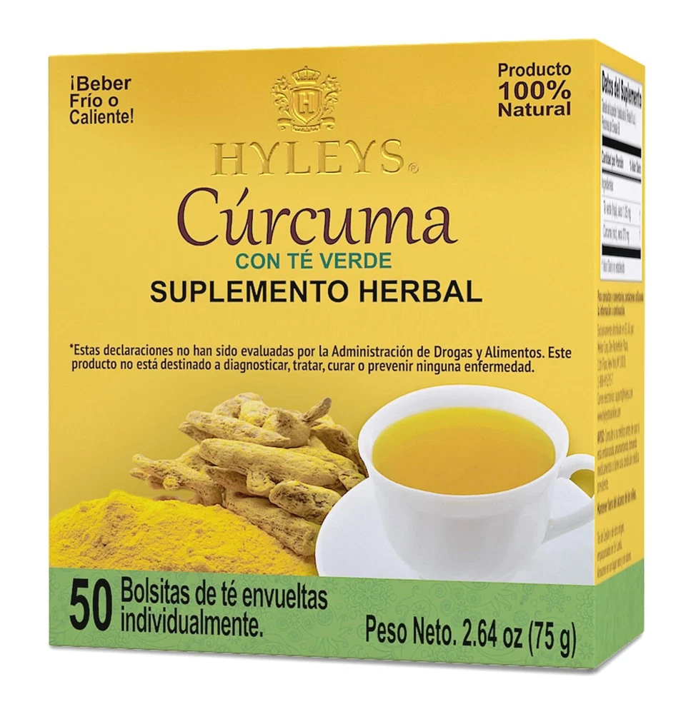 Natural Antioxidant Blend: Combines the powerful natural antioxidants of green tea and turmeric for a revitalizing tea experience. Rich Flavor Profile: Enjoy the robust flavors of green tea paired with the earthy notes of turmeric in every cup. Versatile Tea Experience: Ideal for both morning energizing and evening relaxation. Pure Ingredients: Made with all-natural ingredients, ensuring a clean and wholesome tea experience. Conveniently Packaged: Each box contains 50 individually wrapped tea bags, perfect for maintaining freshness and flavor. Experience the Vibrant Blend of Hyleys Turmeric & Green Tea Unlock the natural goodness with Hyleys Turmeric & Green Tea, a perfect combination crafted for those who appreciate the essence of natural herbs. This tea blend marries the earthy depth of turmeric with the refreshing vigor of green tea, creating a delightful beverage that's both flavorful and invigorating. Why Choose Hyleys Turmeric & Green Tea? Rich in Natural Antioxidants: Each sip offers the combined antioxidant properties of turmeric and green tea, known for supporting vitality. Soothing and Refreshing: Perfect for any time of the day, this tea blend provides a soothing yet refreshing drink that can be enjoyed both hot and iced. Quality and Simplicity: Made from 100% natural ingredients, this tea is free from artificial additives, aligning with a health-conscious lifestyle. Easy to Prepare: Each tea bag is individually wrapped to preserve freshness and ensure that every cup is as flavorful as the last. Enhance your daily tea routine with Hyleys Turmeric & Green Tea. Whether starting your day with an energizing cup or winding down in the evening, this tea is a perfect choice for anyone seeking to enjoy the natural benefits of these two powerful herbs in one delightful cup. Make Hyleys Turmeric & Green Tea a part of your daily routine and savor the taste of natural wellness in every cup.