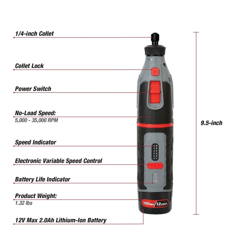 The new Hyper Tough 12V Max Cordless Rotary Tool is perfect for detailed work, offering versatility with its 40-piece accessory kit. Powered by a 12V 2.0Ah lithium-ion battery, it delivers variable speeds from 5,000 to 35,000 RPM with a max setting for more demanding tasks. The tool features a battery capacity indicator and LED speed controls, allowing easy adjustments via Add & Subtract buttons. Weighing just 1.32 lbs, it’s lightweight and comfortable to use for extended periods. The kit also includes a charger, making it ideal for any project requiring precision and control. Hyper Tough 12V Max Cordless Rotary Tool with 40-Piece Accessory Kit Includes 12V 2.0Ah Lithium-Ion Battery and Charger Variable speeds (6 + MAX setting) Battery capacity indicator LED indicator for variable speed via Add & Subtract button 1.32 lbs product weight No-Load speed 5,000-35,000 RPM New