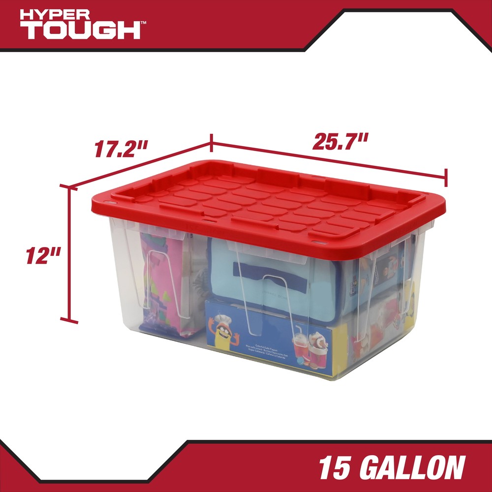 Introducing the sturdy and dependable Hyper Tough 15 Gallon Plastic storage container, your go-to solution for effortless organization and storage for all ages. Built for durability, this container is designed to withstand daily use, ensuring your valuables remain safe and secure. Its clear construction with a red lid allows for easy viewing of contents, eliminating the need to search through opaque bins. The 2-point red Snap Lid closure provides a tight seal, protecting your belongings from dust and damage. These containers are not just durable but also space-efficient with a stackable design. Whether stacked high or nested together, Hyper Tough maximizes your storage potential without compromising accessibility. Hyper Tough 15 Gallon Clear Storage Bin, Red Lid, Storage for all ages 15 Gallon Capacity, 60 Quarts Outer Dimensions: 25.7" W x 17.2" D x 12" H (65.2cm x 43.6cm x 30.4cm) Weighs 4.60 pounds Comfort carry handles Easy to clean surface, wipe with damp cloth Stacks up to 5 storage bins high for maximum vertical storage