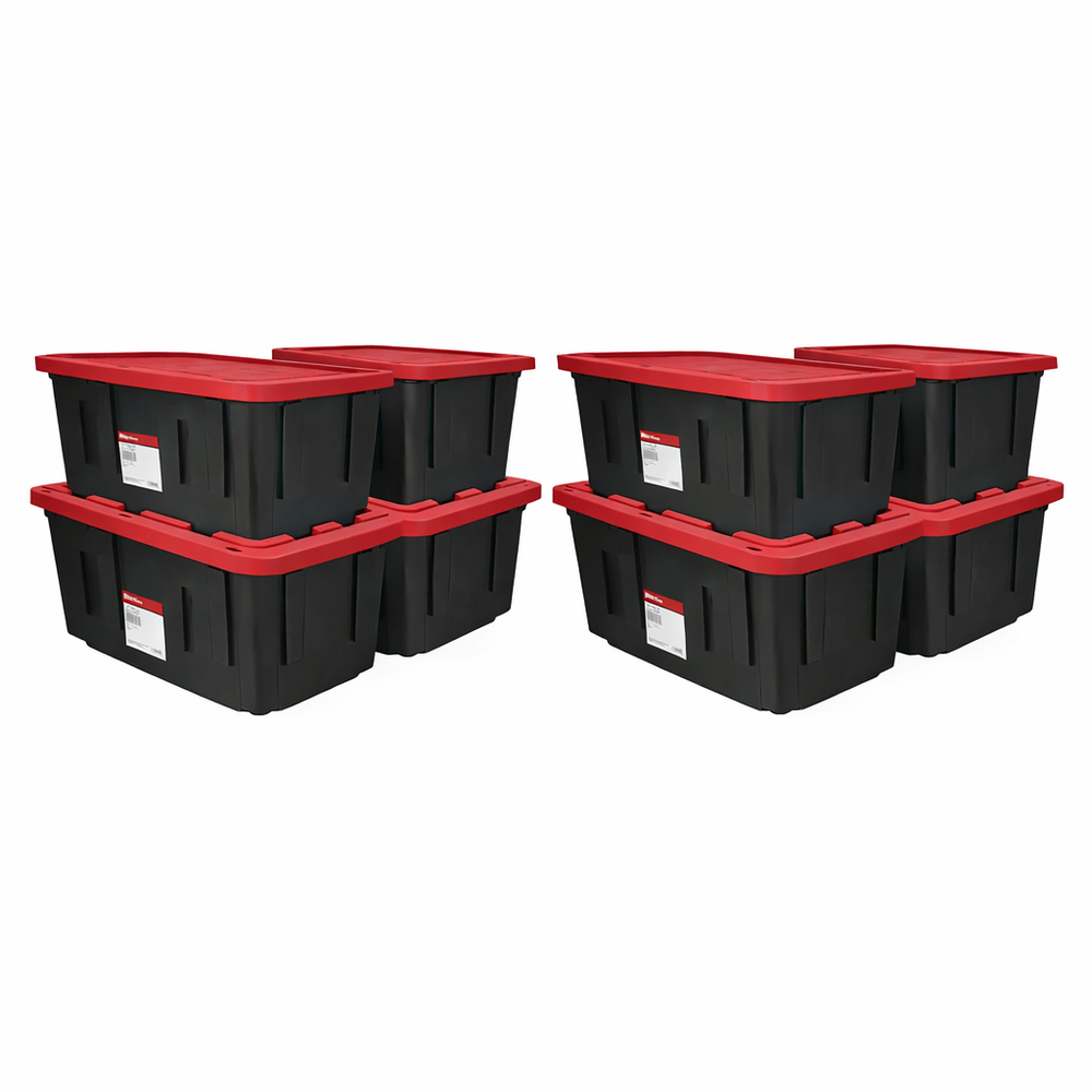 Product Description Organize clutter and protect your belongings with the Hyper Tough 27 Gallon Snap-Lid Plastic Storage Tote . Designed with a durable black base and a high-visibility red lid , this heavy-duty storage bin keeps items neatly hidden while making identification quick and easy. Constructed from tough polypropylene plastic , this storage tote resists rust, dents, stains, and peeling for long-lasting use. The 2-point snap-fit lid keeps contents securely in place during storage or transport. Specially molded lids allow multiple totes to stack safely without toppling , helping you maximize vertical storage space. For added security, the lid features 6 tie-down holes , making it easy to secure items using zip-ties or padlocks (not included). Ideal for use in basements, closets, garages, sheds, barns, attics, or pantries, this versatile storage tote is perfect for organizing everything from household supplies to seasonal gear. Key Features Large 27 Gallon Capacity – Ideal for bulky and heavy storage needs Durable Polypropylene Plastic – Resists rust, dents, stains, and peeling Secure Snap-On Lid – 2-point snap-fit design keeps contents contained Stackable Lid Design – Molded lid provides stability when stacking multiple totes Lockable Lid – 6 tie-down holes for zip-ties or padlocks Easy-to-Clean Surface – Wipes clean with minimal effort Indoor & Outdoor Use – Suitable for home, garage, shed, or attic Reusable & Long-Lasting – Built for repeated everyday use Made from Recycled Materials – Eco-conscious construction Specifications Product Type: Plastic Storage Tote / Storage Bin Brand: Hyper Tough Capacity: 27 Gallons Material: Polypropylene Plastic Color: Black Base with Red Lid Shape: Rectangle Stackable: Yes Lockable: Yes (zip-ties or padlocks not included) Recommended Location: Indoor / Outdoor Exterior Dimensions (W × D × H): 30.6 x 20.6 x 14.3 inches (77.7 x 52.3 x 36.3 cm) Weight: 6.6 lbs Recommended Uses Household storage and organization Garage, basement, attic, shed, or barn storage Clothing, shoes, and seasonal gear (boots, coats) Gardening tools and supplies Pet food, treats, and accessories Sports equipment (golf balls, tennis balls, cones) Pantry or closet organization 📦 Package Includes 4 × 27 Gallon Plastic Storage Tote (Black Base) 4 × Red Snap-On Lid