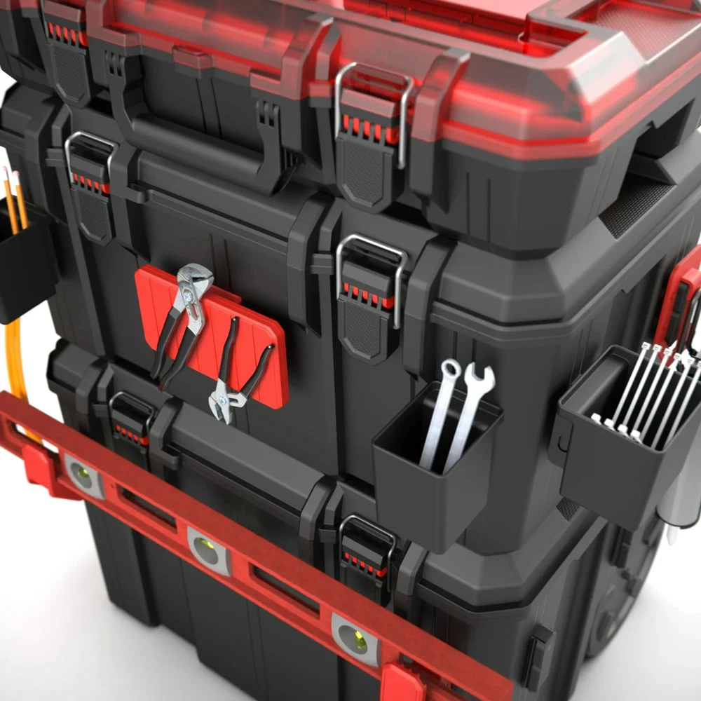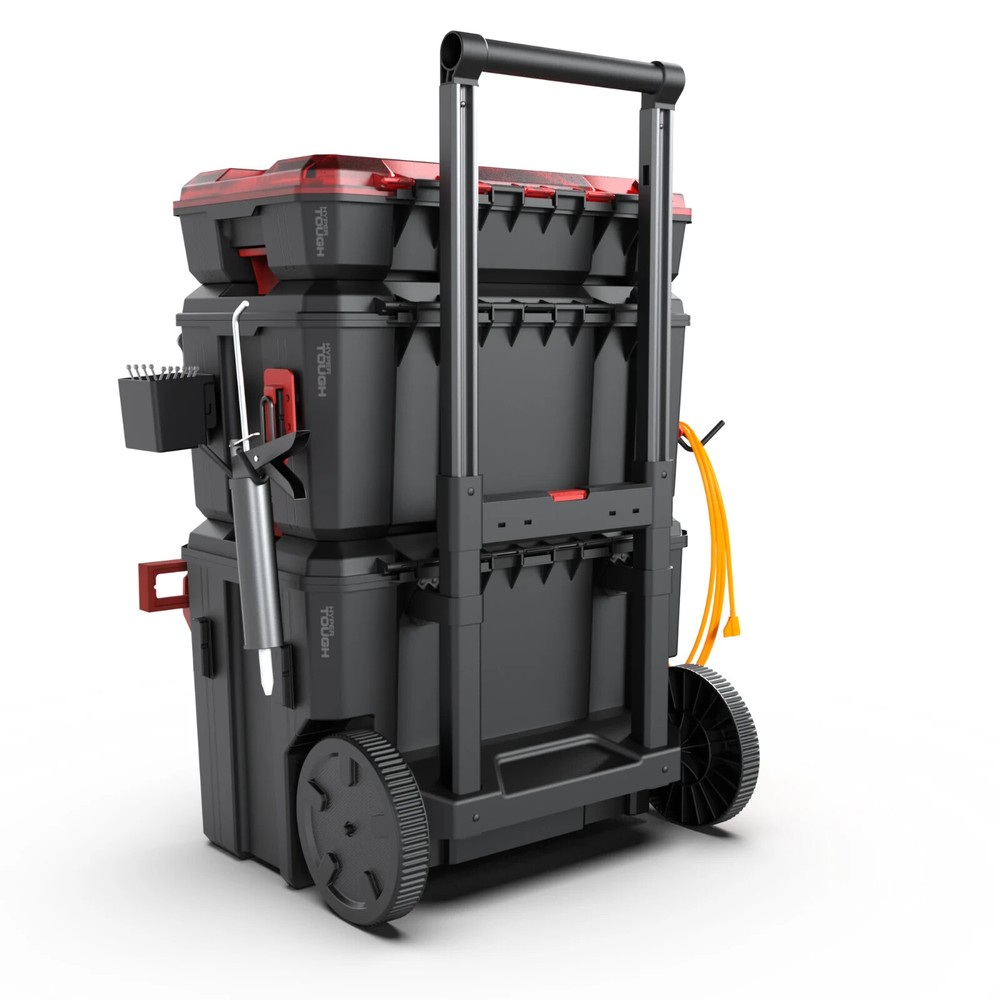 Product details The Hyper Tough Hyper Stack 3-Piece Modular Rolling Toolbox System is built to tackle all your storage and pack out needs. Perfect for pros and hobbyists, it combines strength, versatility, and convenience. This set includes a Top Organizer Box, Large Tool Box, and Rolling Tool Box, all designed to stack and lock securely with a one-touch lock and release mechanism. With an IP65 rating, it protects against dust, water, and debris, making it great for indoor or outdoor use. The rugged polymer construction, metal hinge pins, and heavy-duty latches ensure durability, while the built-in cleat system lets you connect to a range of Hyper Stack accessories for a customized setup. Equipped with a metal telescoping handle and 8-inch all-terrain wheels, it's easy to move wherever you need it. From garages to job sites, this toolbox system delivers reliable storage and mobility for any task. Explore more Hyper Stack storage solutions at Walmart or Walmart.com. Set includes: Top Organizer Box, Large Tool Box, and Rolling Tool Box for storage and pack out needs Weight Capacity: 250 pounds All Terrain Wheels: 8" wheels with quiet roll rubber liner Metal Telescoping Handle: Allows for easy transport and maneuvering Secure Attachment: Easy One Touch lock & release stacking mechanism provides a secure connection between each Hyper Stack box Rugged Latches and Metal Hinge Pins: Provide maximum durability over the life of the system Ruler Feature: Lid features molded-in ruler for added functionality and a quick measure when needed Heavy Duty: Impact-resistant construction IP65 Rated: Superior protection against dust, water, and job site debris Hyper Stack Compatible: Built with easy slide Hyper Stack cleat system that connect with Hyper Stack hook and rail accessories