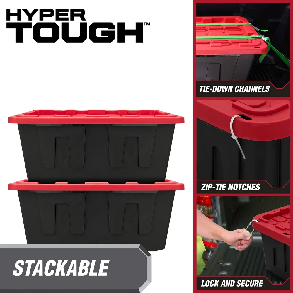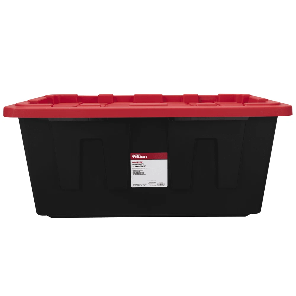 Organize clutter and hide unused items with the Hyper Tough 40 gallon snap-lid plastic storage tote. Made of durable polypropylene, the black storage tote allows you to hide away things you don’t want to be seen while the red snap-lid adds a pop of color to your space. The 2-point snap-lid ensures your items are safely secure during storage or transport. The specially molded lid allow you to stack multiple totes on top to prevent toppling and maximize storage space. Protect your valuable by utilizing the 6 tie-down holes made for zip-ties and padlocks. The long lasting Hyper Tough tote works great in basements, closets, pantries, sheds, barns, and attics. This tote is great for organizing household products, gardening supplies, pet treats and supplies, shoes, clothing, seasonal gear like boots, sporting equipment such as golf balls, tennis balls, or drill cones, and many other items. Sturdy black plastic construction resists rust, dents, stains and peeling to ensure lasting use Stackable lid design creates stability and reduce toppling when multiple storage bins are stacked Snap-Fit Lid lip keeps your content from spilling or falling out Lockable Lid comes with X holes ideal for zip-ties or padlocks to keep your items safe and secure Exterior Dimensions - 38.2 IN WX22 IN DX 16.4 IN H (97 cm x 55.9 cm x 41.6 cm) Easy to clean surface Indoor or Outdoor use Made from recycled materials Reusable Set of 1 – Includes 1 black base and 1 red lid Weight – 9.3 lbs