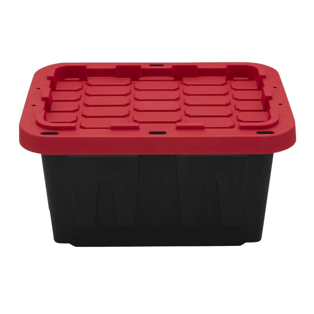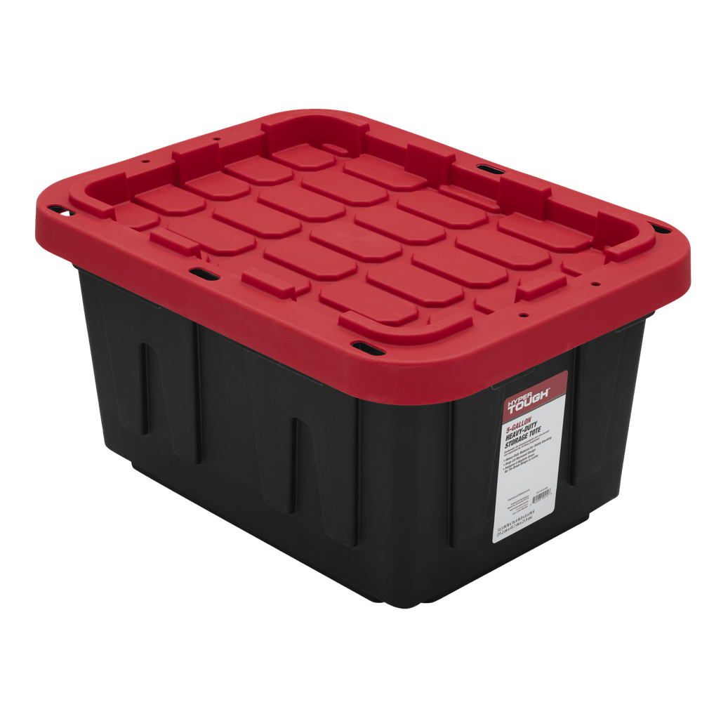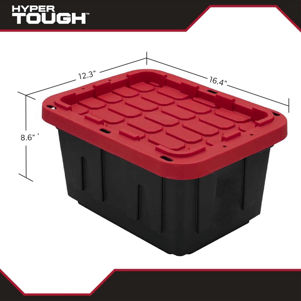 Tough black plastic construction resists rust, dents, stains and peeling to ensure lasting use,Stackable lid design creates stability and reduce toppling when multiple units are stacked,Snap-Fit Lid lip keeps your content from spilling or falling out,Lockable Lid comes with 4 holes ideal for zip-ties or padlocks to keep your items safe and secure,Exterior Dimensions -12.3 IN W x 16.4 IN Dx8.6 IN H,Easy to clean surface,Indoor or Outdoor use, Made from recycled materials,Set of 1 – Includes 1 black base and 1 red lid,Available in multiple sizes: 5 Gallon, 12 Gallon, 17 Gallon, 27 Gallon, 40 Gallons and 50 Gallons Organize clutter and hide unused items with the Hyper Tough 5 gallon snap-lid plastic storage tote. The small size makes it portable while fitting in smaller spots like cars or under cabinets. Made of durable rigid polypropylene, the black storage tote allows you to hide away things you do not want to be seen, while the red snap-lid adds a pop of color to your space. The 2-point snap-lid ensures your items are safely secure during storage or transport, while making it easy to open. The specially recessed lid allow you to stack multiple totes on top of each other to and avoids toppling while maximize storage space. Protect your valuables by utilizing the 4 tie-down holes made for zip-ties and padlocks. The easy to clean material helps keep out pest, dirt, and dust. The long lasting Hyper Tough tote works great in basements, closets, pantries, sheds, barns, and attics. This tote is great for organizing household products, gardening supplies, pet treats and supplies, shoes, clothing, seasonal gear like boots, sporting equipment such as golf balls, tennis balls, or cones, and many other items. About this item Tough black plastic construction resists rust, dents, stains and peeling to ensure lasting use Stackable lid design creates stability and reduce toppling when multiple units are stacked Snap-Fit Lid lip keeps your content from spilling or falling out Lockable Lid comes with 4 holes ideal for zip-ties or padlocks to keep your items safe and secure Exterior Dimensions -12.3 IN W x 16.4 IN Dx8.6 IN H Easy to clean surface Indoor or Outdoor use, Made from recycled materials Set of 1 – Includes 1 black base and 1 red lid Available in multiple sizes: 5 Gallon, 12 Gallon, 17 Gallon, 27 Gallon, 40 Gallons and 50 Gallons On Jun 30, 2025 at 02:01:17 PDT, seller added the following information: