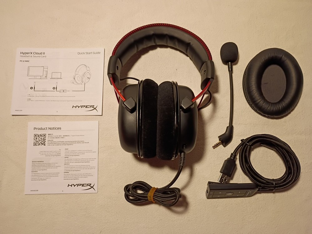 comes with everything down in the pictures including a cloth carrying bag. The HyperX Cloud II Over-Ear Gaming Headset in Black/Red is a high-quality wired headset designed for immersive gaming experiences. With a focus on comfort and sound quality, this headset features double earpieces with noise cancellation and a boom microphone for clear communication. The headband form factor, along with its Bluetooth wireless technology, make it convenient for extended gaming sessions. Backed by a 2-year manufacturer warranty, this HyperX Cloud III model offers reliable performance for gamers looking for a premium audio solution.