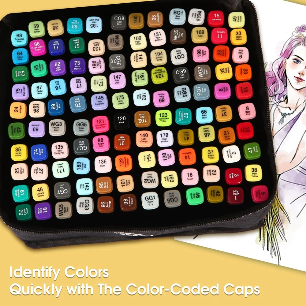 Dual Tip Design Markers: This 120 Colors markers adopted a double-tip design, Broad tip is perfect for quick coverage, fine tip is great for precise details, highlighting, and underlining. Allowing you to write in both thin and thick lines, providing great versatility. Great for use as art markers, sketch markers, permanent markers, alcohol based markers High Quality Alcohol Markers: High quality permanent markers ink, safe, non-toxic, colors to be laid down clean, smooth and evenly, that resists smudging, fading, and doesn’t smudge. This alcohol markers will last through many art projects with high ink volume, also the great cap design that prevents markers from drying out 120 Vibrant Colors: This professional superior artist quality double-ended permanent art markers. Includes all the primary and secondary color shade tones artists need for drawing, sketching,writing, illustrating, shading. Perfect for using on paper, ceramics, glass, wood, cloth and more Color-Coded Caps: The color-coded caps allow for easing in organization and to identify colors quickly. With its ergonomic square-type pen shape, smooth rounded body and comfortable grip, you can use the marker pens for a long time without feeling tired Portable and orderly: Comes with a zipper carrying bag for storing, Make it easy and convenient to portable carry for traveling or outdoor work. and also comes with extra pen holder for neatly arrange the markers