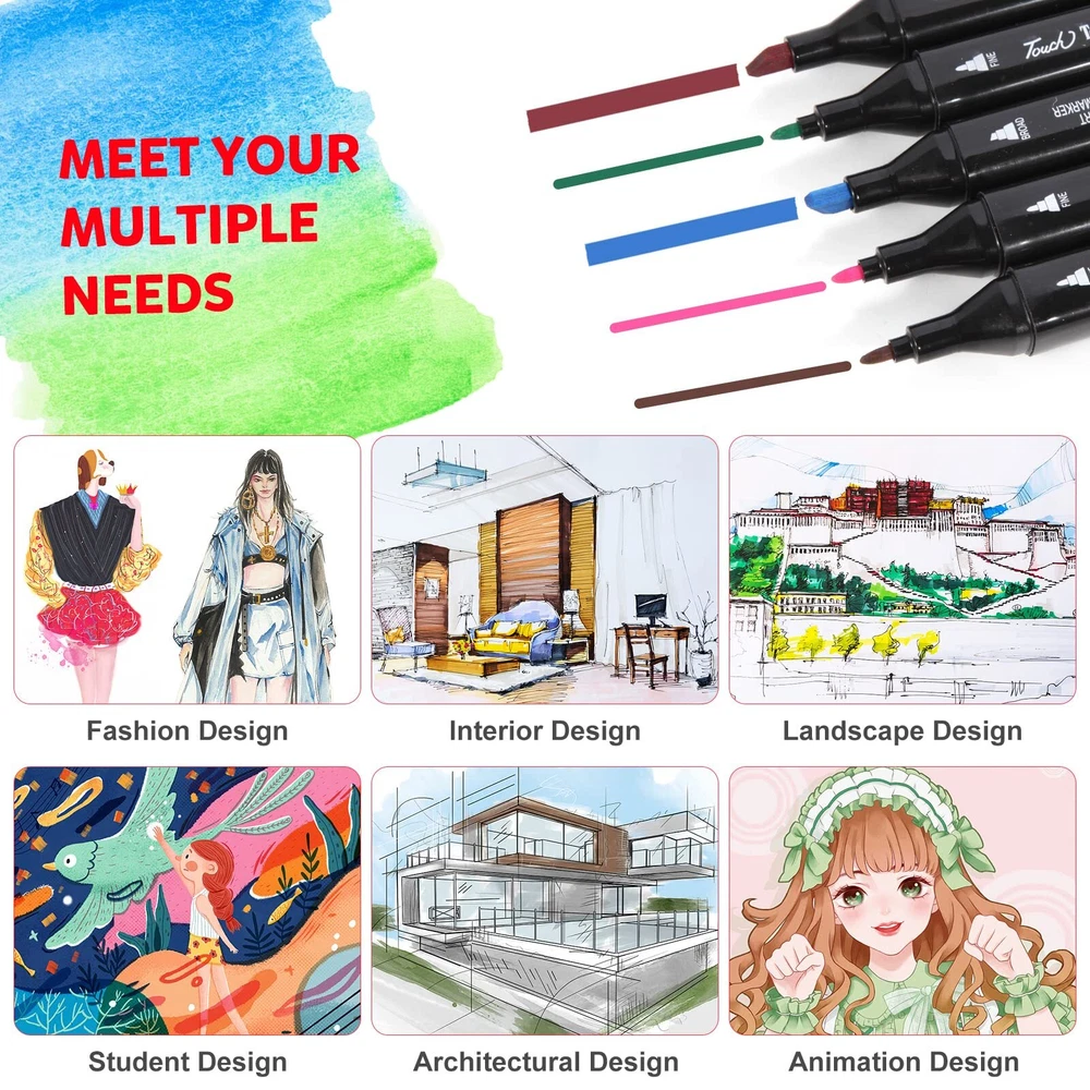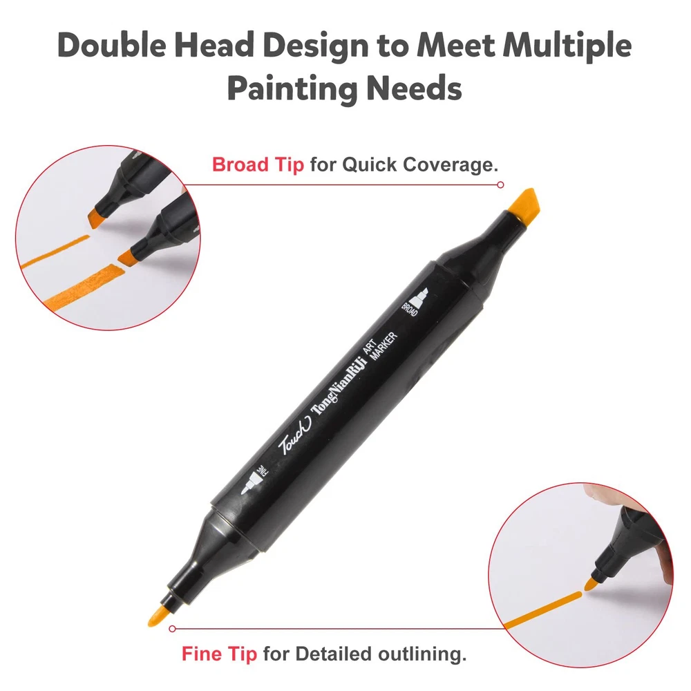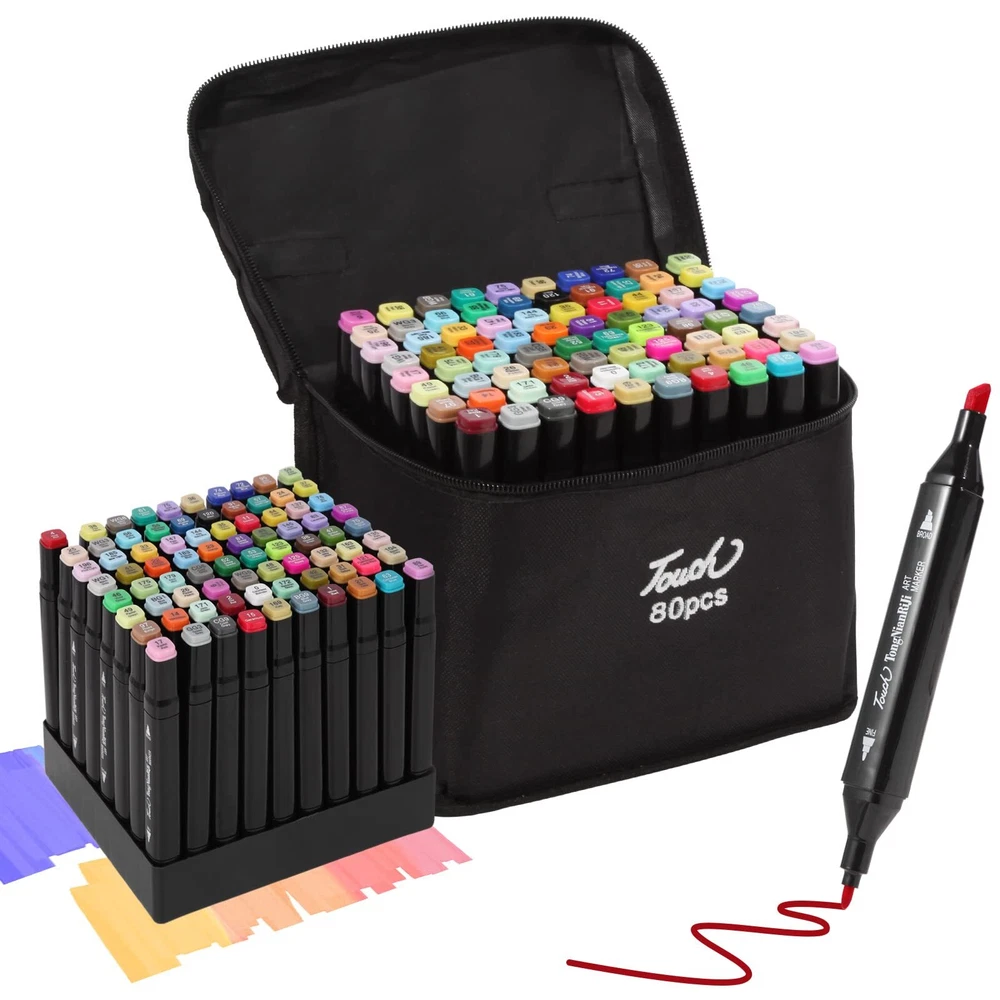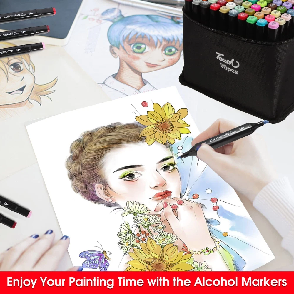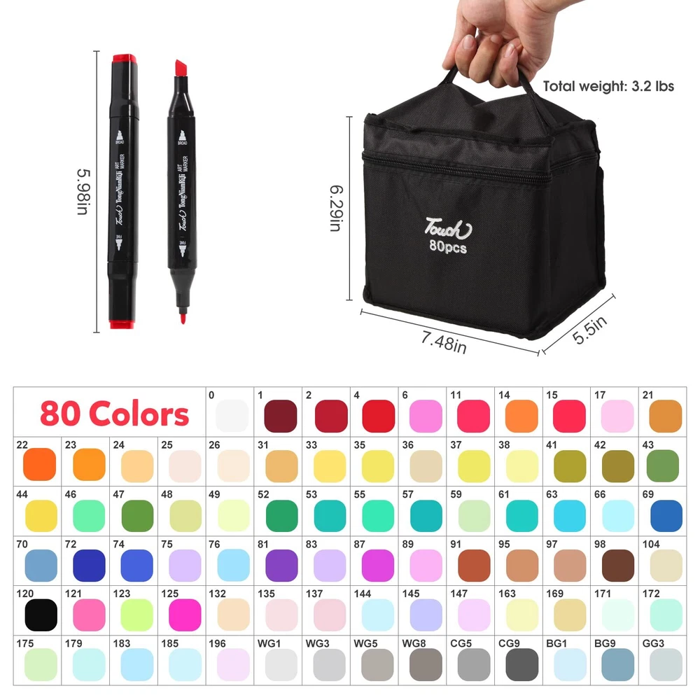 Dual Tip Design Markers: This 80 Colors markers adopted a double-tip design, Broad tip is perfect for quick coverage, fine tip is great for precise details, highlighting, and underlining. Allowing you to write in both thin and thick lines, providing great versatility. Great for use as art markers, sketch markers, permanent markers, alcohol based markers High Quality Alcohol Markers: High quality permanent markers ink, safe, non-toxic, colors to be laid down clean, smooth and evenly, that resists smudging, fading, and doesn’t smudge. This alcohol markers will last through many art projects with high ink volume, also the great cap design that prevents markers from drying out 80 Vibrant Colors: This professional superior artist quality double-ended permanent art markers. Includes all the primary and secondary color shade tones artists need for drawing, sketching,writing, illustrating, shading. Perfect for using on paper, ceramics, glass, wood, cloth and more Color-Coded Caps: The color-coded caps allow for easing in organization and to identify colors quickly. With its ergonomic square-type pen shape, smooth rounded body and comfortable grip, you can use the marker pens for a long time without feeling tired Portable and orderly: Comes with a zipper carrying bag for storing, Make it easy and convenient to portable carry for traveling or outdoor work. and also comes with an extra pen holder for neatly arrange the markers