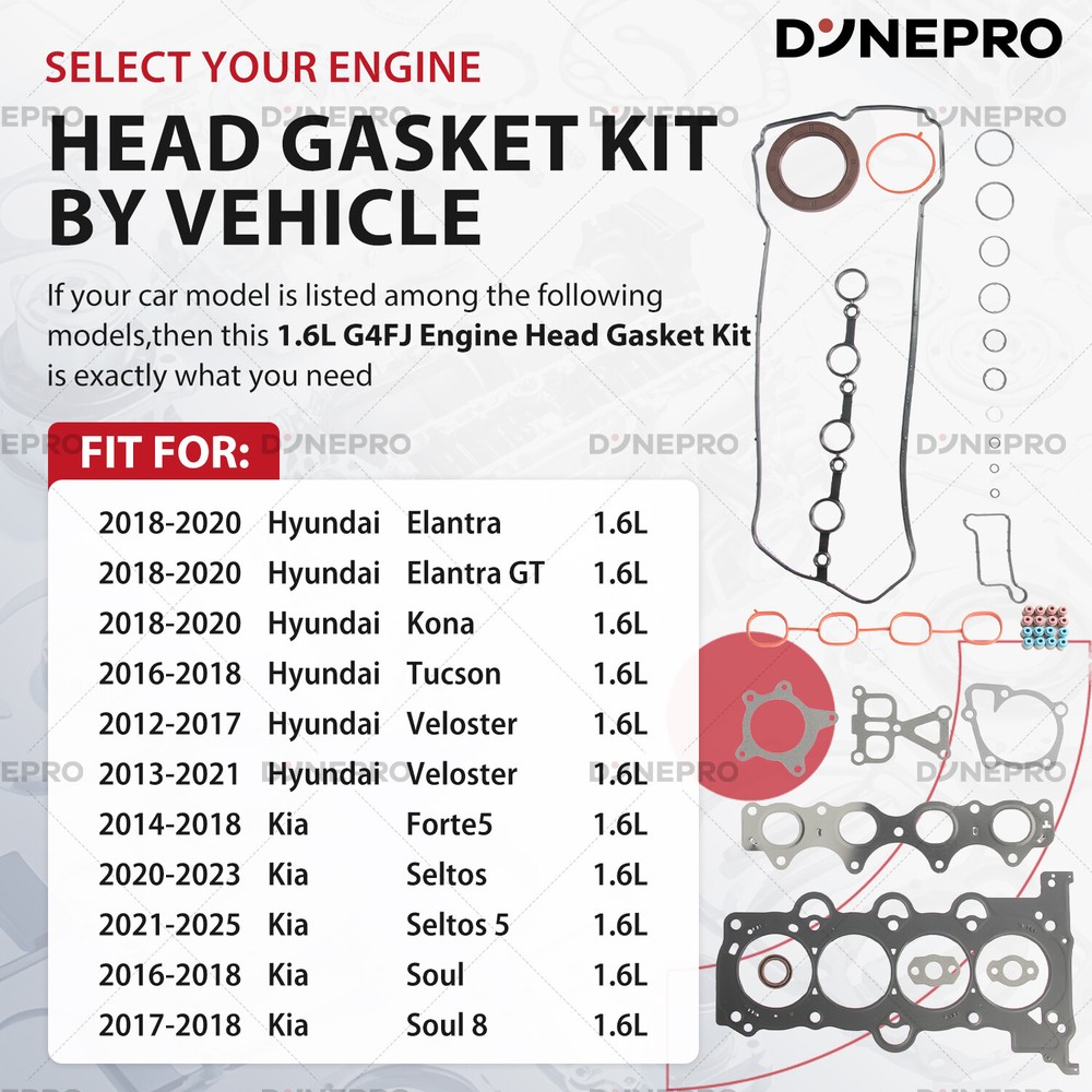 Engines Parts Deals Installation Guide search Services Find us WHERE TO BUY UNITED STATES | ENGLISH WHERE TO BUY Category Other Engine Rebuild Kit ENGINE GASKETS PISTON AND RING KITS VALVE TRAIN COMPONENTS BEARINGS & THRUST WASHERS CYLINDER HEADS CONNECTING RODS TIMING CHAIN KIT CRANKSHAFT Engine Gasket Seals Kit w/ Head Bolts & Valve Set For Hyundai KIA Soul G4FJ 1.6L Dynepro® Pro Series Master Engine Rebuild Kit For Hyundai OEM Spec Certified Engine Repair Kit Precision Engineered · Factory Reliability ⭕ Cylinder Gasket Set Five-layer composite structure: 0.1mm stainless steel liner (resists high-pressure deformation) Aramid fiber sealing layer (withstands 350°C continuous thermal shock) Graphite coating (self-adapting micro-gap filling) Passed 100,000 thermal cycling tests for factory-grade sealing. ⭕ Built For Hyundai Owners: ✔️ Oil sludge cleanup (Theta II/Lambda engine rebuilds) ✔️ Timing chain rattle fixes (Nu/Gamma engines, includes tensioner tool) ✔️ Turbo failure prevention (1.6T/2.0T models, full gasket/seal refresh) ✔️ 200,000km+ overhauls (full bolt kit with factory torque specs) ⭕ For Hyundai TechTrust : ✔️ Restore factory power. Drive with Korean precision. ✔️Order Now – Free OEM Repair Manual Included! Support: Email us (Master Techs on call) ⭕ Why Genuine? ⚠️ Cheap parts fail: Non-genuine pistons crack under GDI’s 150-bar fuel pressure. Knockoff chains stretch, causing valve-piston interference. ✅ for Hyundai spec Certified : 100% material compliance with Hyundai MS-350 durability standards. Direct from OEM Plant spec suppliers. 2-year unlimited-mileage warranty. Vehicle Application Compatible with: G4FJ 1.6L engines. for Hyundai Accent 2012-2018 1.6L GAS Naturally Aspirated for Hyundai Elantra 2017-2020 1.6L GAS Turbocharged for Hyundai Elantra GT 2018-2020 1.6L GAS Turbocharged for Hyundai Kona 2018-2020 1.6L GAS Turbocharged for Hyundai Tucson 2016-2018 1.6L GAS Turbocharged for Hyundai Veloster 2012-2017 1.6L GAS Naturally Aspirated for Hyundai Veloster 2013-2021 1.6L GAS Turbocharged for Kia Forte5 2014-2018 1.6L GAS Turbocharged for Kia Rio 2013-2017 1.6L GAS Naturally Aspirated for Kia Seltos 2020-2023 1.6L GAS Naturally Aspirated for Kia Seltos 2021-2025 1.6L GAS Turbocharged for Kia Soul 2011-2018 1.6L GAS Naturally Aspirated for Kia Soul 2017-2018 1.6L GAS Turbocharged Note: VIN confirmation required. What's included in this complete bundle set -Full Gasket Set Shop Now >> Instant Fitment Email your Hyundai model (e.g., Elantra, Tucson, Santa Fe) and year → Get a repair kit tailored to your VIN. Restore factory power, drive like new. Tech Support: Email us (Provide VIN for tailored parts list) About us FQA Shipping After-Sales Support Contact us DynePro® is a U.S.-based engine repair brand committed to making engine maintenance accessible and efficient. We specialize in high-quality repair kits, supported by leading manufacturers and a skilled team with expertise in automotive data and customer support. Our focus on quality, ease of installation, and expert after-sales service empowers our customers to handle engine repairs with confidence and precision. Choose DynePro for professional-grade solutions that deliver reliability and peace of mind. 1. What products does DynePro offer? DynePro specializes in high-quality engine repair kits and aftermarket parts. Our product range includes essential engine components like connecting rods, valves, camshafts, cylinder heads, engine blocks, pistons, and more. We offer comprehensive engine rebuild kits, performance-enhancing parts, and specialized tools designed to make engine maintenance and repairs easier. 2. Are your engine parts new? Yes. Our parts are guaranteed to be brand new, zero-mile, unused, and crate engine parts. While some parts may occasionally be rebuilt, we ensure all parts meet the highest standards and are in new condition for your engine repairs. 3. How to Find Your Part? To ensure compatibility, simply send us your Vehicle Identification Number (VIN), and our team will reply with the corresponding parts link for your vehicle. You can also find parts by vehicle model through our website’s compatibility feature. 4. Are your products compatible with my vehicle? Our products are designed to fit a wide range of vehicle models, including American, Japanese, Korean and German cars brands. For compatibility, check the product description on our website or contact us with your vehicle's details, and we will guide you to the right parts. 5. Do you offer international shipping? Yes, we offer international shipping to most countries. If you'relocated in a region not supported by our standard shipping options, please contact us directly for a custom shipping quote. 6. What should I do if I receive a damaged or incorrect item? If you receive an item that is damaged or incorrect, please contact us immediately. We will assist you with a return and provide either a full refund or a replacement. For faster processing, please keep all packaging and send us clear photos of the damaged product. 7. Do you provide installation guides and torque specifications? Yes, we provide installation guides for all our products. These guides include step-by-step instructions, as well as the necessary torque data to ensure proper installation. Simply refer to the product page for the downloadable instructions or contact us for assistance. 8. Still have questions? If you have any additional questions, feel free to contact us anytime. Our dedicated team is here to assist you with all your needs! Orders from Chinese Warehouse Once payment is confirmed, we’ll ship from our China warehouse based on the handling time for in-stock items, which generally takes 2-10 business days. Shipments are sent via DHL or UPS, with an estimated delivery time of 3-7 business days. Orders from U.S. Warehouse Orders from our U.S. warehouse will be shipped within one business day after payment is received. If