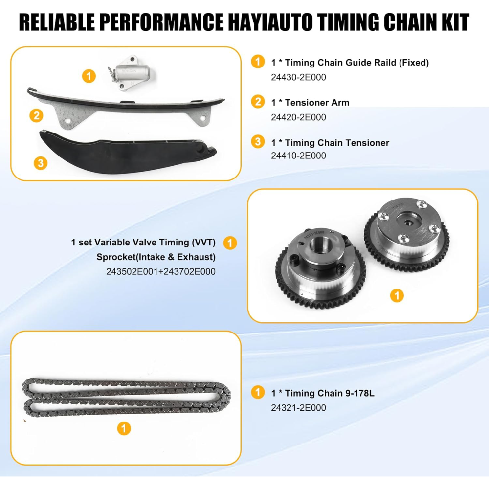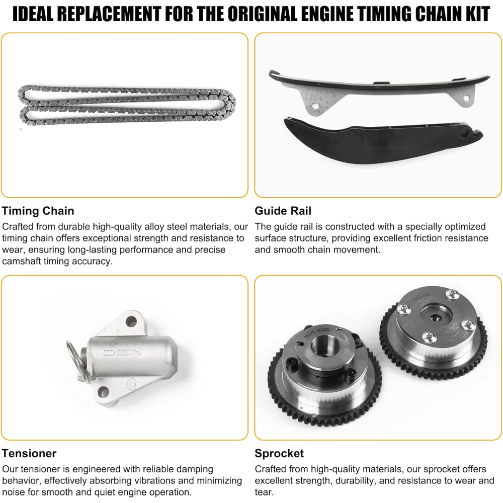 WHY OUR CUSTOMERS KEEP SHOPNG WITH US ✅All items are covered by manufacturer warranty. ✅FAST FREE SHIPPING. ✅Most orders ship within 1 business day with Tracking Number. Customer also can choose two-day or expedited shipping. ✅100% customer satisfaction is backed by a 30-Day Money Back Guarantee for New items and a 30-Day Money Back Guarantee for Recon. FEATURES 1 Manufactured with Precision to Meet OE Standards IATF16949 Certified. 2 High Quality & Brand New 3 Two Year Warranty. 4 After Market Replacement 5 Customers Service Center Will Deal with Pre-sale and After-sale Problems In Time Timing Chain Kit Head Gasket Set with Head Bolts for 11-14 Hyundai Kia 1.8L 2.0L WHY OUR CUSTOMERS KEEP SHOPNG WITH US ✅All items are covered by manufacturer warranty. ✅FAST FREE SHIPPING. ✅Most orders ship within 1 business day with Tracking Number. Customer also can choose two-day or expedited shipping. ✅100% customer satisfaction is backed by a 30-Day Money Back Guarantee for New items and a 30-Day Money Back Guarantee for Recon. FEATURES 1 Manufactured with Precision to Meet OE Standards IATF16949 Certified. 2 High Quality & Brand New 3 Two Year Warranty. 4 After Market Replacement 5 Customers Service Center Will Deal with Pre-sale and After-sale Problems In Time 6 Factory Affordable Price with High Quality Service: Return/ Replace/ Offer Technical Support. FITMENTS 2011-13 HYUNDAI ELANTRA 1.8L 1797CC L4 GAS,Engine: NU 2014 HYUNDAI ELANTRA SE 1.8L L4 GAS,Engine: NU 2011-14 HYUNDAI ELANTRA LIMITED 1.8L L4 GAS,Engine: NU 2011-14 HYUNDAI ELANTRA GLS 1.8L L4 GAS,Engine: NU 2013-14 HYUNDAI ELANTRA GT 1.8L L4 GAS,Engine: NU 2013 HYUNDAI ELANTRA CPUPE GS/ES/BASE 1.8L L4 GAS,Engine: NU 2012-13 KIA SOUL 2.0L 1999CC 122CU. IN. L4 GAS,Engine: NU OEM NUMBER 24420-2E000, 24430-2E000, 243212E000, 244102E000, 244202E000 ITEM INCLUDES Engine Cylinder Head Gasket Set with Head Bolts1 CHAIN 9-178L 1 TENSIONER 1 GUIDE LEFT 1 GUIDE RIGHT 1 CVVT Intake Camshaft Gear Sprocket 1 CVVT Exhaust Camshaft Gear Sprocket FREE RETURN If you are unhappy with your purchase for any reason, you can return it to us in an un-used condition in the original packaging within 30 days of purchase and we'll give you a refund or exchange. The refund/Exchange will not include postage/eBay costs. Please note you MUST contact us to obtain a Return Authorization Number before returning any part. Any parcel without the Return Authorization Number will be rejected *If your item is faulty or was incorrect, you must contact our sales representative before returning the parcel and we will endeavour to solve the problem effectively. Video or picture is required to show the item 、condition before we issue the Return Authorization Number. * Professional installation is highly recommended (No Instruction Included) * For any needs please contact us Item Specifics Brand : susucar Type : Timing Chain Kit Head Gasket Kit OE/OEM Part Number : 22311-2E000 22311-2E080 HS26561PT CS26561 ES72486 Interchange Part Number : ES72486 HBHY23 HSHY23 CPW13795 Superseded Part Number : HGB193 223112E000 223112E080 Other Part Number : 24420-2E000, 24430-2E000, 243212E000, 244102E000, 244202E000 Compatible Makes : Hyundai Kia Compatible Model : Elantra GT Forte Soul Forte5 Tucson Coupe Koup Compatible Years : 2011-2014 Compatible Engine : 1.8L 2.0L L4 Items Included : Head Gasket Set, Head Bolt,Timing Chain Kit,VVT Gears Material : Multiple Layers Steel (MLS) Head Gasket Fitment Type : Direct Replacement OE Spec or Performance/Custom : OE Spec About My Store : 100% SATISFACTION, 100% Source manufacturer Manufacturer : SUSUCARpartsWhosale Note : Please contact us to confirm the application before Purchase Manufacturer Warranty : 2 Years Why choose US? Susucar is passionate about maintaining our culture of demonstrating value and building personal client relationships in perfecting the client experience. We are also a culture of giving back to the community and preserving our precious planet - a passion that runs deep throughout our Company. Every single item we sell goes through thorough inspection processes to make sure it works perfectly for you. If for any reason you are not satisfied with our product, please shoot us a message. We will do everything in our power to make things right Returns and Exchanges Hassle Free Returns! All our new and refurbished products come with a 30-Day Free Return Policy. If you would like to return your item and you are within 30 days of the purchase, and it is still in its original condition, you can request a return label and return the item by contacting us through eBay messaging. We offer Free Returns in the USA and will provide you with a prepaid return label. Once the item has been received and verified, a refund of the purchase price and any taxes paid will be issued. Shipping & Payment Policy Ground Shipping is always Free within the US (48 contiguous states)! Once payment is received, your order will be processed and shipped the same or next business day. A tracking number will be provided on all orders. Please note that we can only ship to addresses verified with PayPal. We may contact you for additional verification if needed. We cannot ship to APO or FPO addresses, and orders to Puerto Rico, Hawaii, and Alaska will incur additional shipping charges. For your safety and convenience, we process all payments through PayPal where all major Credit Cards are accepted (Amex, Visa, MasterCard, Discover, etc.). We unfortunately cannot accept payments from accounts located outside of the US and Canada. For "Buy It Now" listings, your PayPal payment is due at the time of checkout. For auction style listings, your PayPal payment is due within 48 hours after the end of the auction. Warranty Free 2-Year Warranty included on all our new and refurbished products. We proudly stand behind the quality of our products FAQ Nature of our Products: We sell a variety of products - from "Brand New" in original box to, "Like New" or "Refurbi