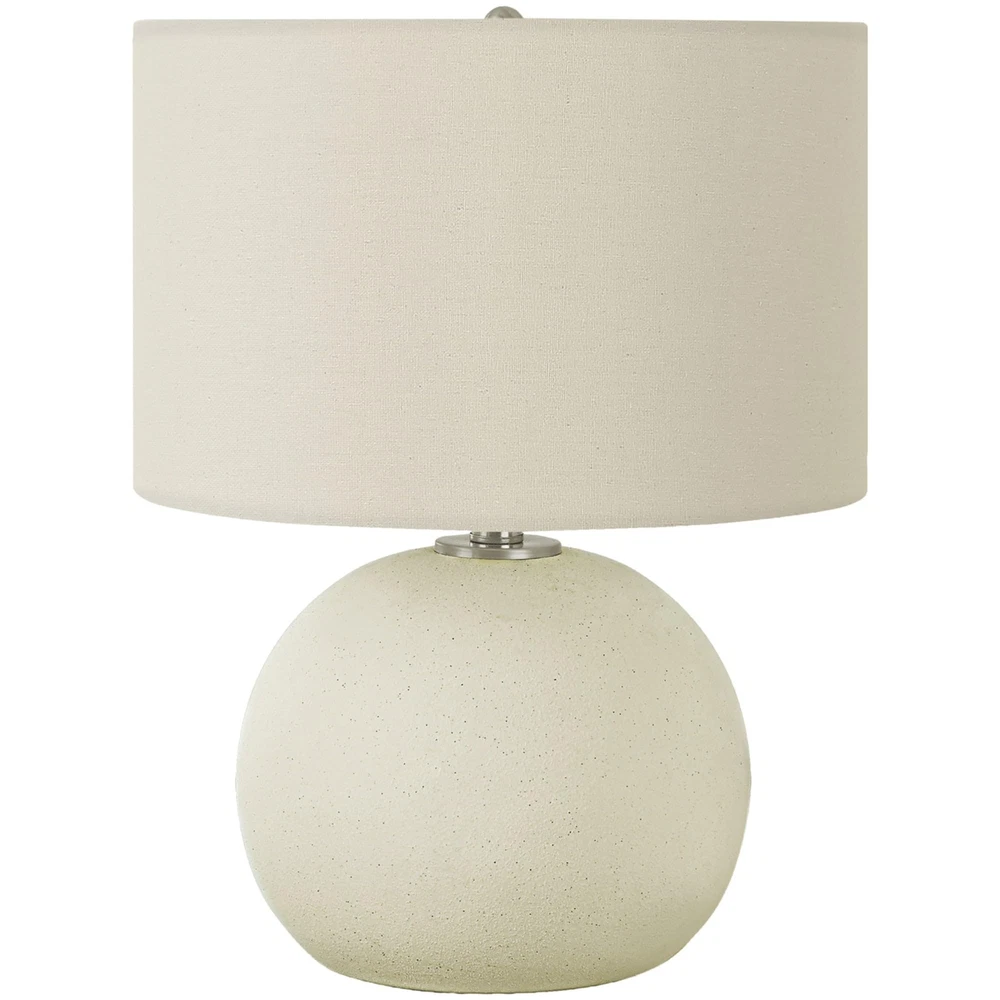 This stylish and fashionable 18"h table lamp with a textured, cream ceramic globe-shaped base and matching ivory fabric drum shade, finished with a round silver finial on top, is the perfect accent to brighten any room. Featuring a 3-way switch holding a single bulb (not included) with a maximum output of 100W/120V, allows you to customize the lighting ambiance in your living room, home office, or bedroom. With a contemporary appeal, place this versatile decorative lamp on a side or end table, on a console, or on your nightstand to create a warm and inviting atmosphere. Made with durable quality materials ensuring longevity, this lamp includes a 2 year limited against any manufacturer s defects for a worry-free purchase. Brighten up your living room, home office, or bedroom with this chic globe shaped 18"h table lamp, with a textured cream ceramic base and topped with an ivory fabric drum shade for a contemporary appeal. The easy to use 3-way rotary switch holds a single bulb (not included) with a maximum output of 100W/120V to adjust the lighting ambiance and instantly illuminate or dim a room. Attached with a 6ft transparent cord, place this versatile accent lamp on any end or side table, console, nightstand or bedside table for a practical lighting source. Minor assembly is required with illustrated instructions included; made with durable materials and backed with 2-year limited against manufacturer s defects for your satisfaction. Assembled dimensions: 14 in. L x 14 in. W x 18.25 in. H; base: 10 in. L x 10 in. W x 8 in. H; shade: 14 in. L x 14 in. H x 9 in. H
