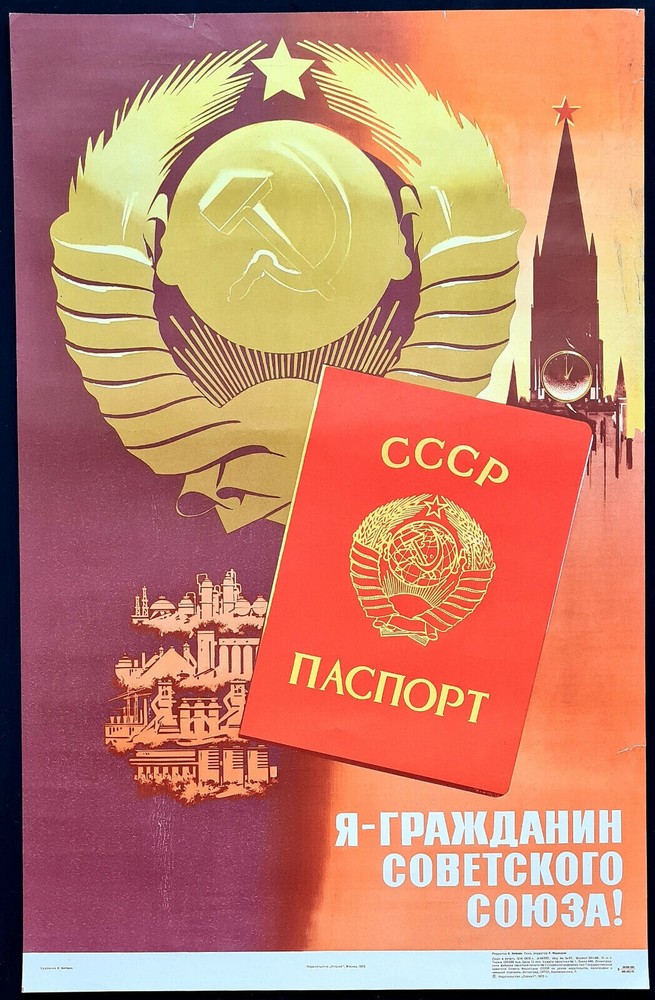 Original slogan on the poster: Я - ГРАЖДАНИН СОВЕТСКОГО СОЮЗА! ПАСПОРТ СССР Literally English translation: I AM THE CITIZEN OF THE SOVIET UNION! USSR PASSPORT POSTER ARTIST: VIKTOROV VALENTIN PETROVICH PRINT YEAR: 1975 SUBJECT: TEACHERS HOLIDAY LANGUAGE: RUSSIAN PRINT RUN: 250.000 PUBLISHED BY: "PLAKAT", MOSCOW SIZE: IN: 22 ½ x 35= CM: 57 x 89 CONDITION: FLAT, VERY GOOD ✯ Description & Historical Background — — — — — — — — — — — — — — — — — — — — — — — — — — This 1975 Soviet poster proudly proclaims: "I am a citizen of the Soviet Union!" Centered on the striking image of a red USSR passport, the composition symbolizes civic identity, pride, and unity under socialism. The large state emblem of the USSR rises in the background like a sun, flanked by iconic landmarks of Moscow and illustrations representing the various Soviet republics. The emphasis on citizenship reflects the significance of being part of a vast multinational union, with shared rights, responsibilities, and a common ideological purpose. The poster was issued during the Brezhnev era, a time of strong emphasis on patriotic education and allegiance to the ideals of the Soviet state. ✯ Style — — — — — — — — — — — — — — — — — — — — — — — — — — Rendered in a vivid red-gold color palette, this poster showcases classic Socialist Realist design, emphasizing monumental symbols like the Soviet emblem and Kremlin tower. The passport is prominently placed, using photorealistic design to contrast with the stylized background of industry and unity. The combination of clean typography and symbolic imagery reflects mid-1970s Soviet aesthetics focused on civic pride and state loyalty. ✯ Condition — — — — — — — — — — — — — — — — — — — — — — — — — — Very good vintage condition with some light edge wear and a small crease on the lower right corner. Colors remain vibrant, and the artwork is well-preserved. Please refer to the image for a full visual assessment.