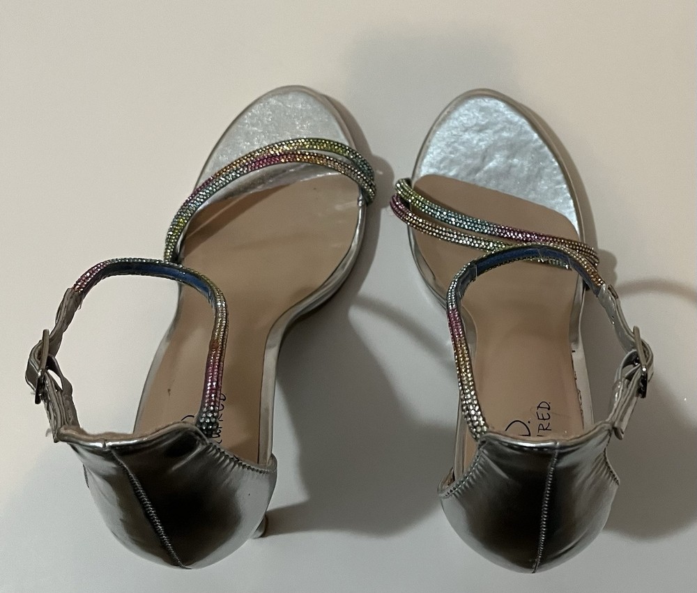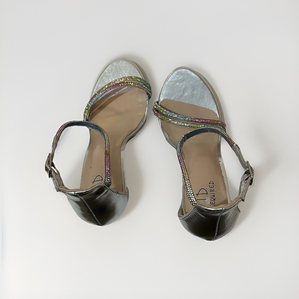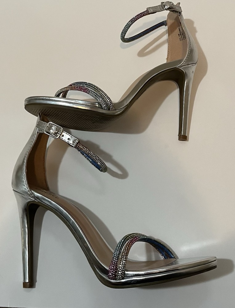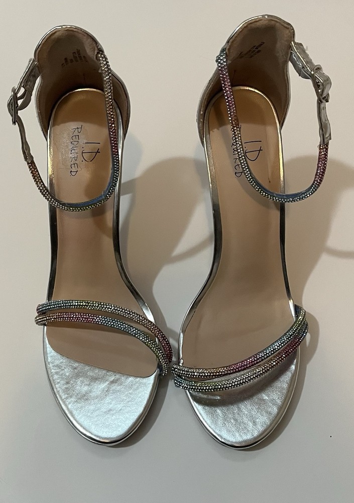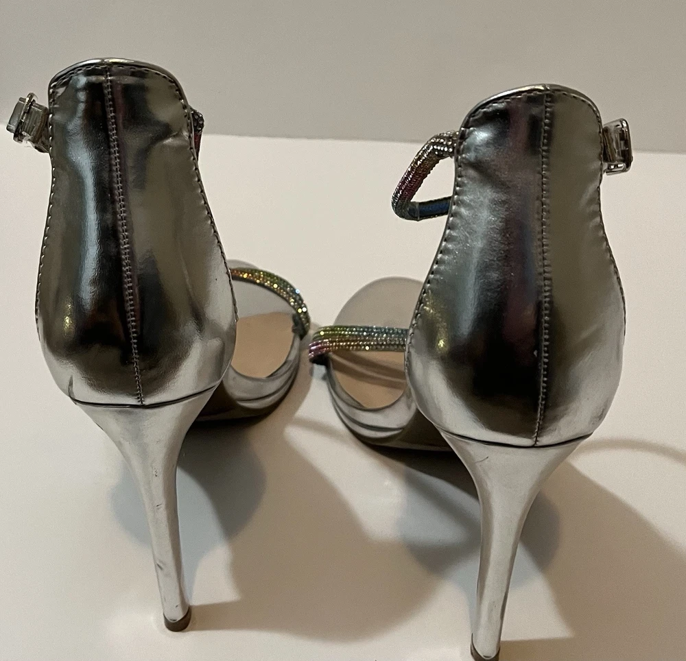 Elevate your style with these stunning silver heels from I D Required. These strappy sandals feature a glitter accents and an ultra-high stiletto heel. The open-toe design and buckle closure add a touch of sophistication to any outfit, while the synthetic upper material ensures durability and comfort. Perfect for any party or special occasion, these heels are available in size 10 and are sure to turn heads. The metal theme and rainbow glitter details make these shoes a unique and eye-catching addition to any wardrobe. Excellent condition Same day shipping or next business day. Smoke free home